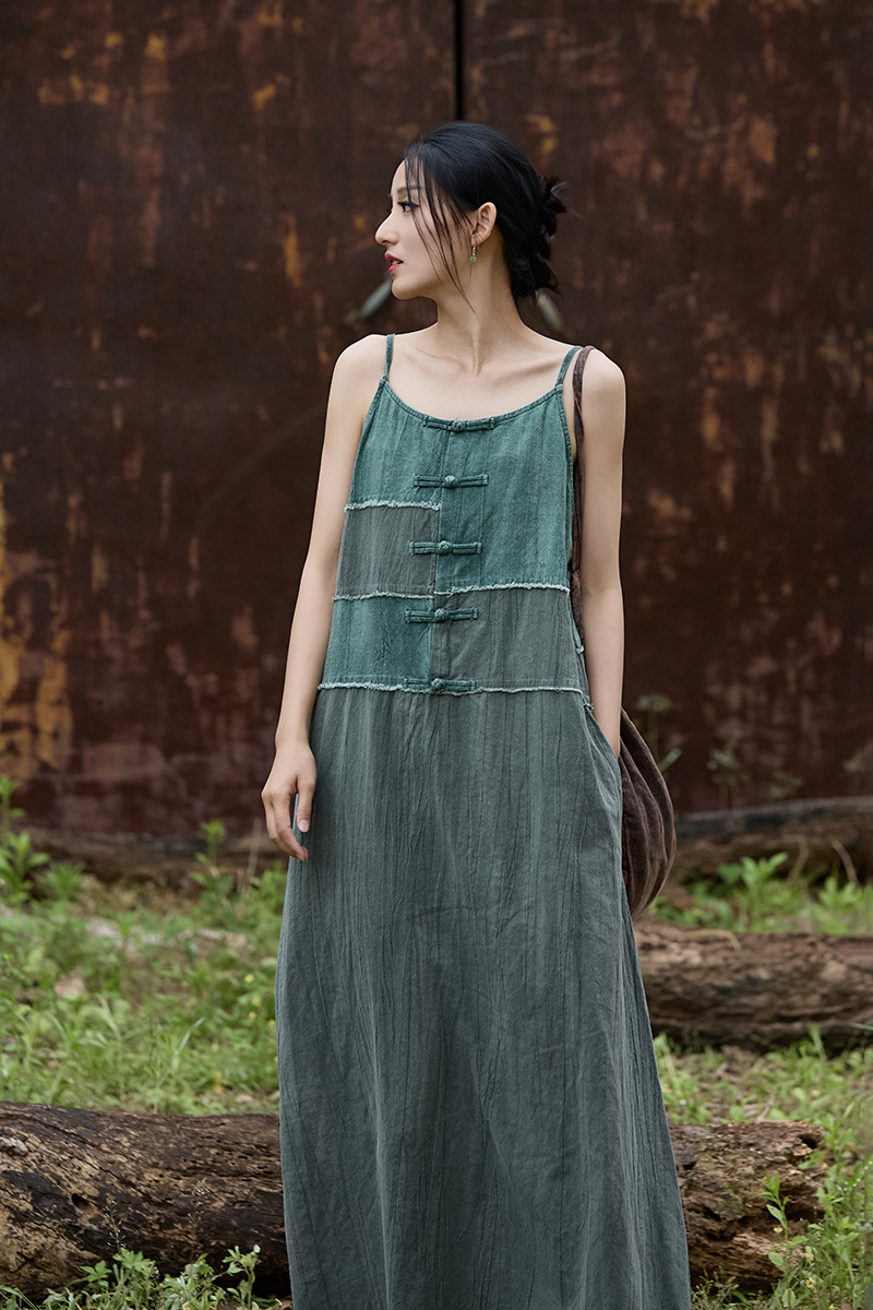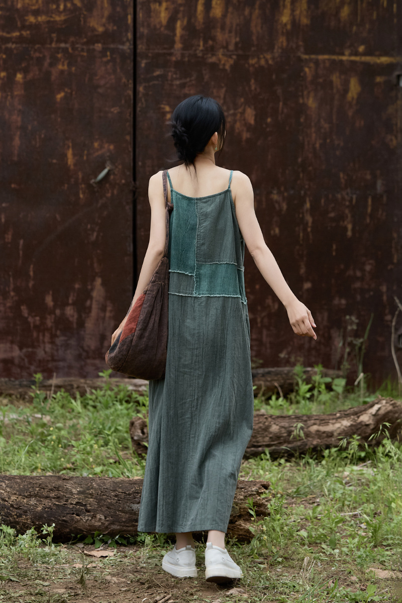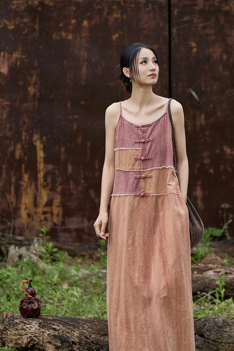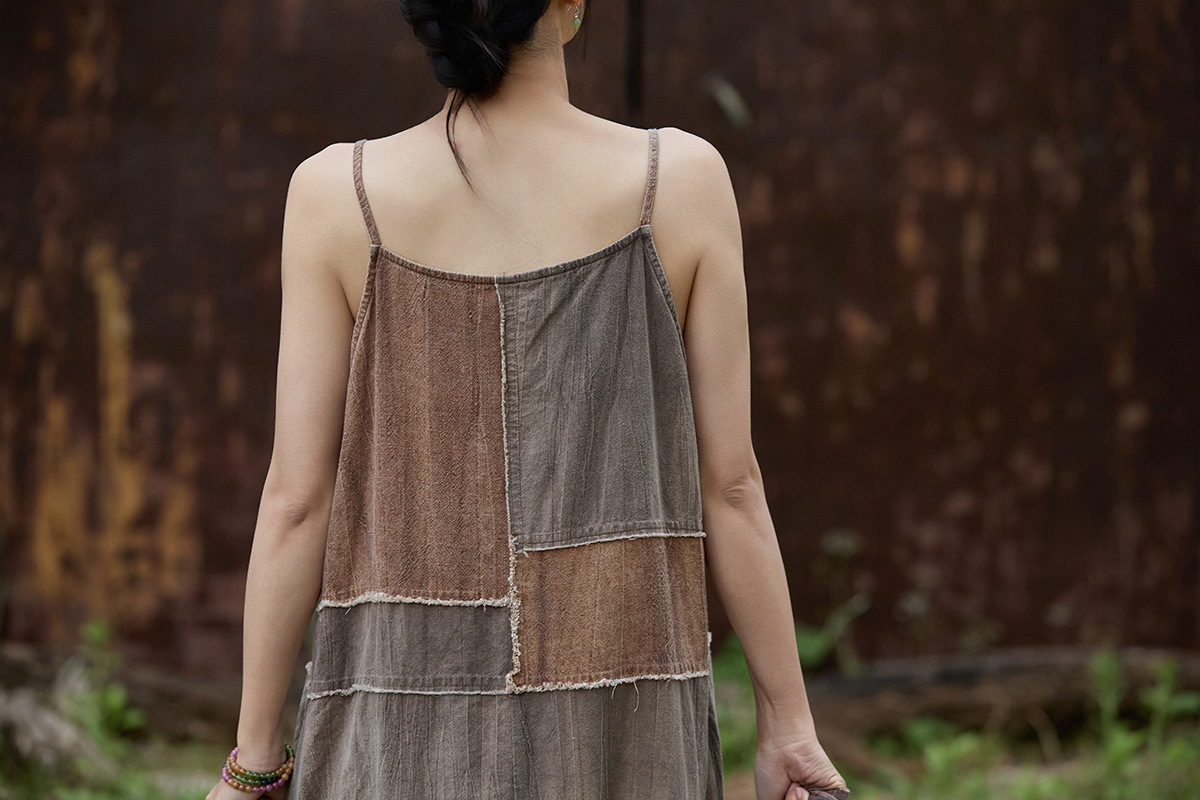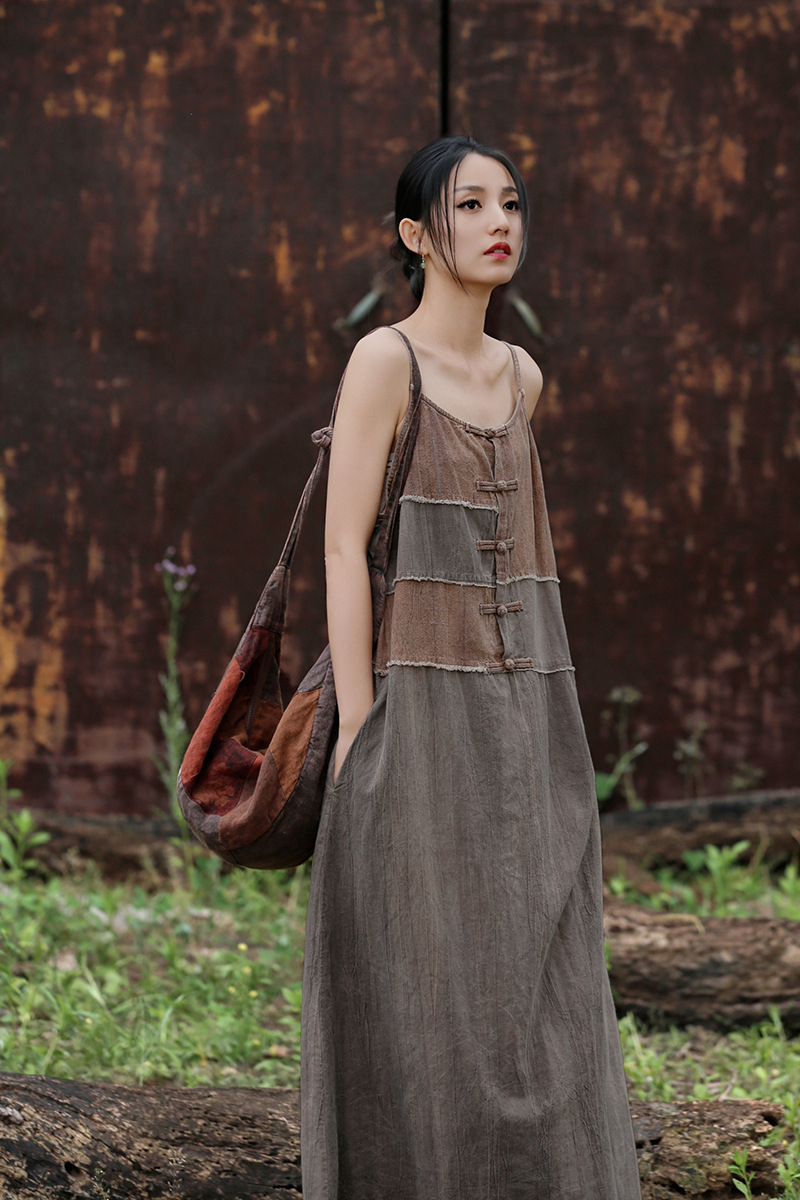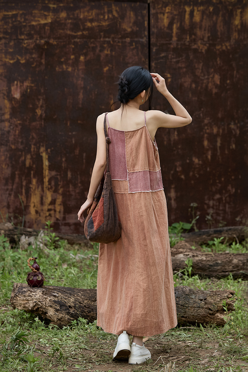 26 봄 여성복 린넨과 모시 소재의 패치워크 타이다이 롱 드레스, 오리지널 디자이너 스타일, 풍성하고 시원한 여성용 멜빵 원피스