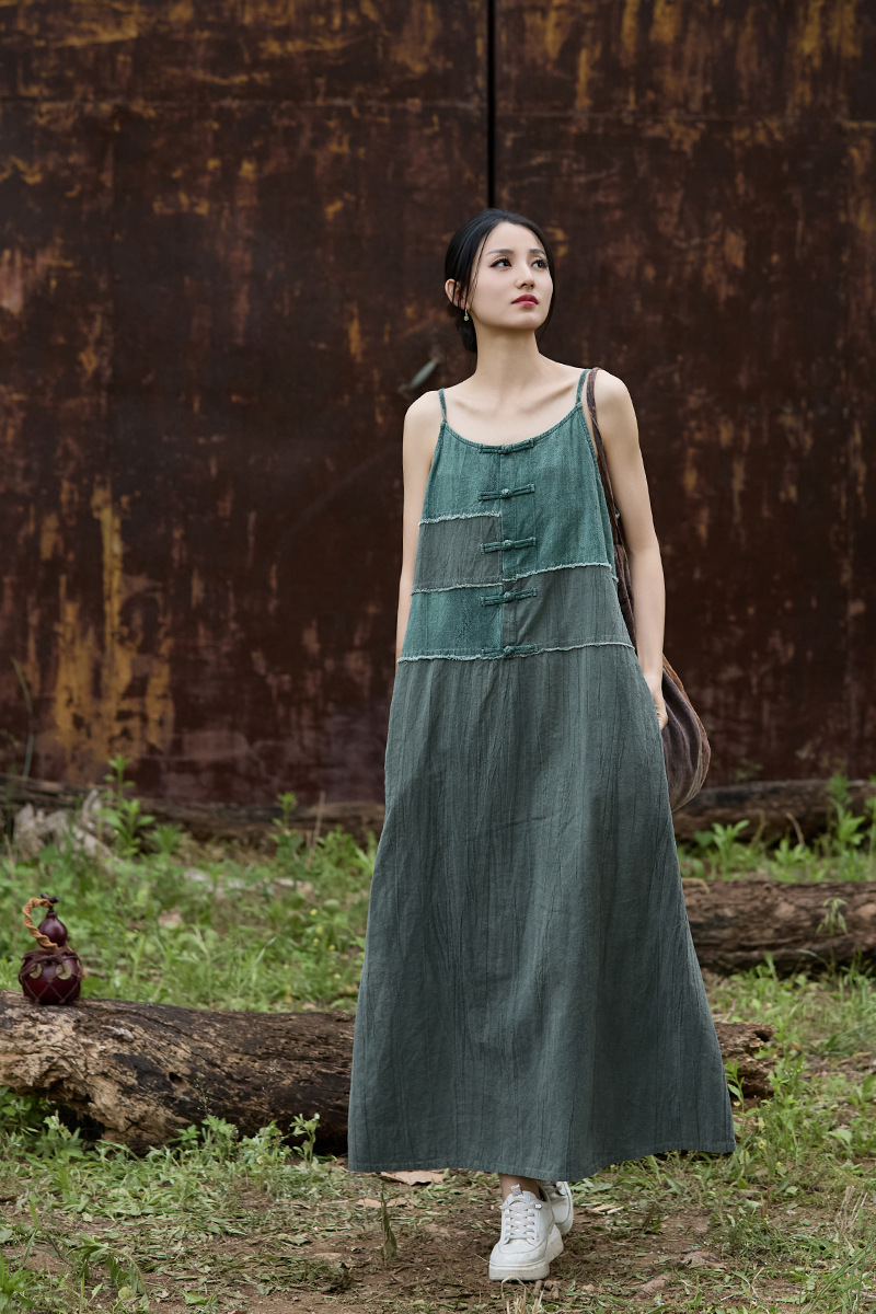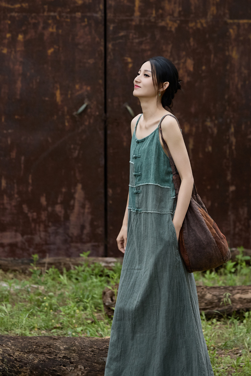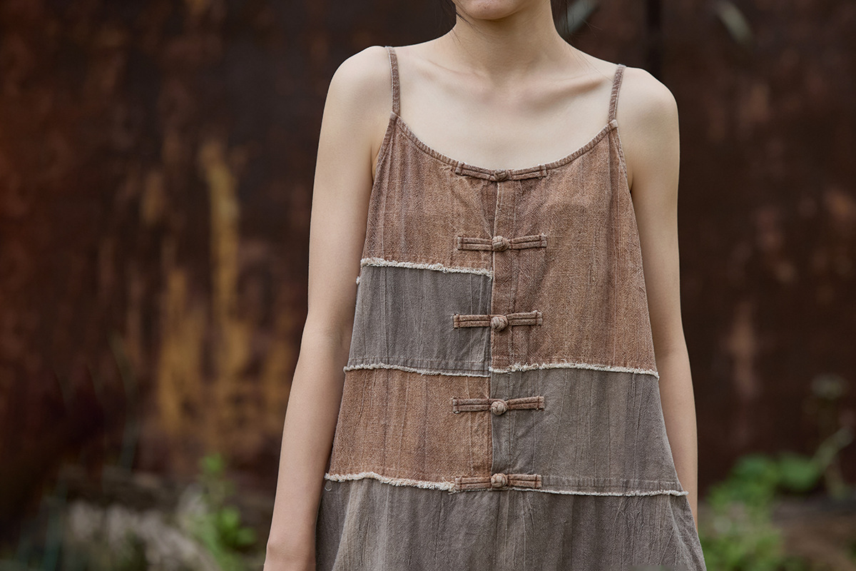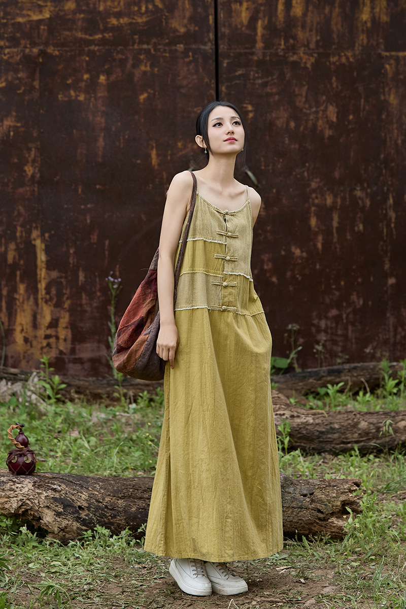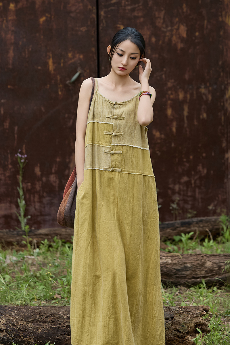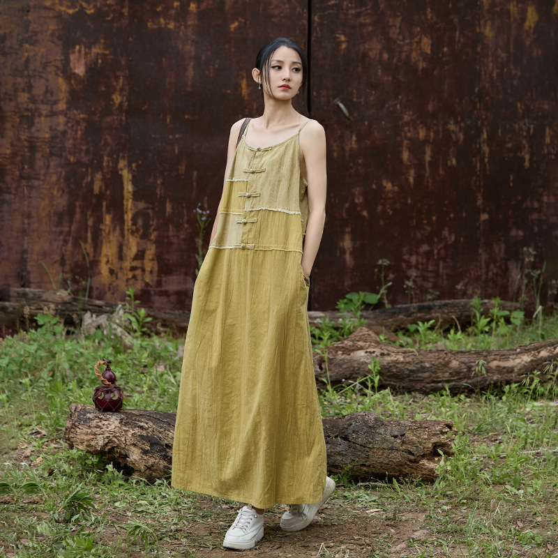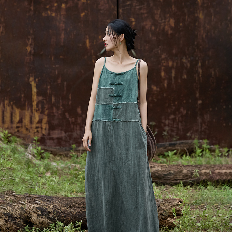 26 봄 여성복 린넨과 모시 소재의 패치워크 타이다이 롱 드레스, 오리지널 디자이너 스타일, 풍성하고 시원한 여성용 멜빵 원피스