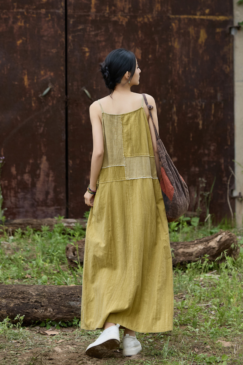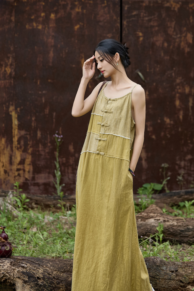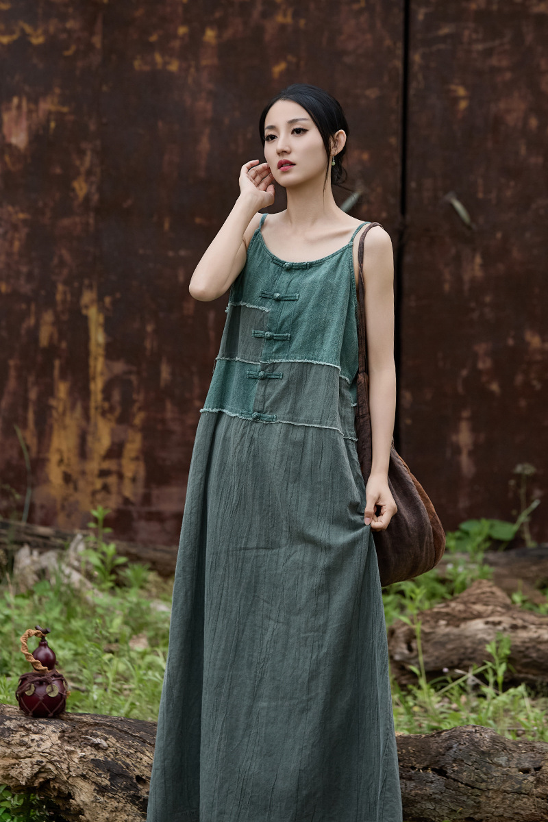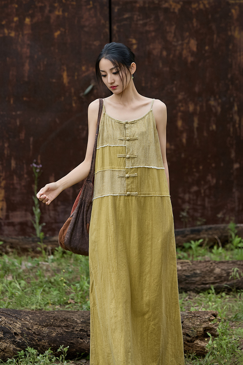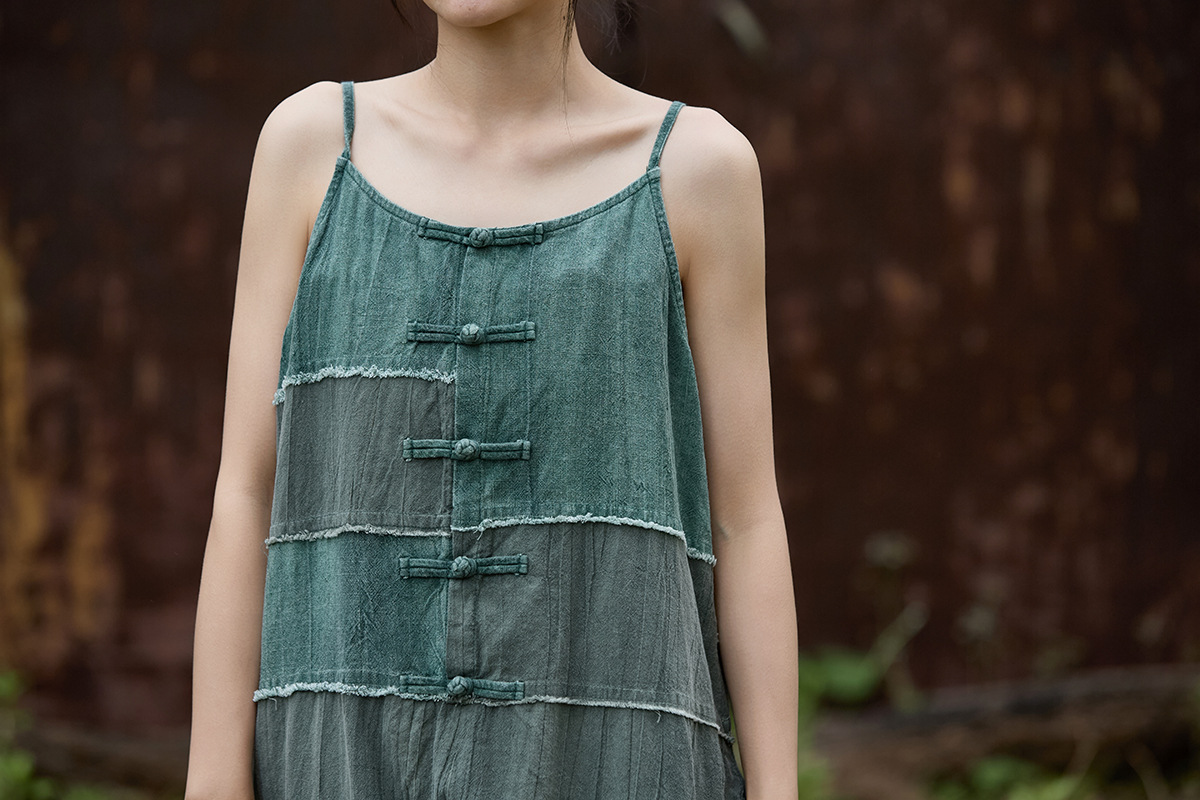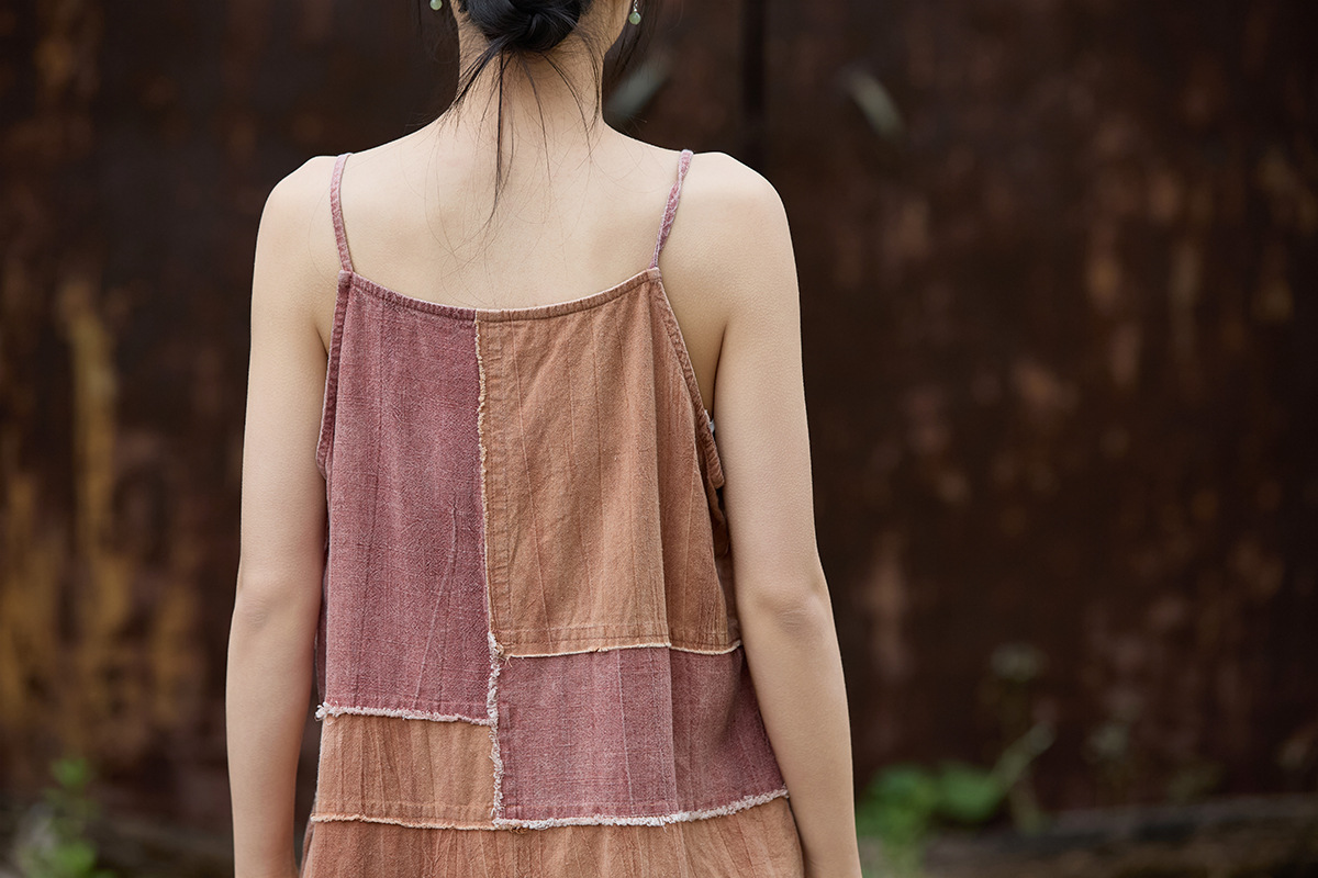 26 봄 여성복 린넨과 모시 소재의 패치워크 타이다이 롱 드레스, 오리지널 디자이너 스타일, 풍성하고 시원한 여성용 멜빵 원피스