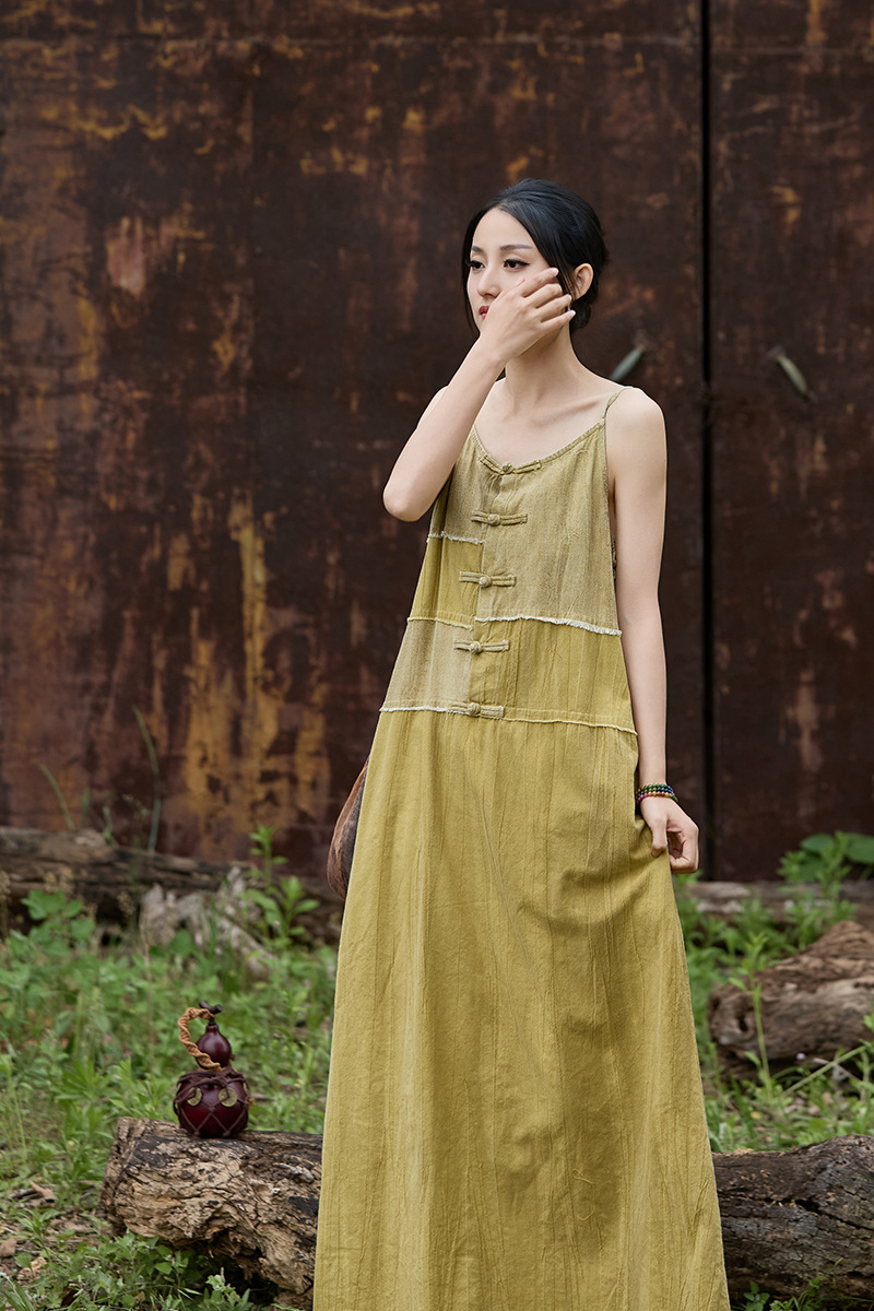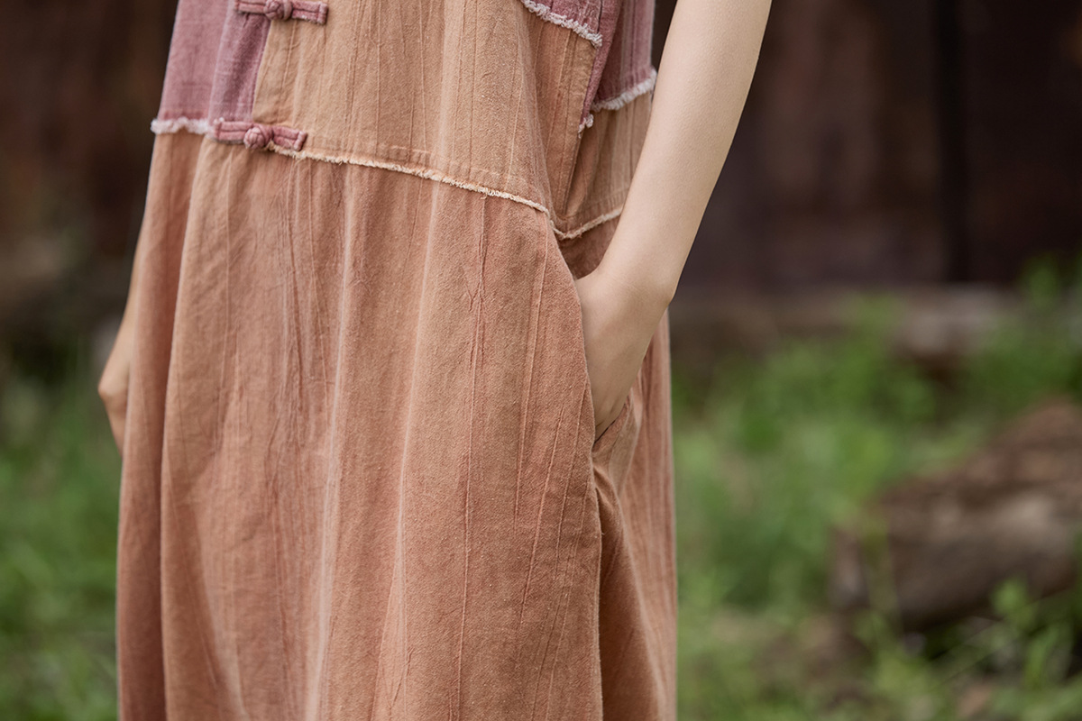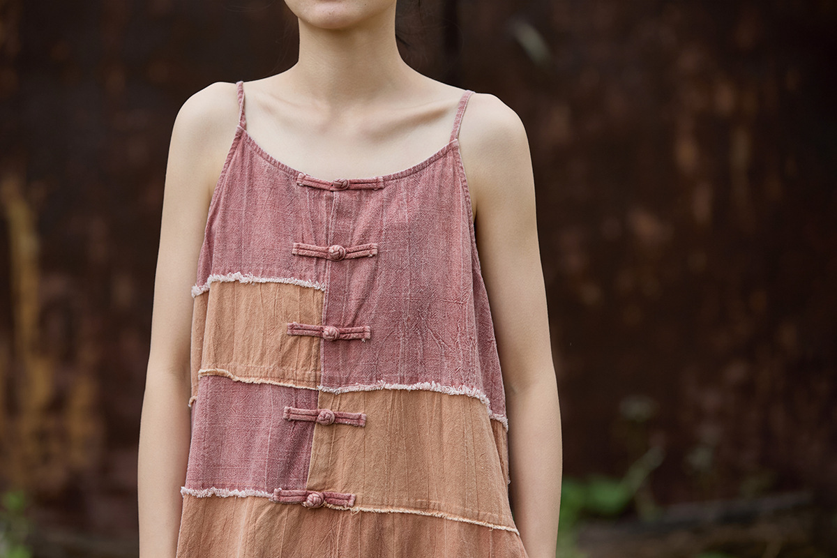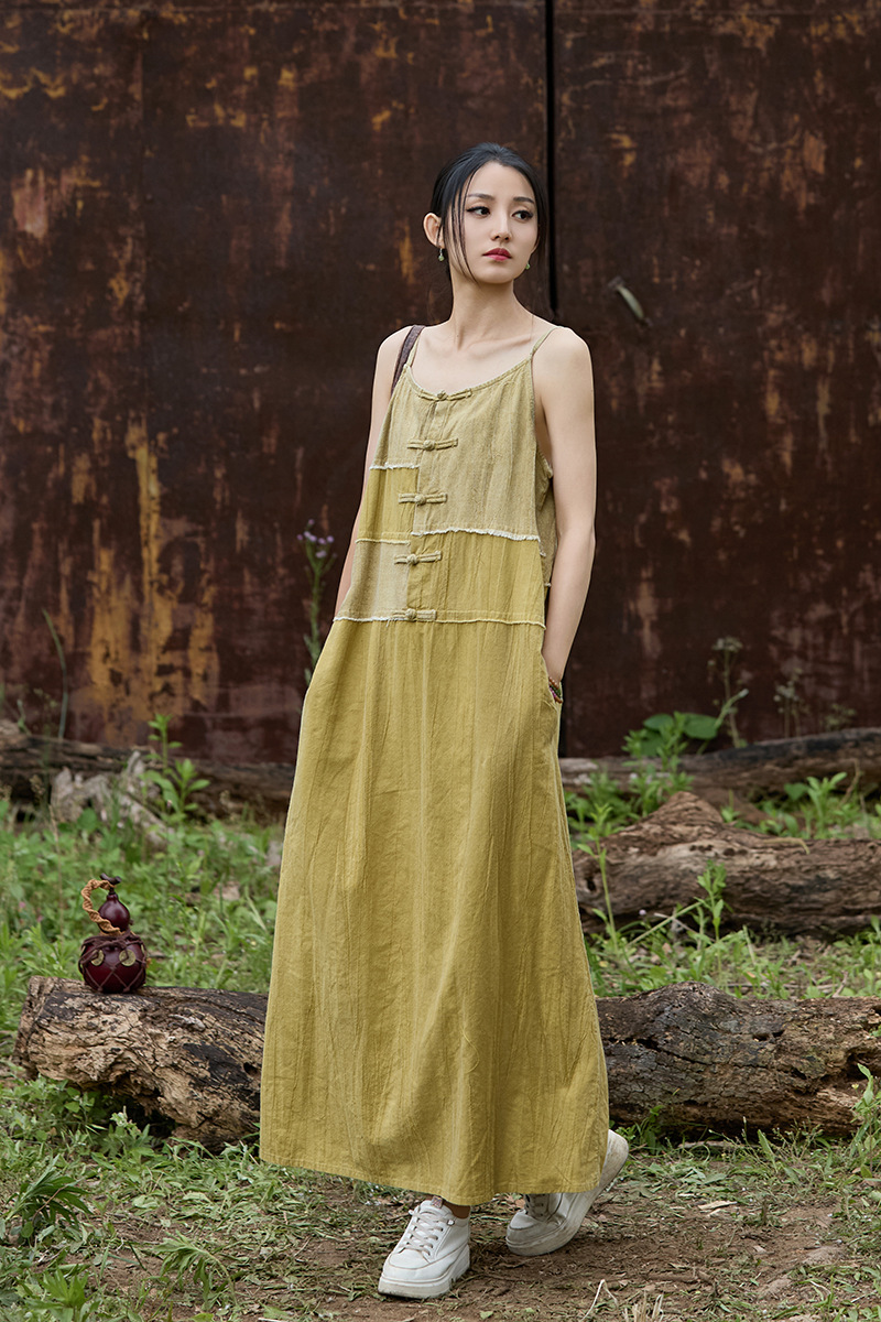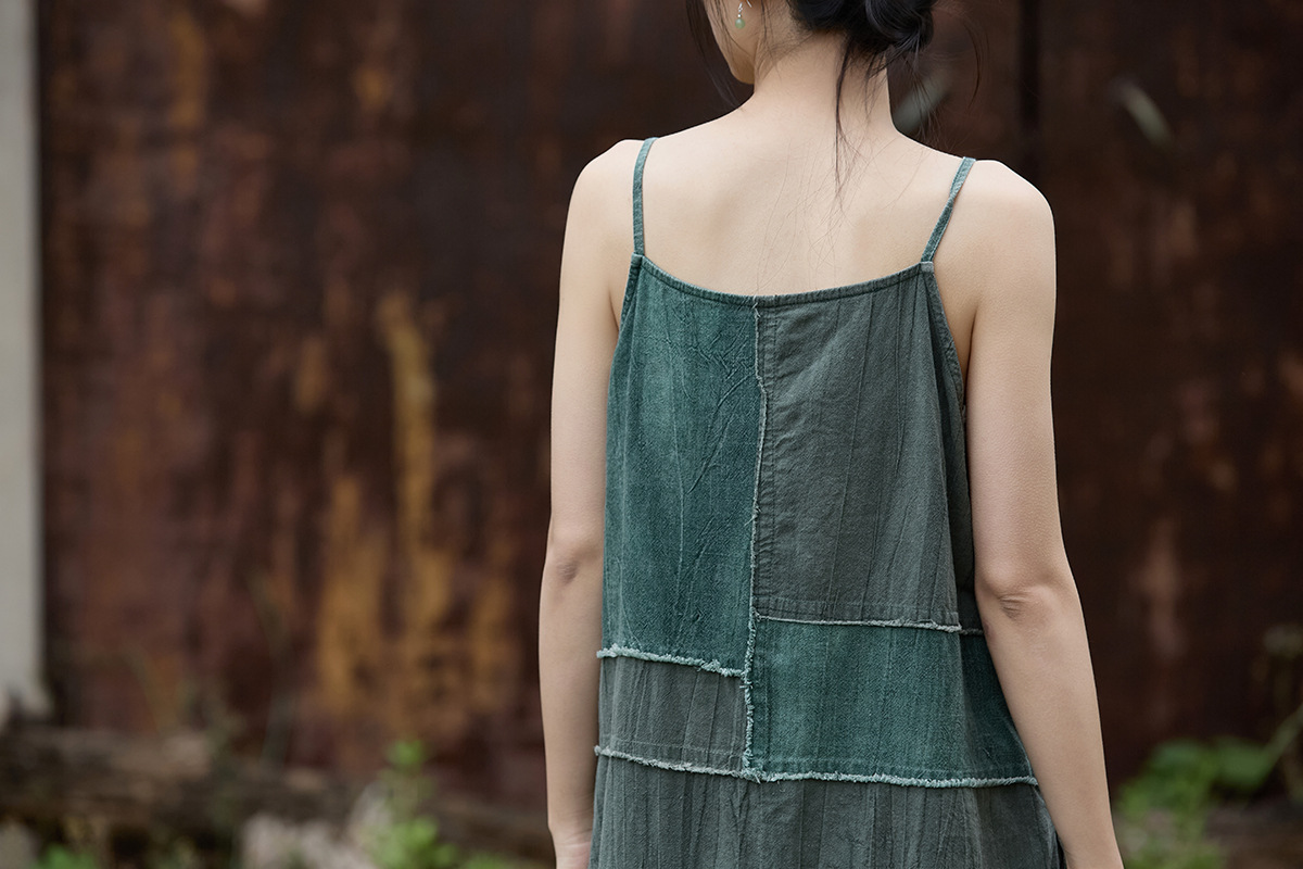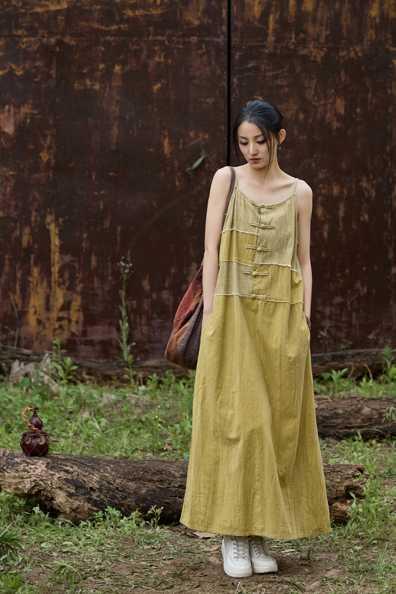 26 봄 여성복 린넨과 모시 소재의 패치워크 타이다이 롱 드레스, 오리지널 디자이너 스타일, 풍성하고 시원한 여성용 멜빵 원피스