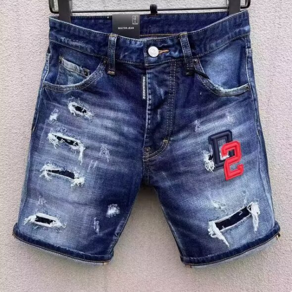 유럽과 미국의 트렌디한 여름 찢어진 잉크 메추리잎 프린트 슬림핏 청바지 남성용 대외 무역 블루 반바지 5부 중간 바지