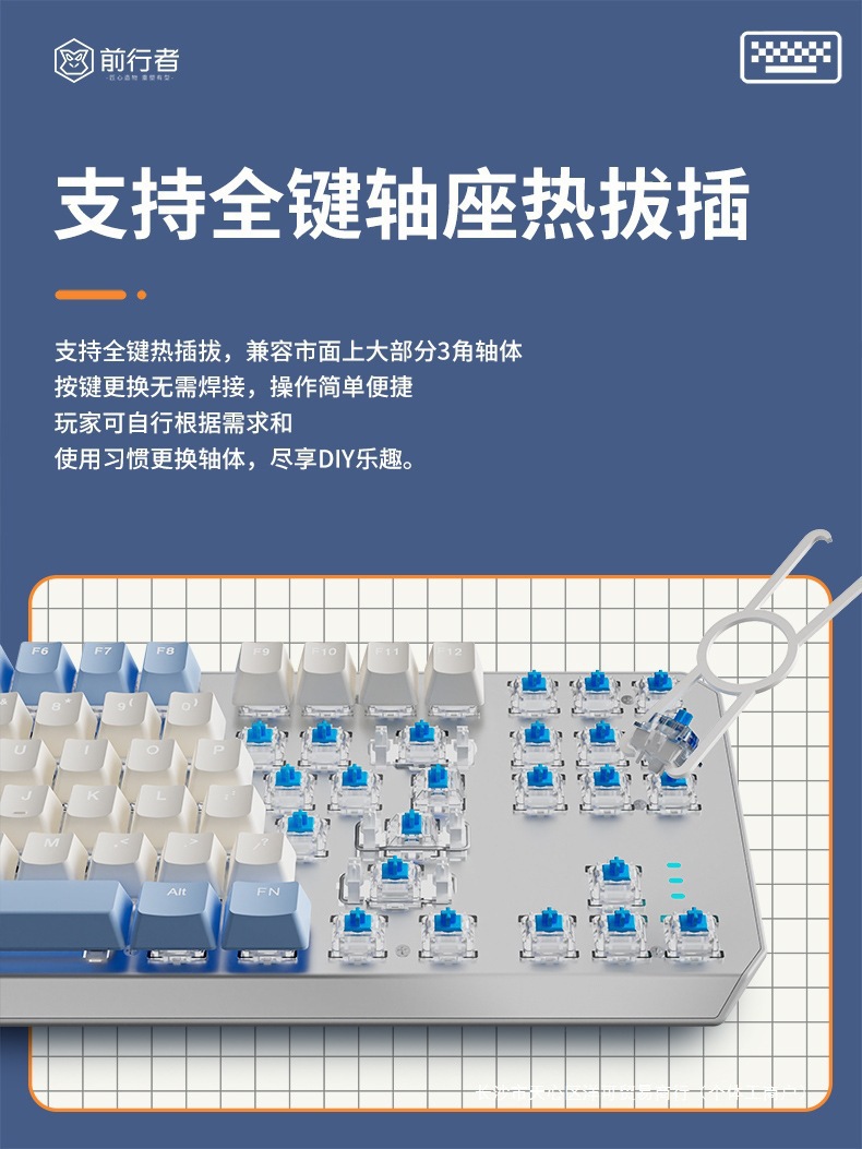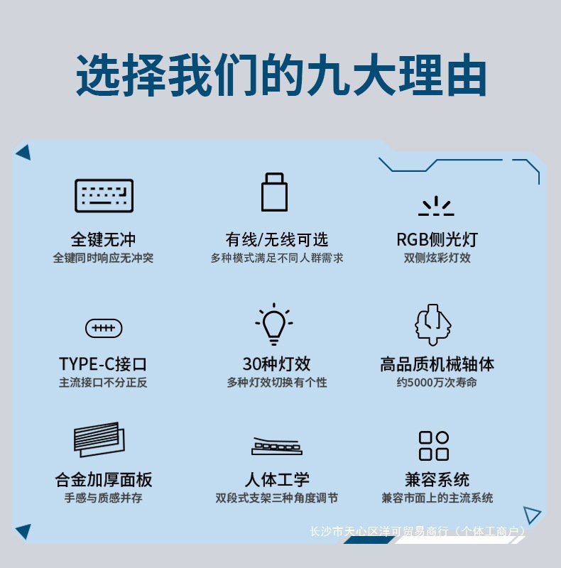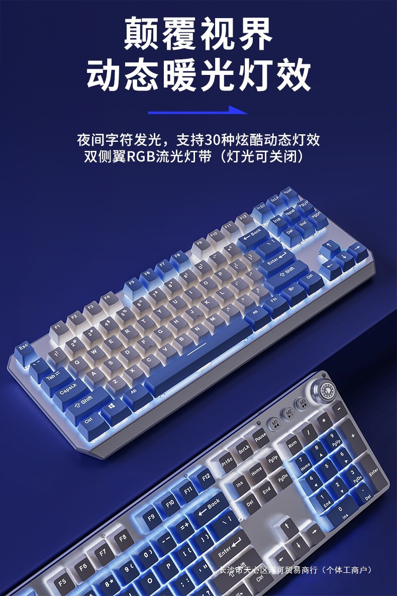 • 검정색 축 [e스포츠 플레이어는 파란색과 흰색을 좋아하고 흰색 조명을 좋아합니다. 104개의 키 [다기능 손잡이는 30가지 조명 효과를 좋아합니다.
