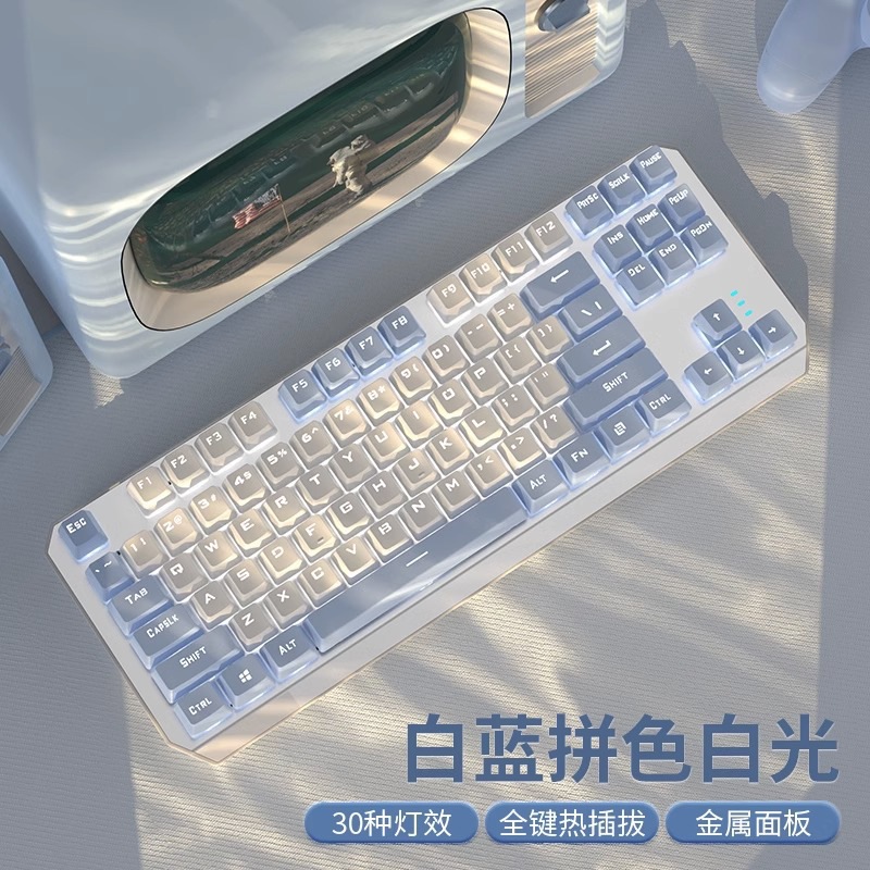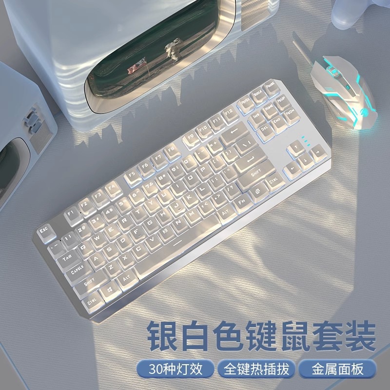 • 블랙 샤프트 [e스포츠 플레이어는 파란색과 흰색을 좋아하고 흰색 조명을 좋아합니다. 87키 + 게임 매크로 마우스 [풀 키 핫스왑 가능, 30가지 조명 효과를 좋아합니다.