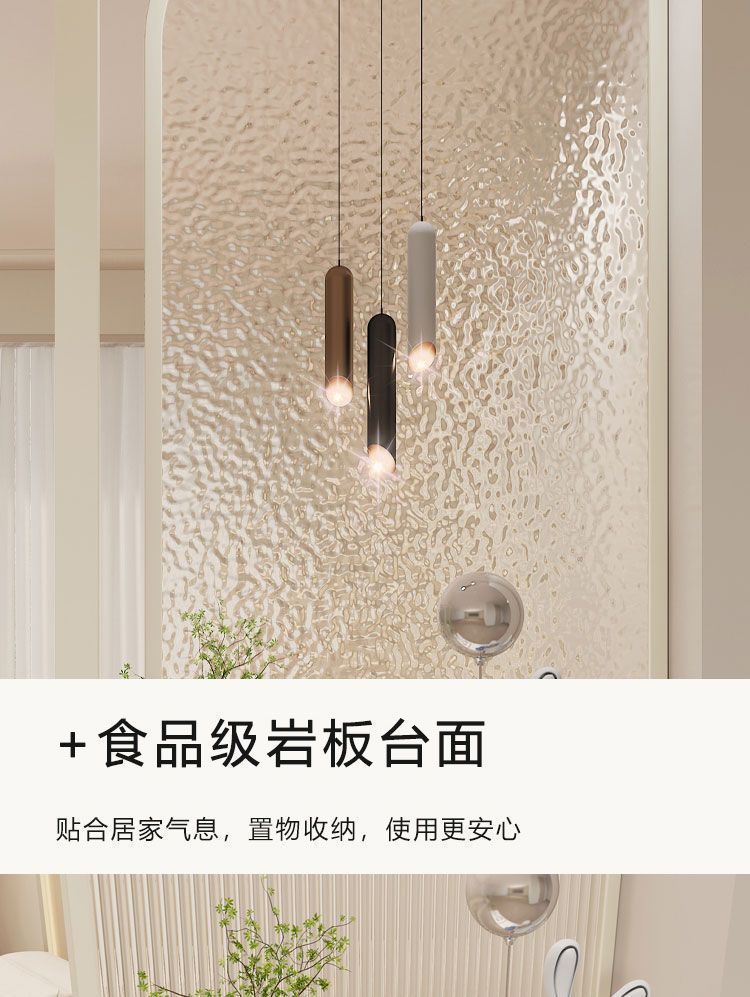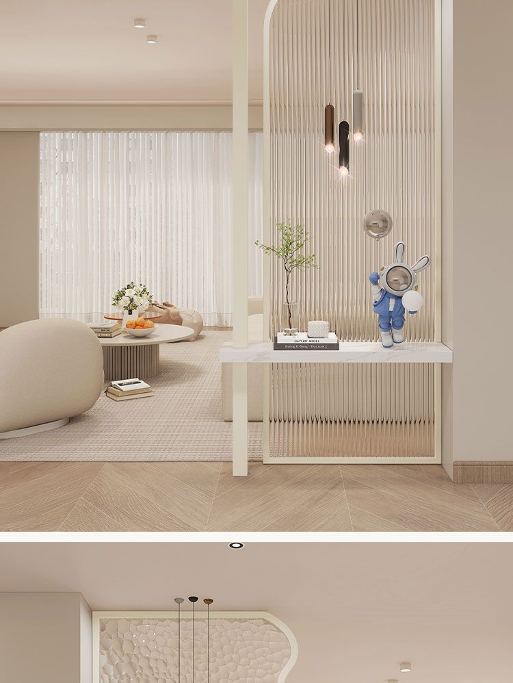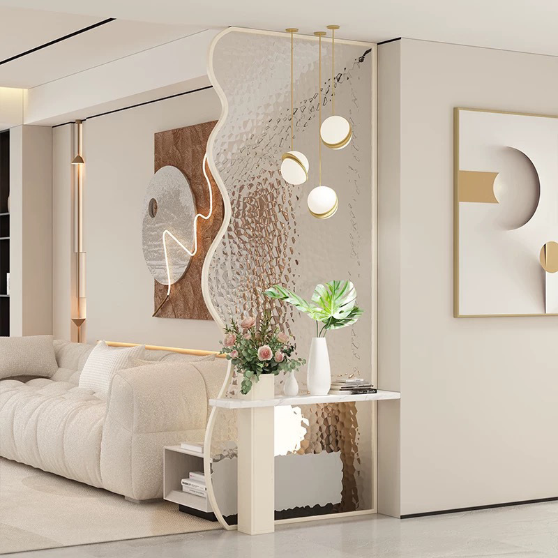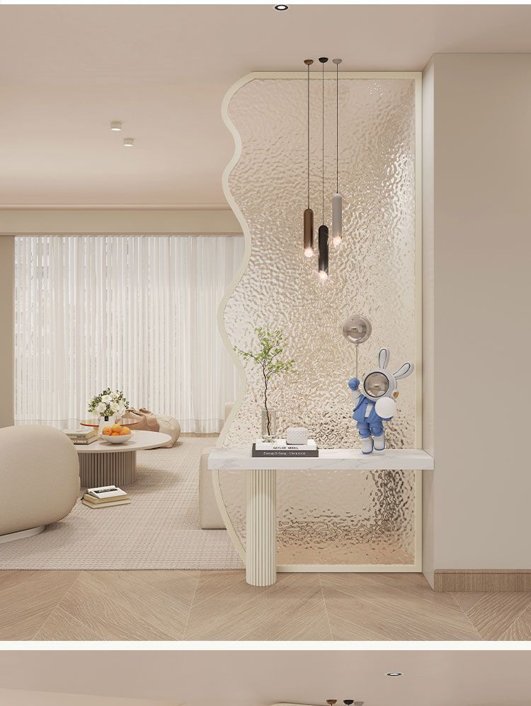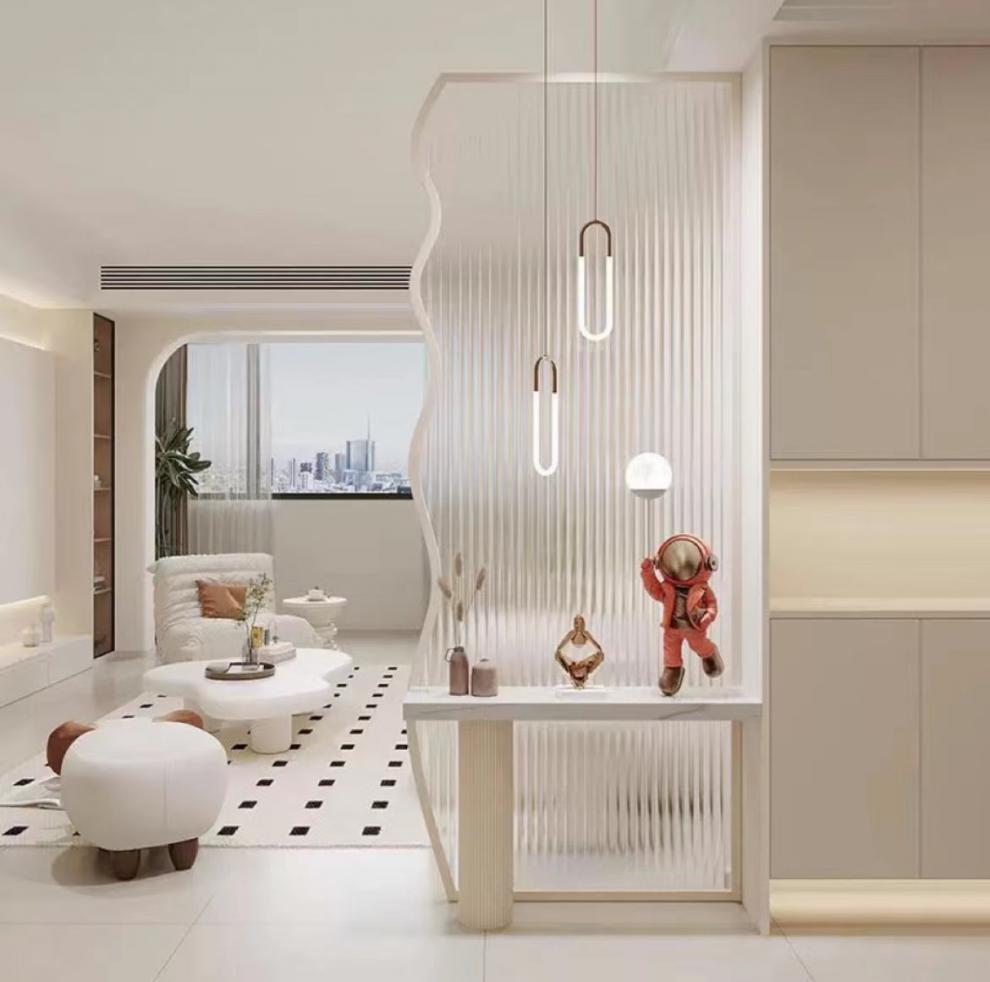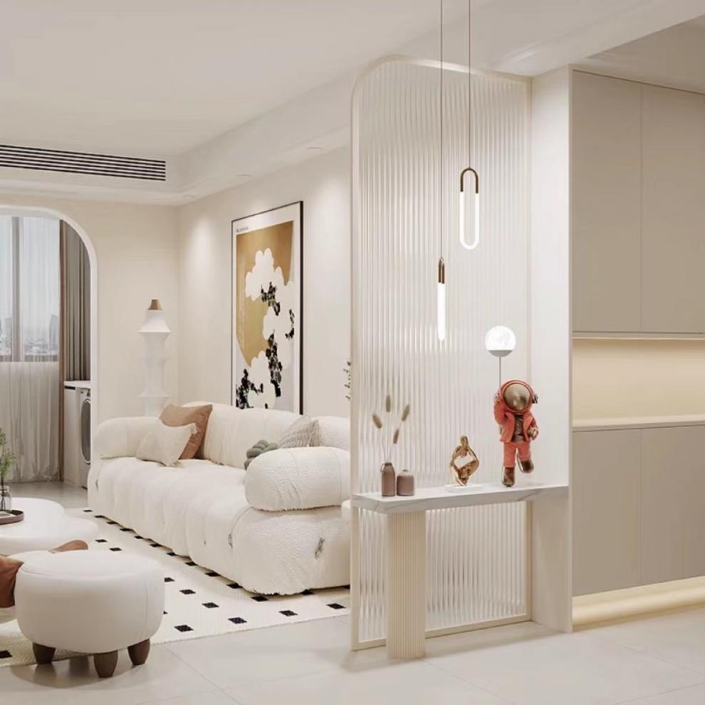 창의적인 크림 스타일의 물결 모양의 스크린 파티션, 현관에 직면한 거실, 현관 보관함을 가리키는 세면대