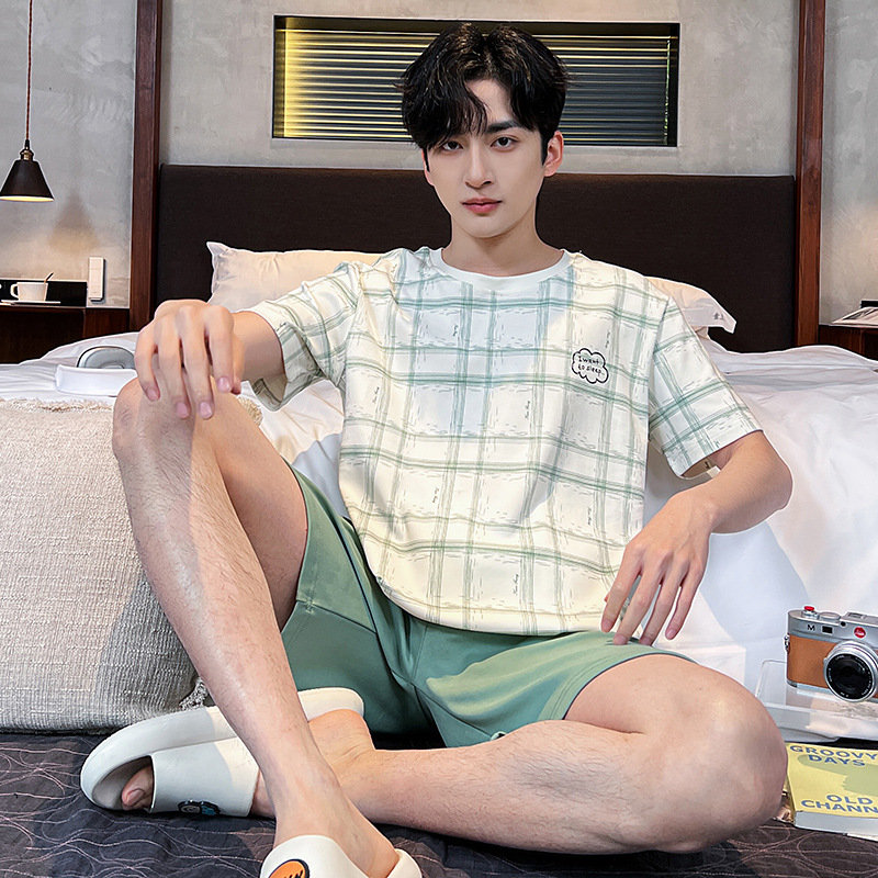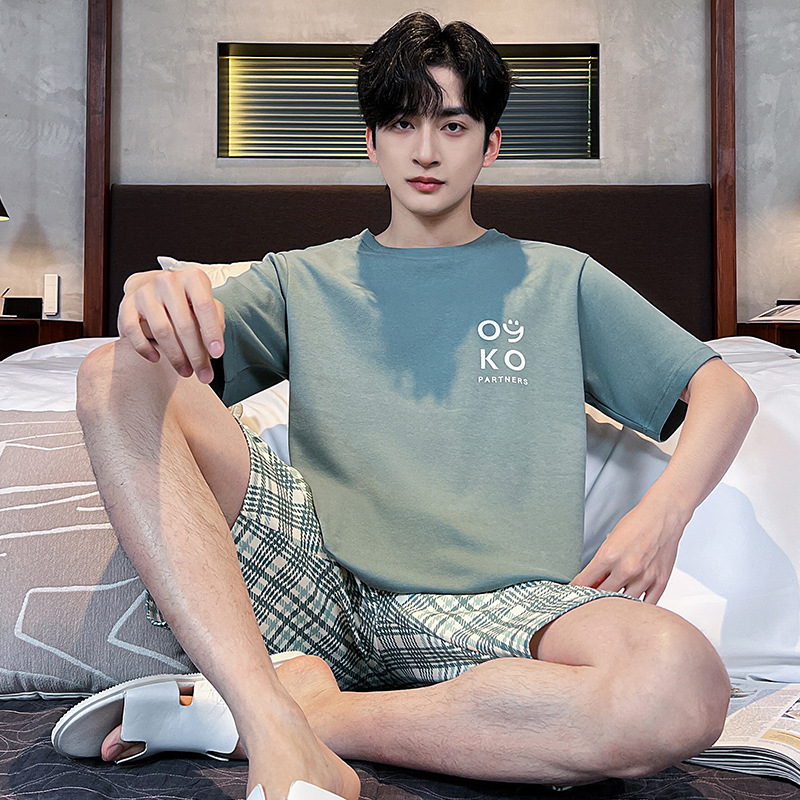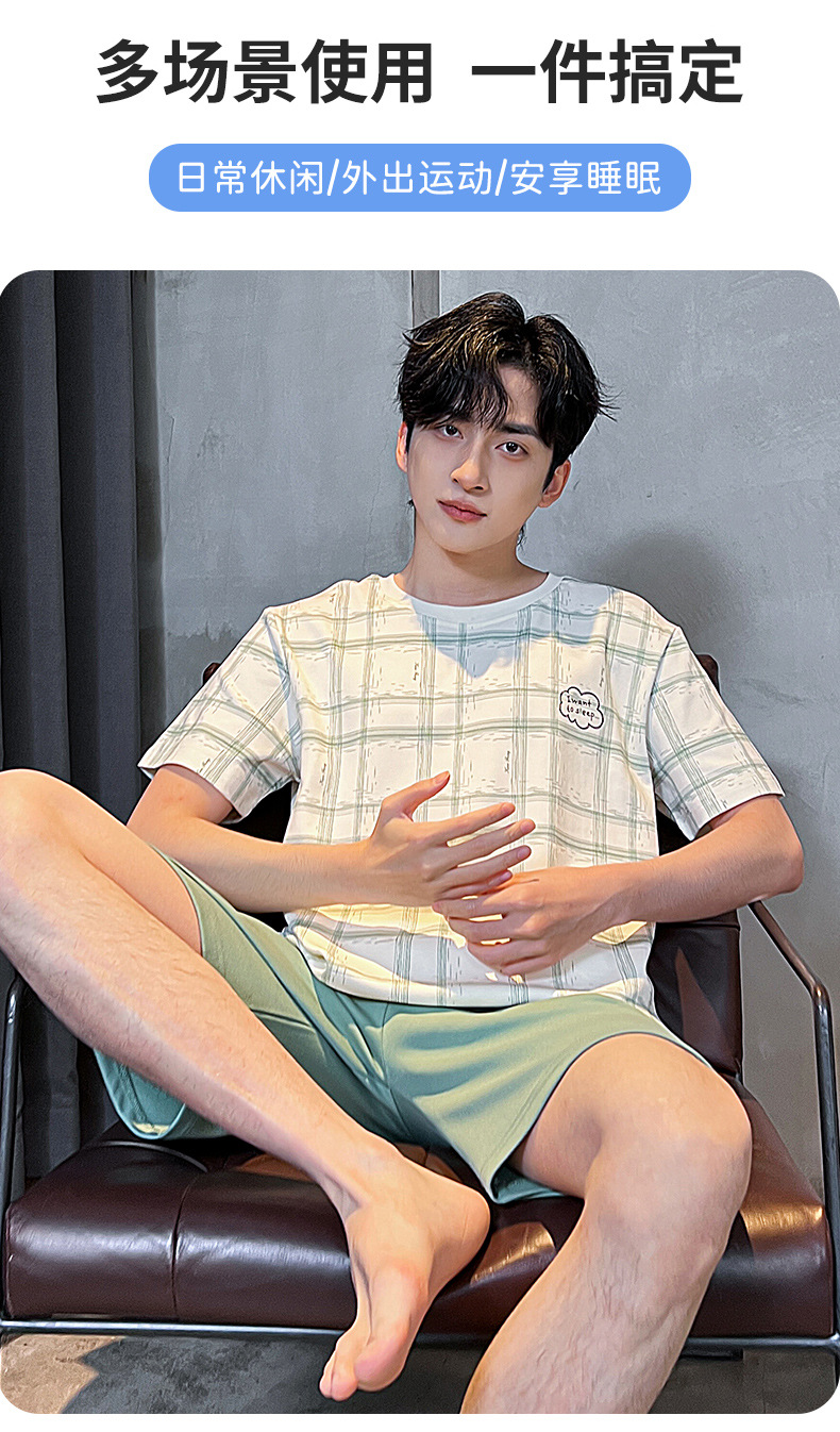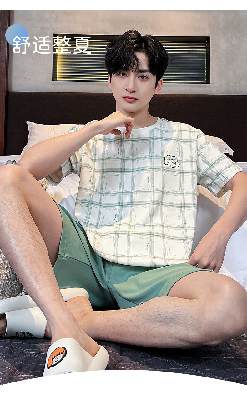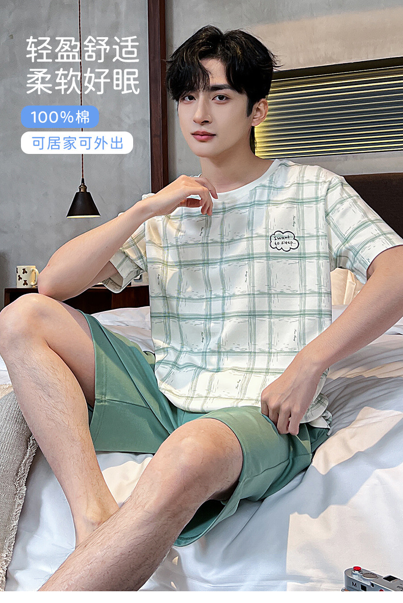 2025 새로운 여름 남성 순수 코튼 반팔 잠옷 대형 얇은 스타일 소년 반바지 홈웨어 세트 외부에서 착용 가능스토어 가기
