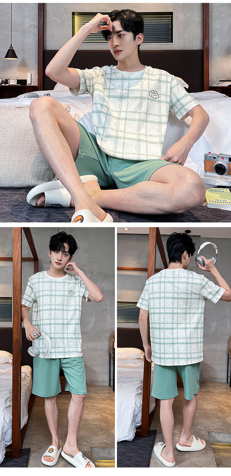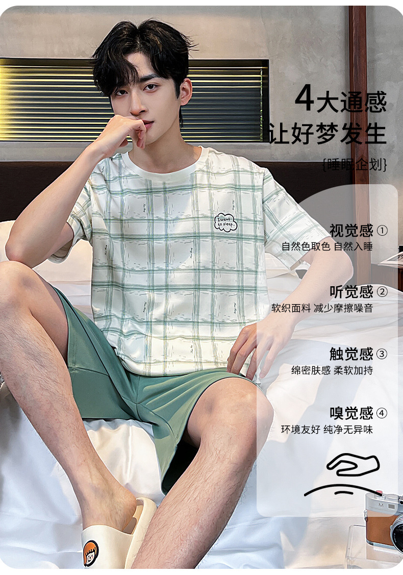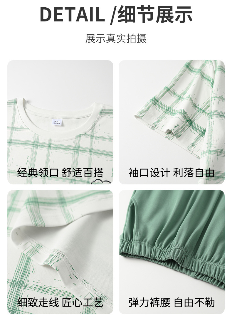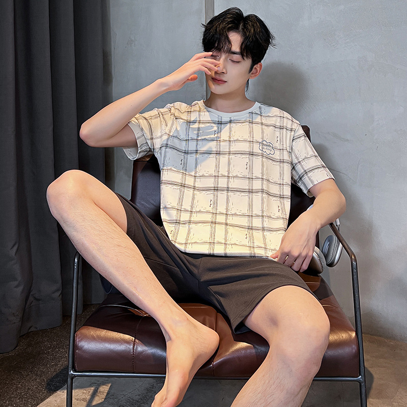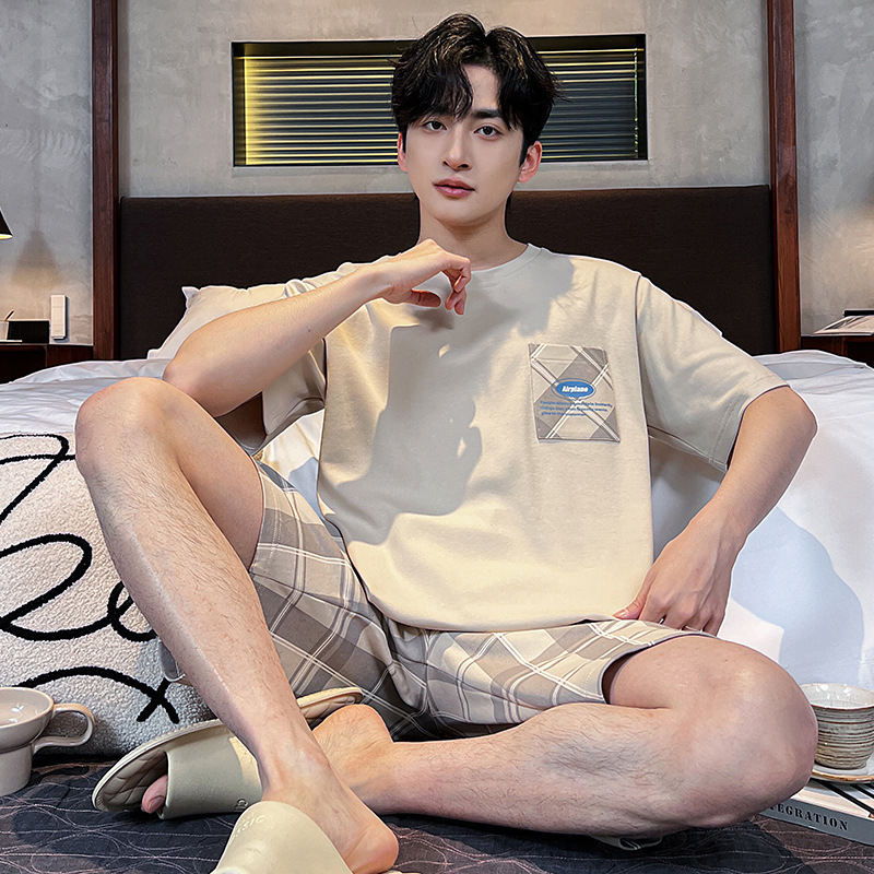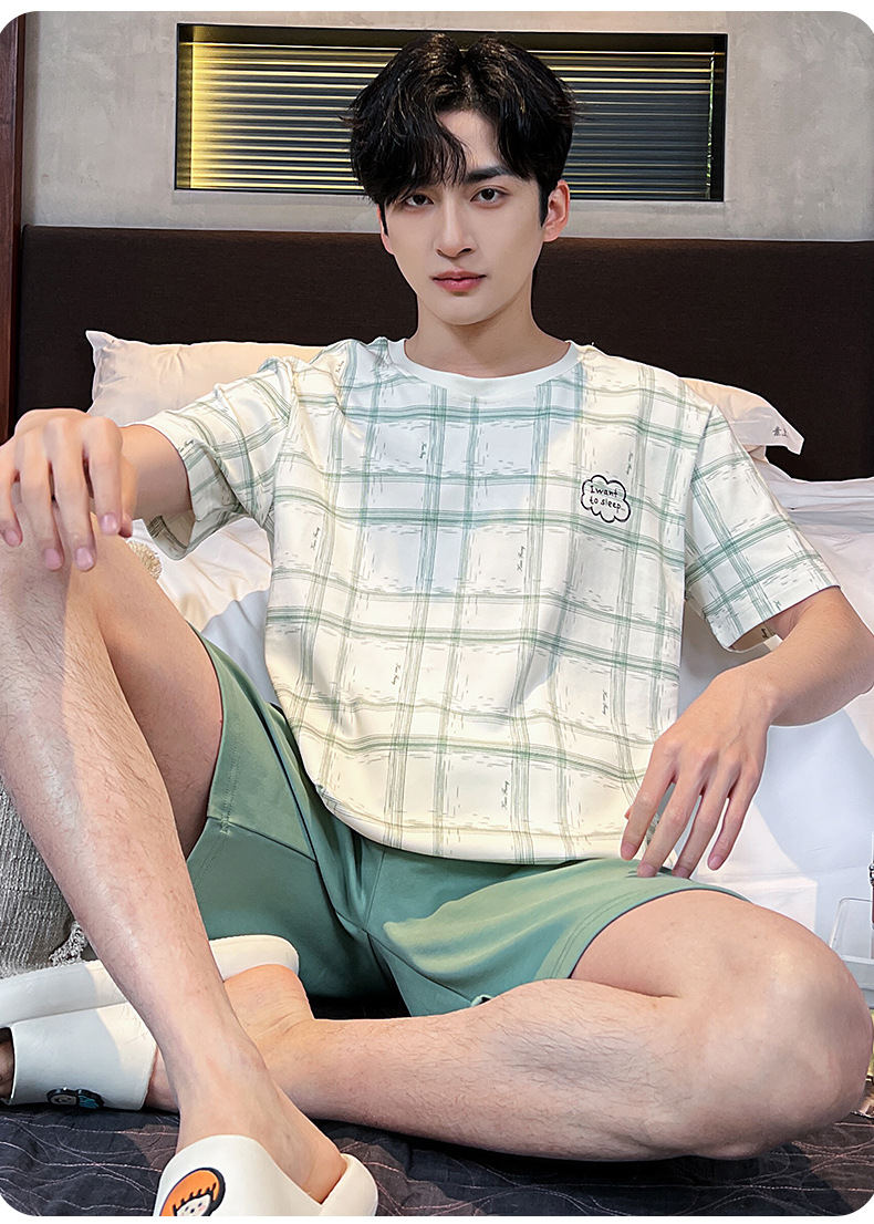 2025 새로운 여름 남성 순수 코튼 반팔 잠옷 대형 얇은 스타일 소년 반바지 홈웨어 세트 외부에서 착용 가능스토어 가기