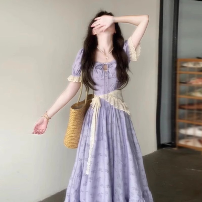 젠틀 스타일 티 브레이크 프렌치 퍼프 슬리브 퍼플 허리 롱 스커트, 우아하고 고급스러운 레이스 스플리싱 여름 드레스스토어 가기