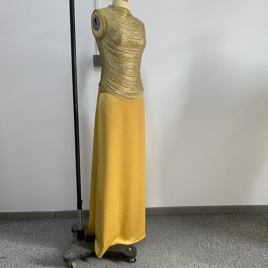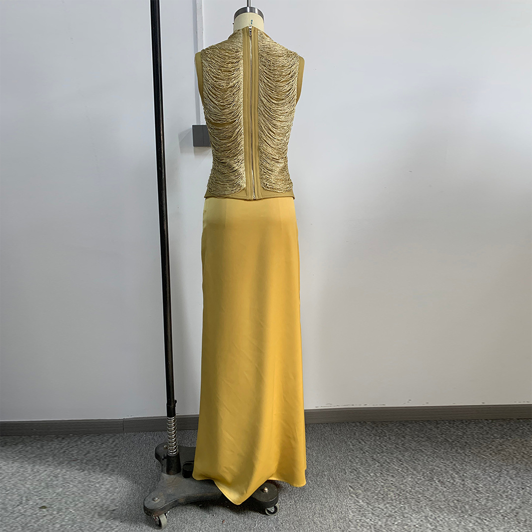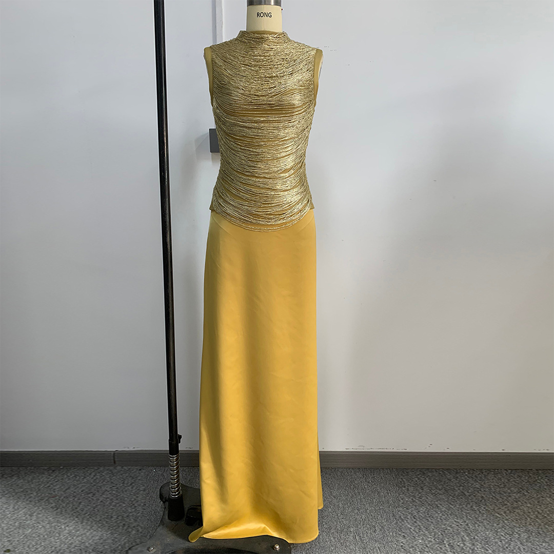 여성을위한 하이 엔드 투피스 양복 여름 새로운 민소매 하이 넥 태슬 스플 라이스 탑 새틴 스커트 슈트