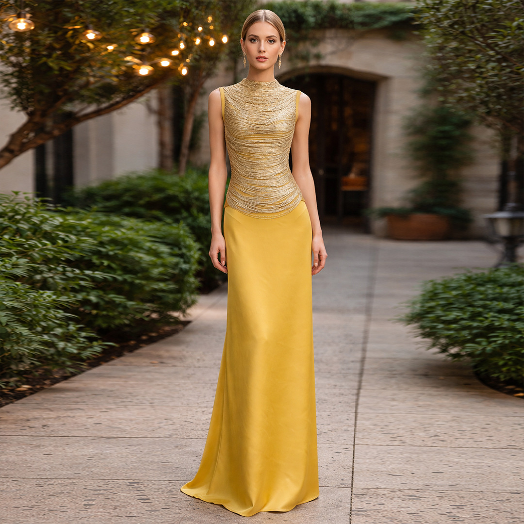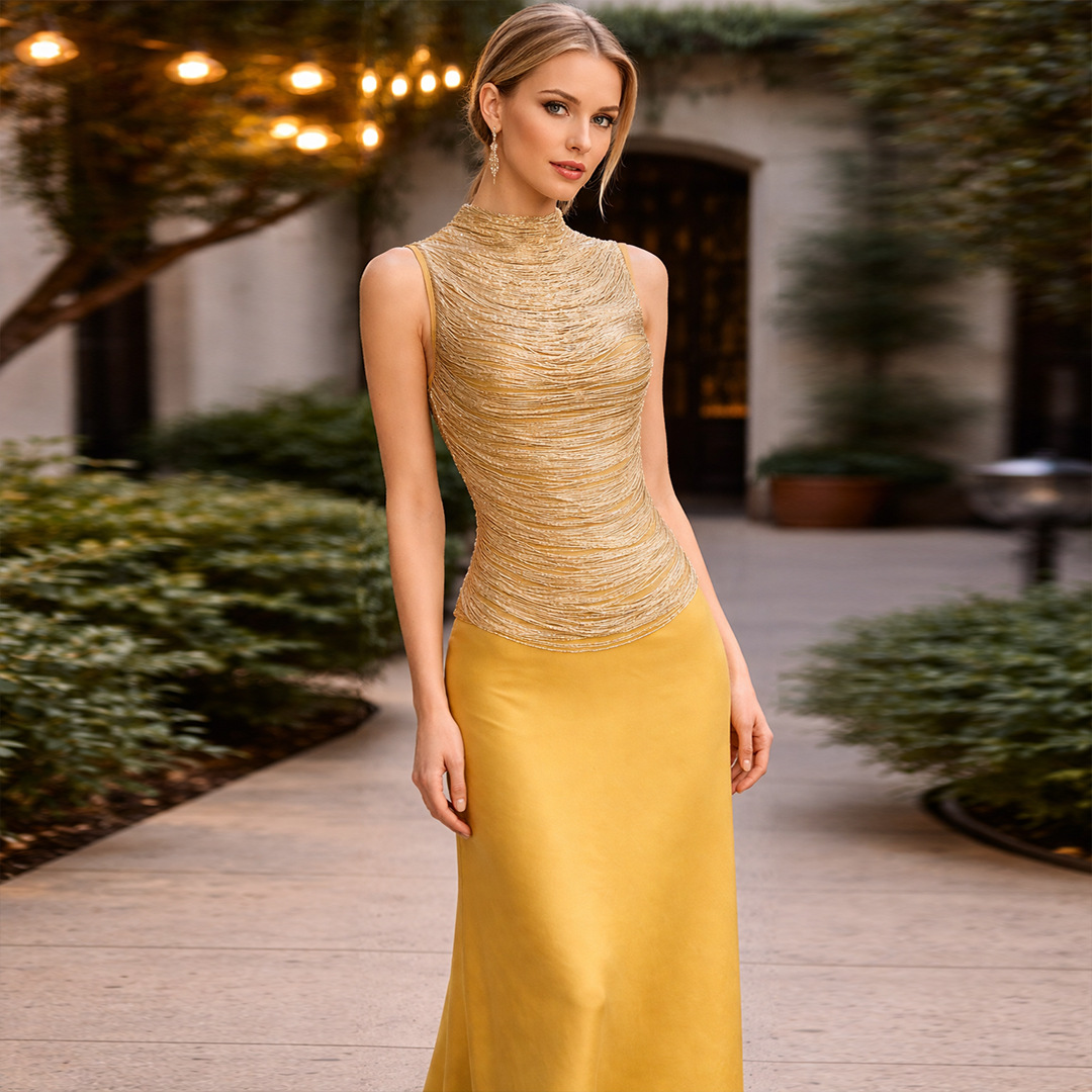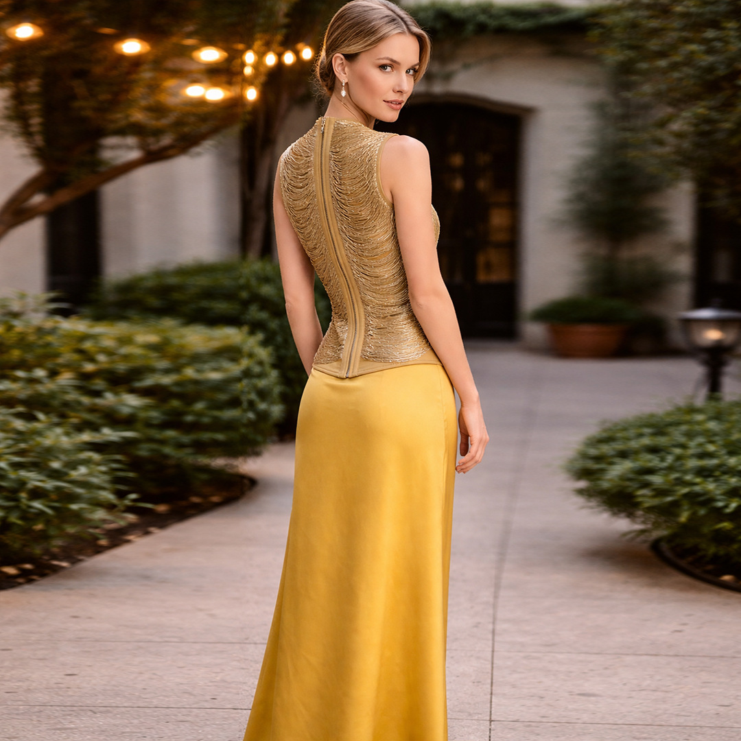 여성을위한 하이 엔드 투피스 양복 여름 새로운 민소매 하이 넥 태슬 스플 라이스 탑 새틴 스커트 슈트