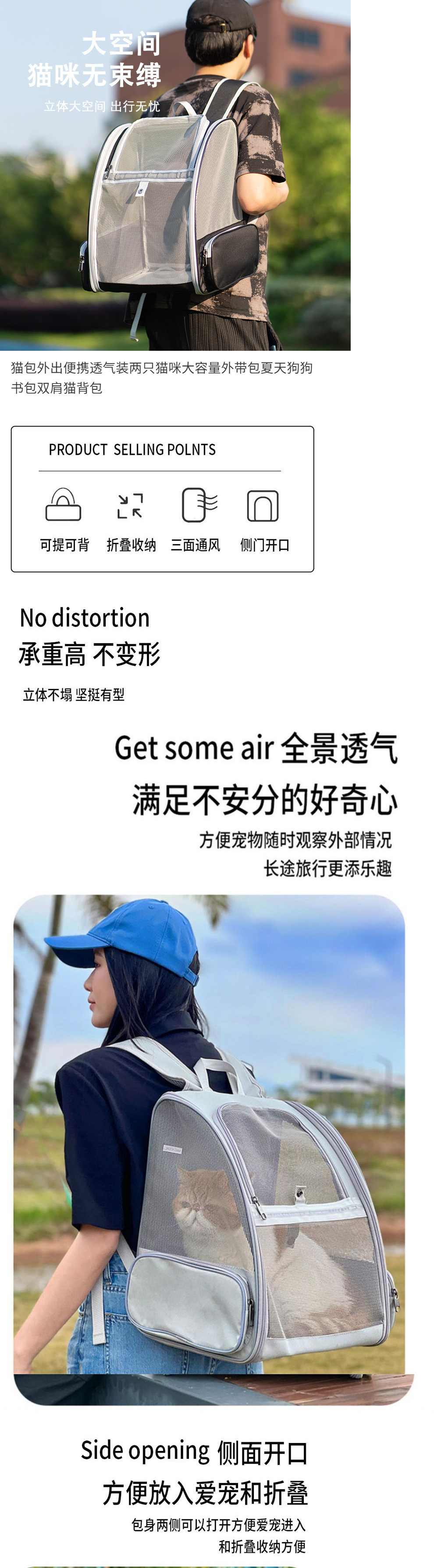 고양이 가방, 휴대용 및 통기성, 고양이 2마리용 대용량 테이크아웃 가방, 여름용 강아지 가방, 배낭, 고양이 배낭