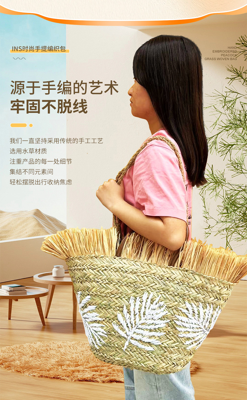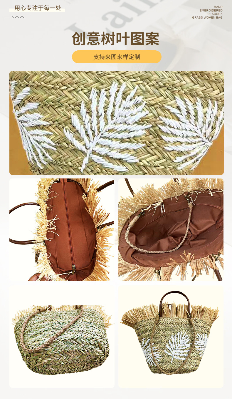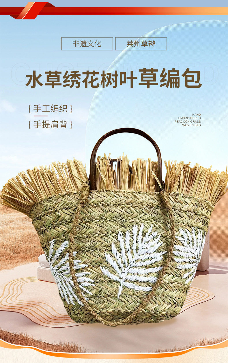 水草包绣花树叶手提肩背两用大容量肩包_07