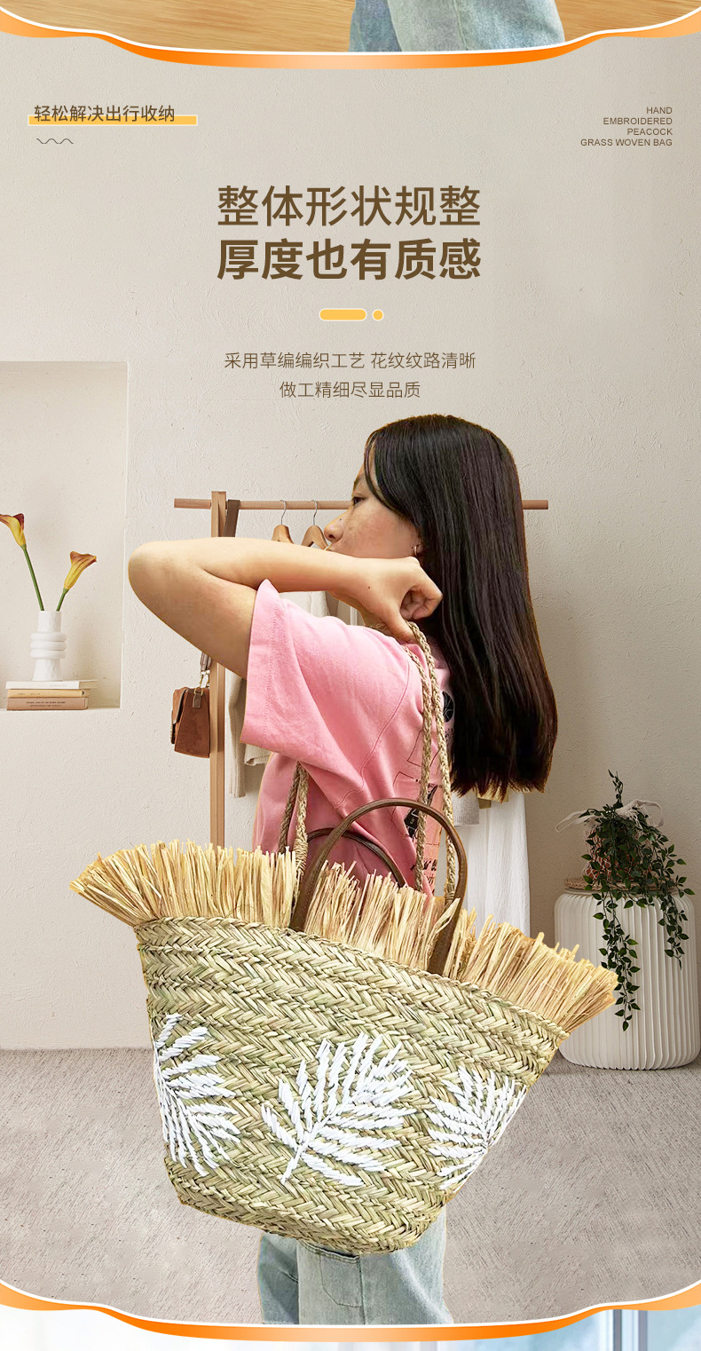 초대형 해변 가방, 수생 식물으로 짠 가방, 자수 흰색 잎 라피아 모피 술 여성용 휴대용 어깨 가방스토어 가기