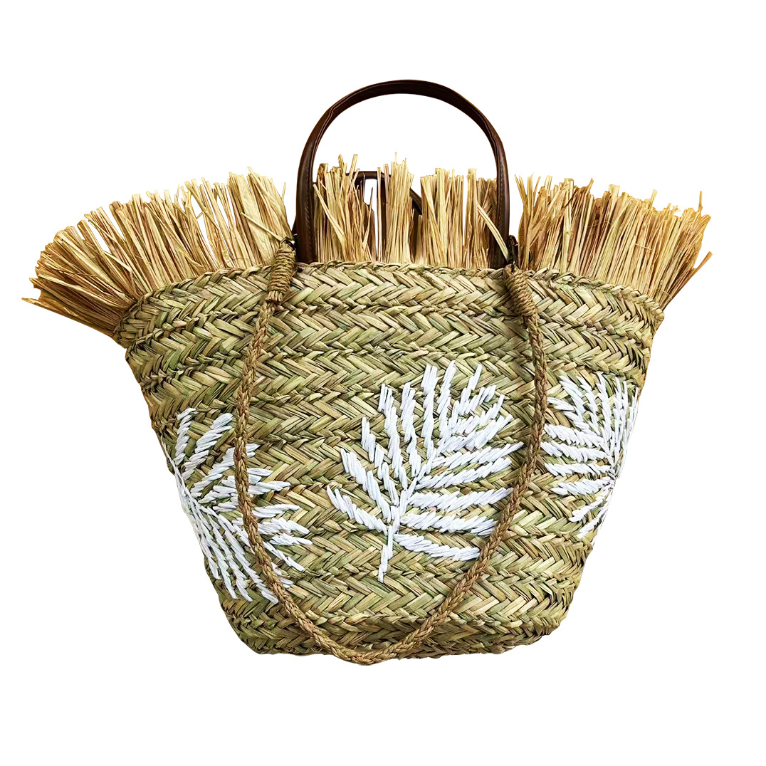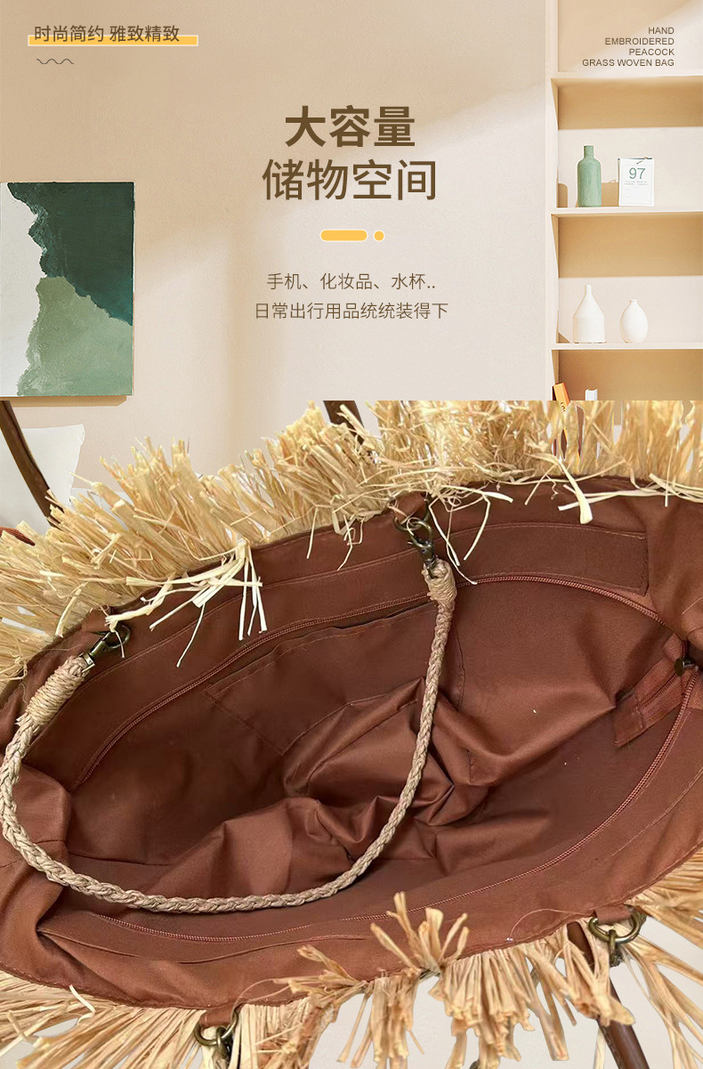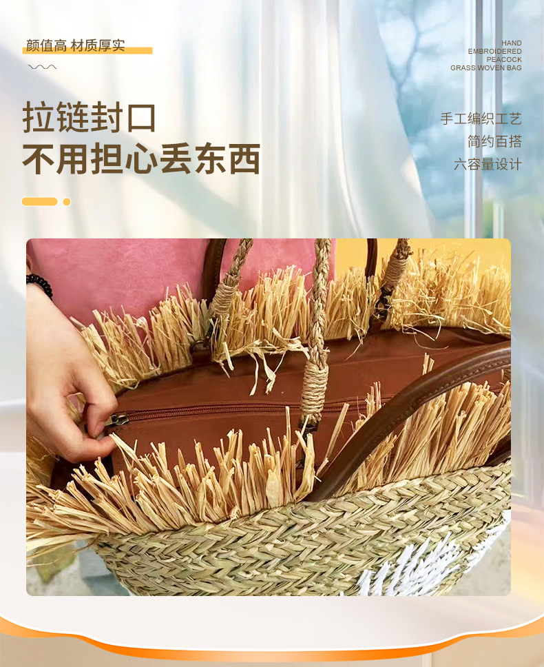 초대형 해변 가방, 수생 식물으로 짠 가방, 자수 흰색 잎 라피아 모피 술 여성용 휴대용 어깨 가방