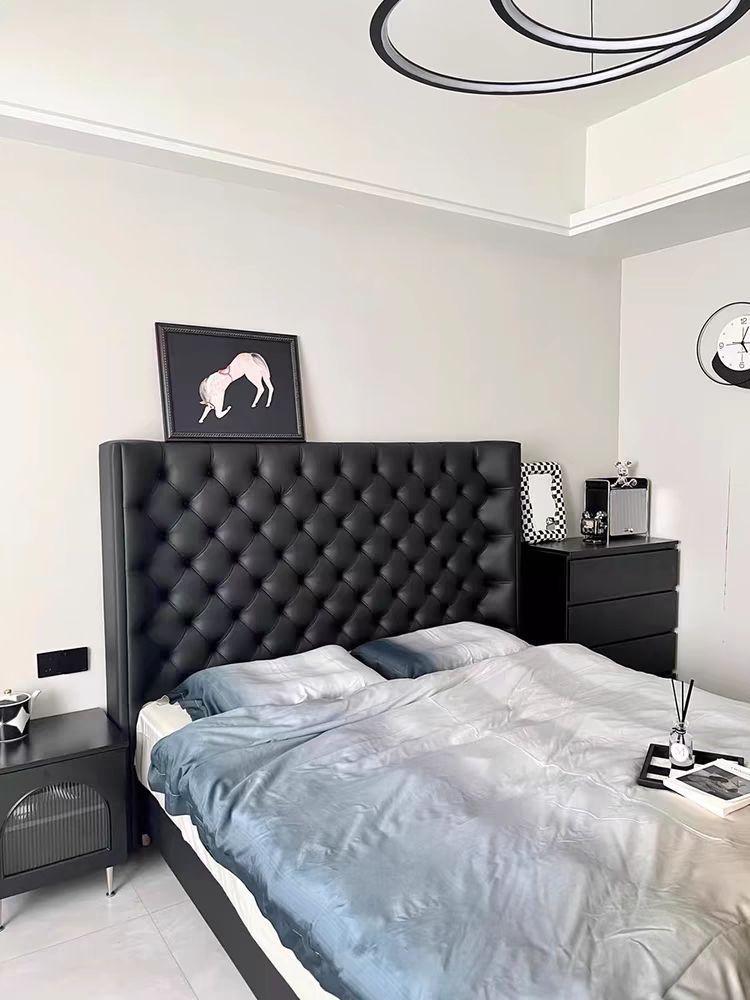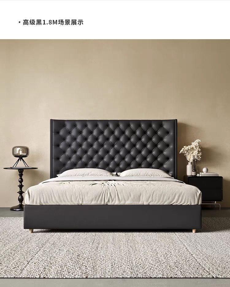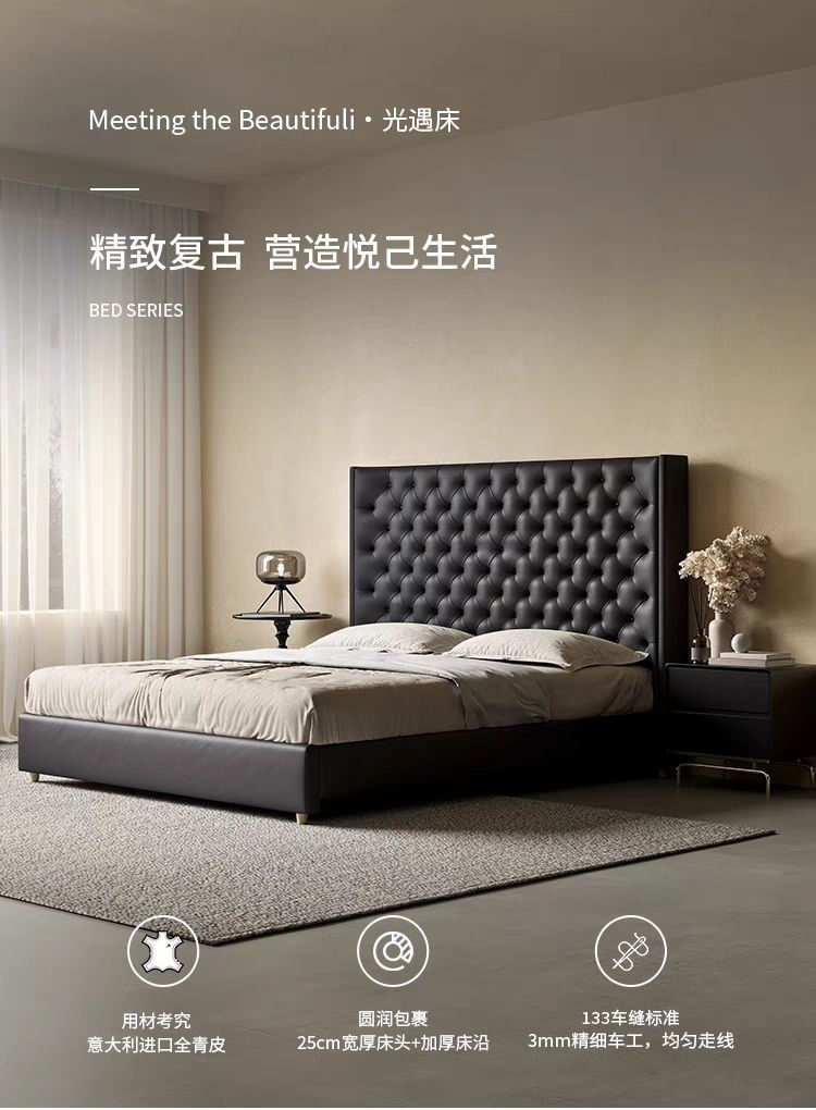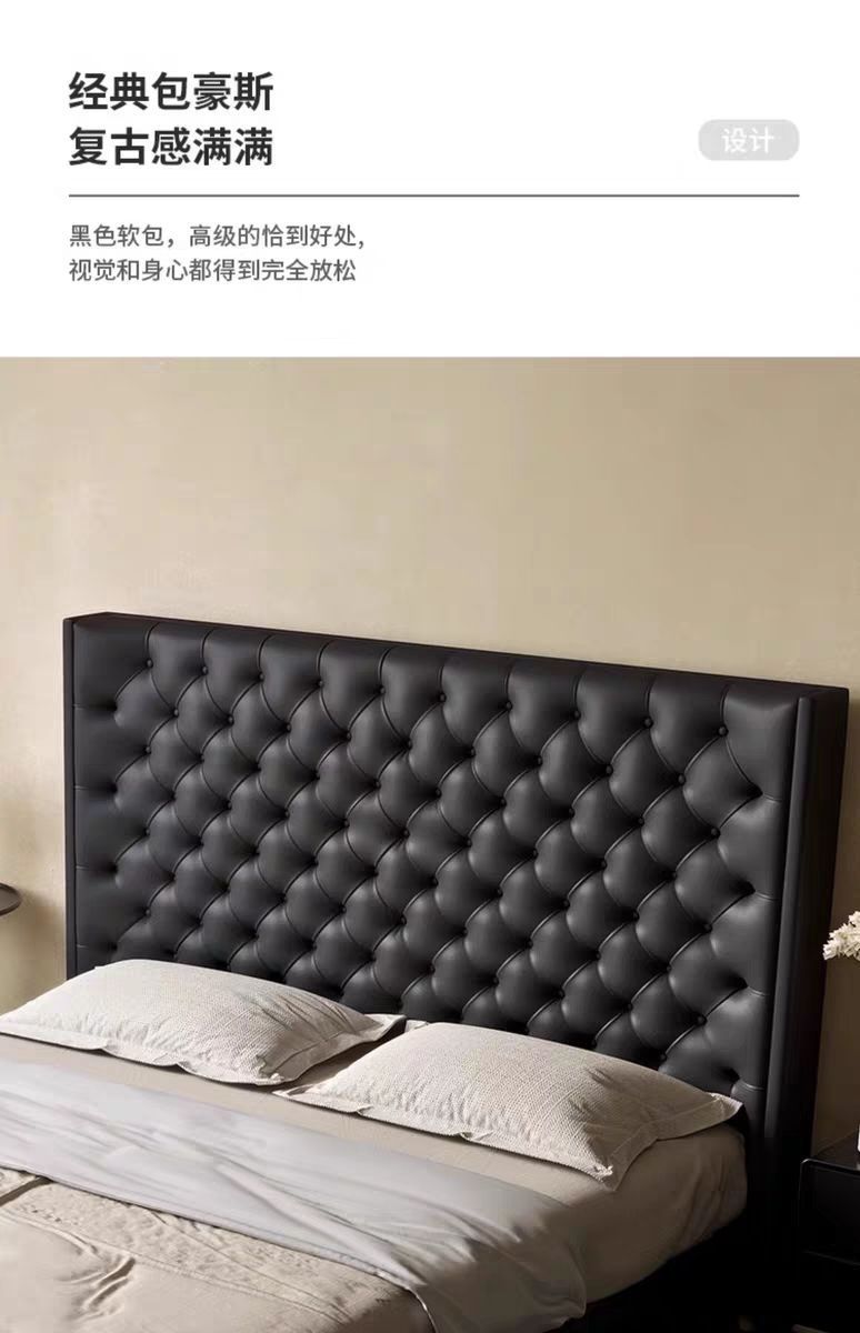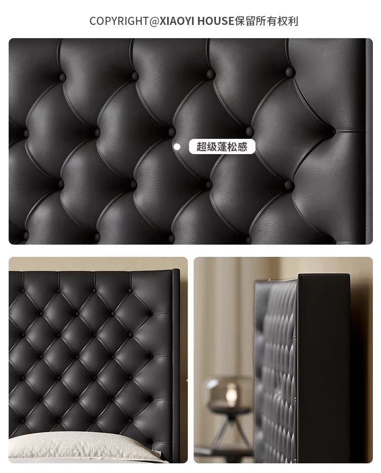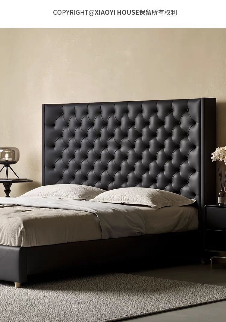 Xiaoyi Wabi-sabi 스타일 복고풍 검정색 미니멀리스트 가죽 침대 현대적인 미니멀리스트 마스터 침실 버클 프렌치 더블 소프트 가죽 침대스토어 가기