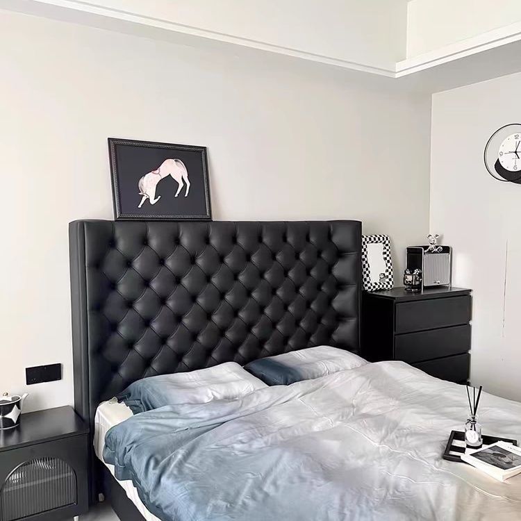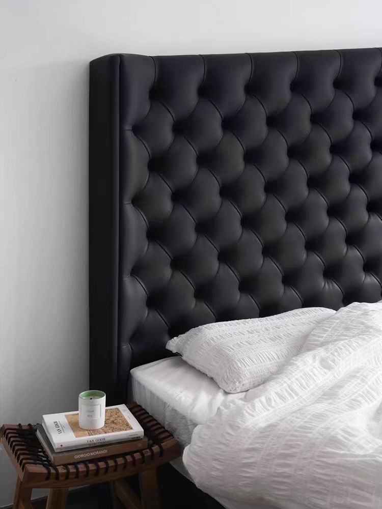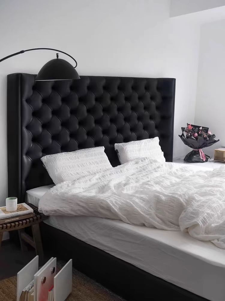 Xiaoyi Wabi-sabi 스타일 복고풍 검정색 미니멀리스트 가죽 침대 현대적인 미니멀리스트 마스터 침실 버클 프렌치 더블 소프트 가죽 침대