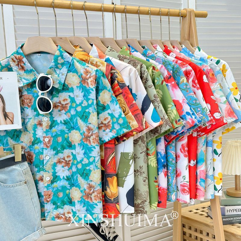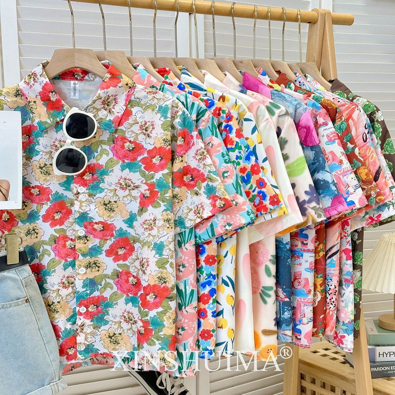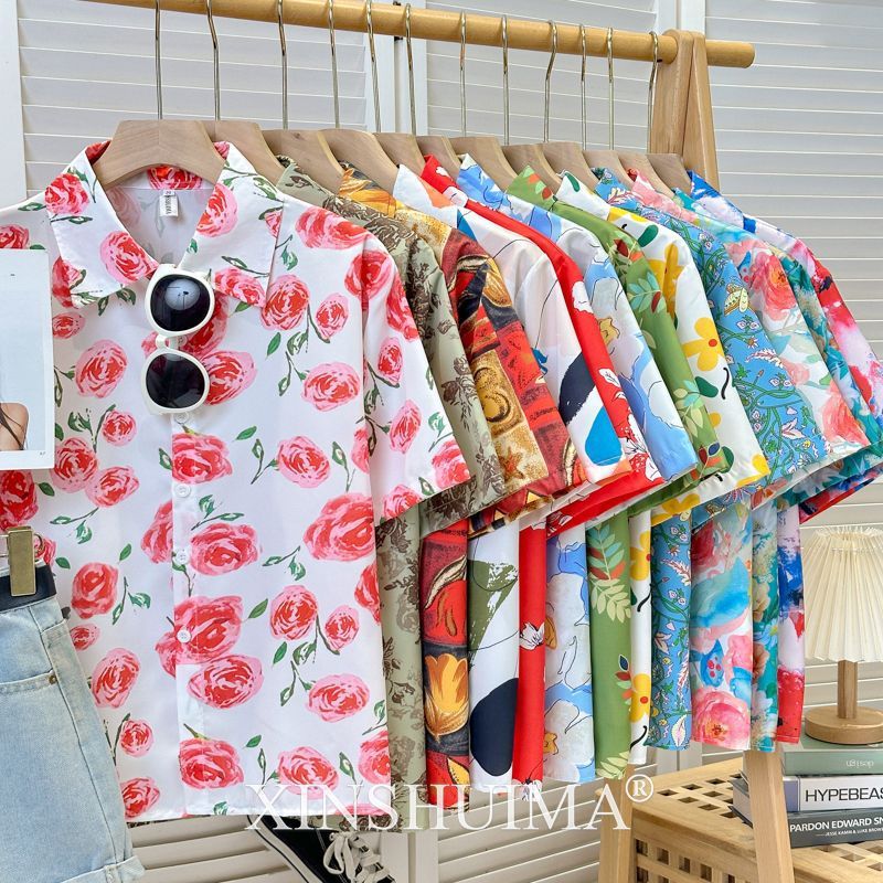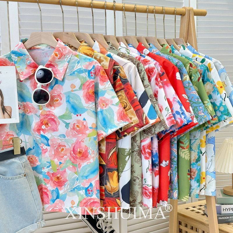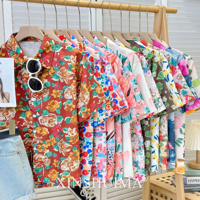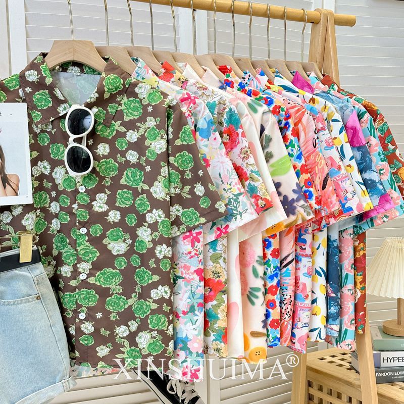 여성을위한 복고풍 홍콩 스타일 꽃 프린트 반팔 셔츠 여름 틈새 디자인 세련된 개성 느슨한 슬림 셔츠스토어 가기
