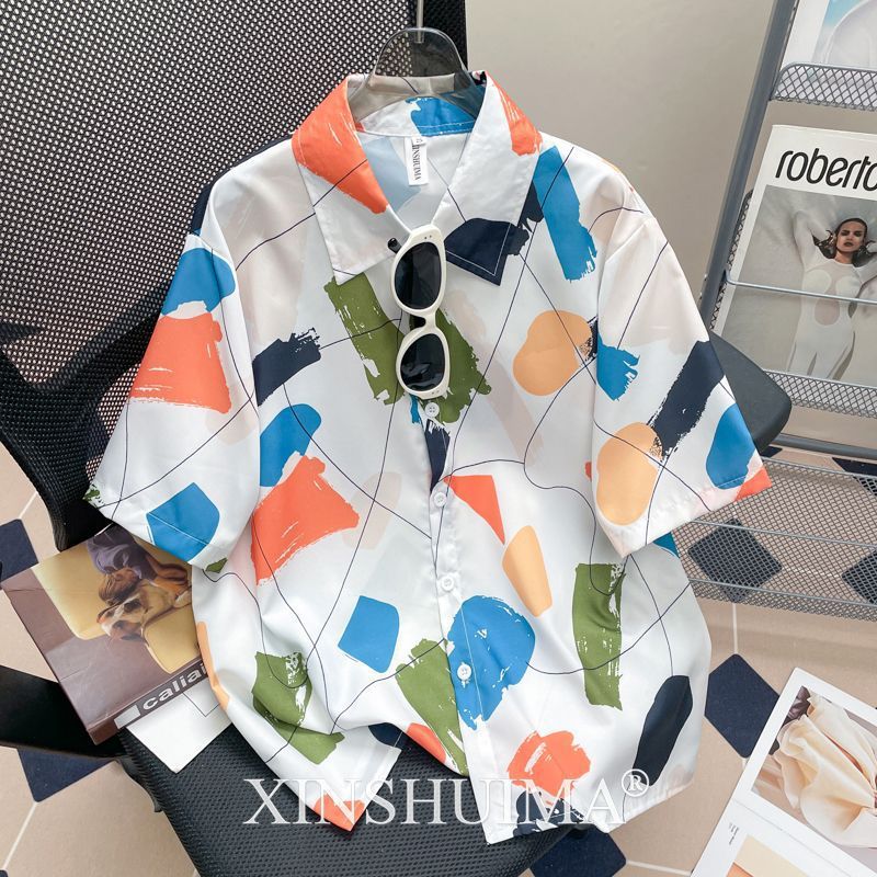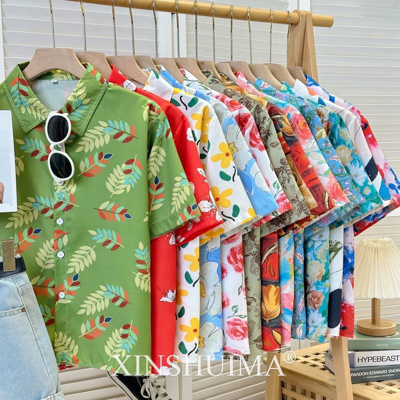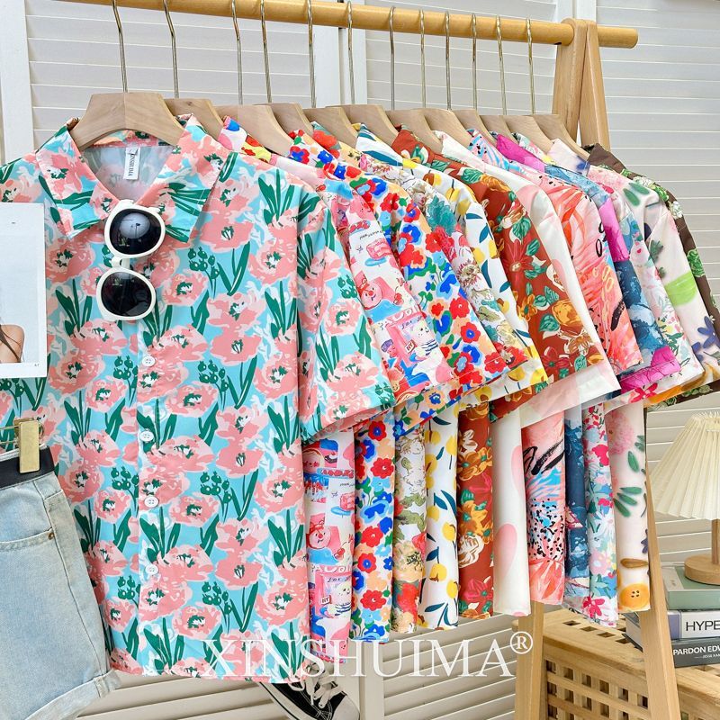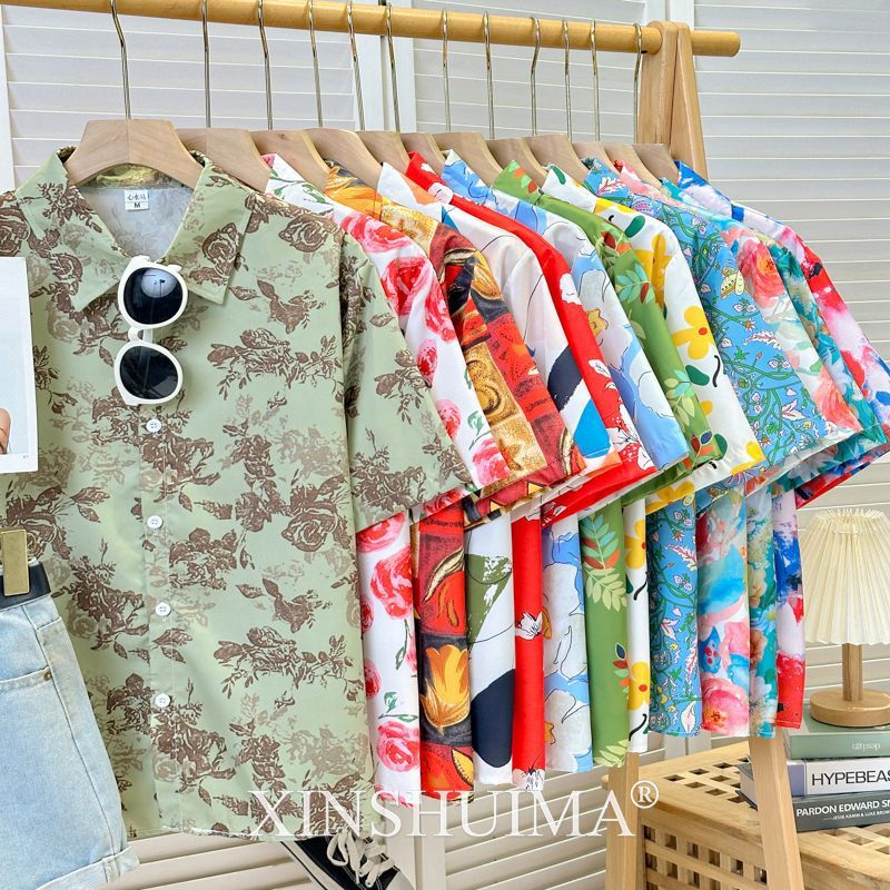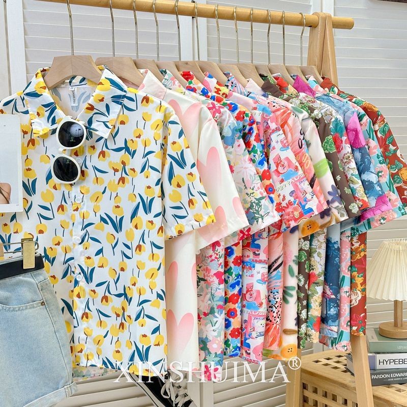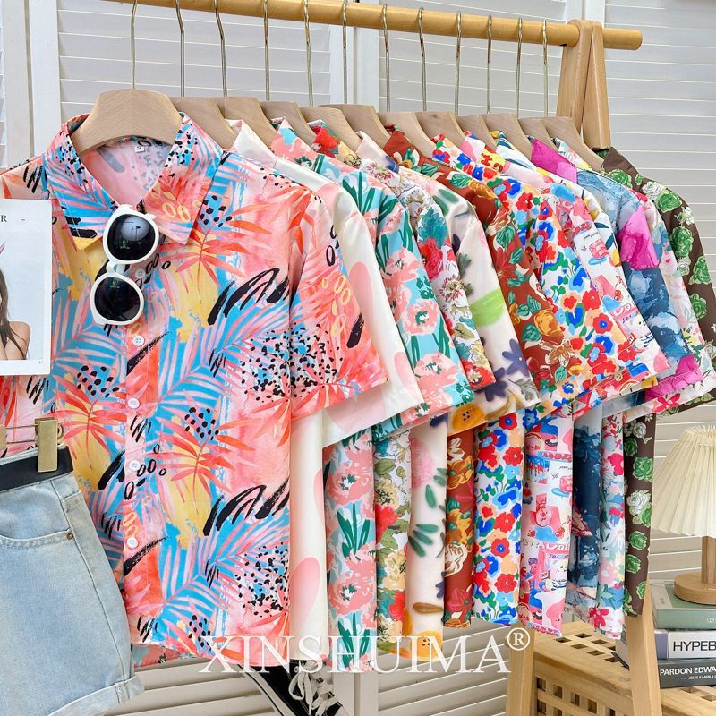 여성을위한 복고풍 홍콩 스타일 꽃 프린트 반팔 셔츠 여름 틈새 디자인 세련된 개성 느슨한 슬림 셔츠스토어 가기