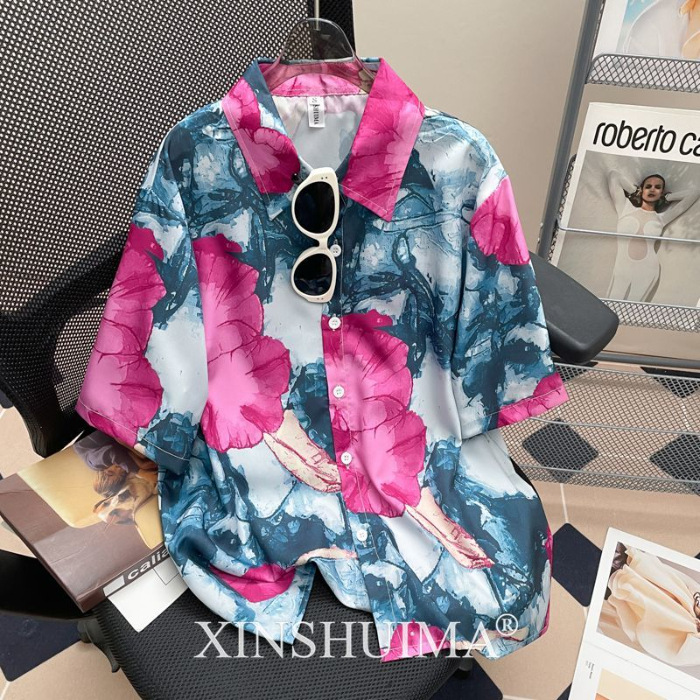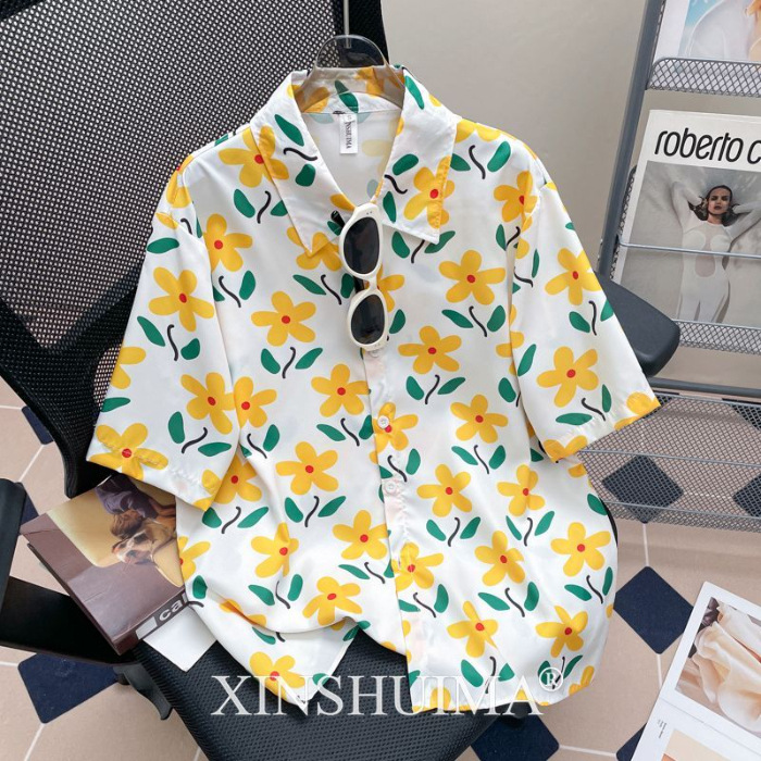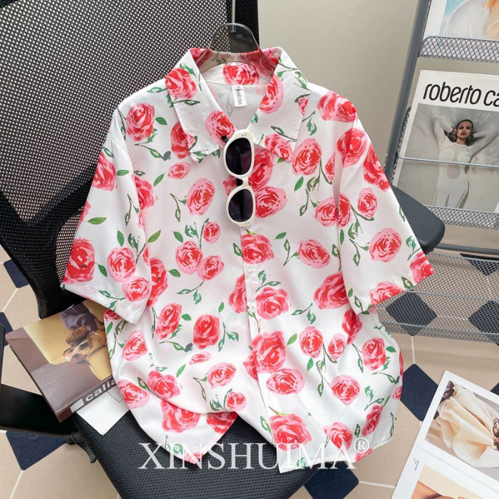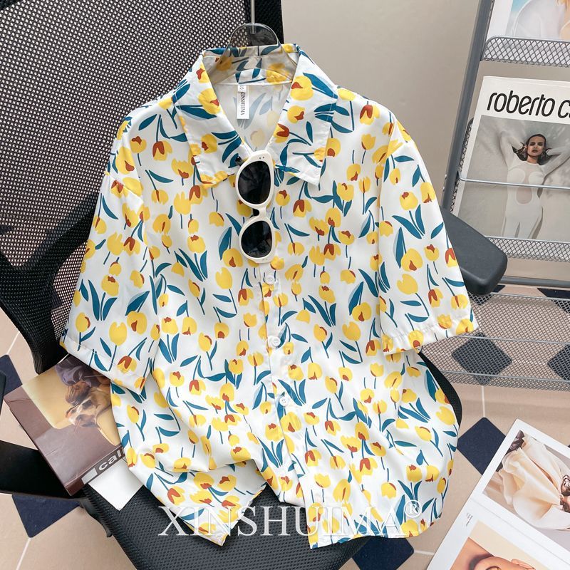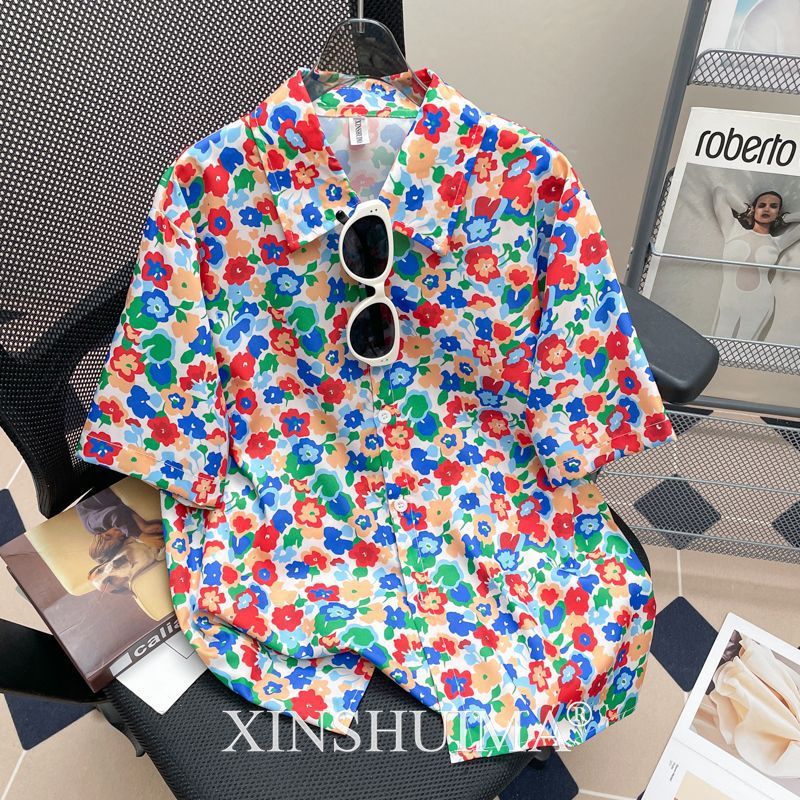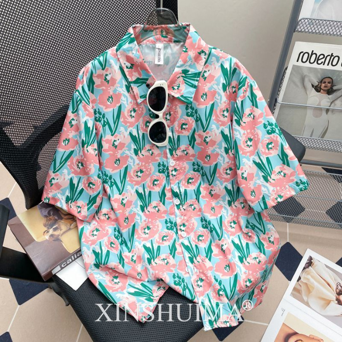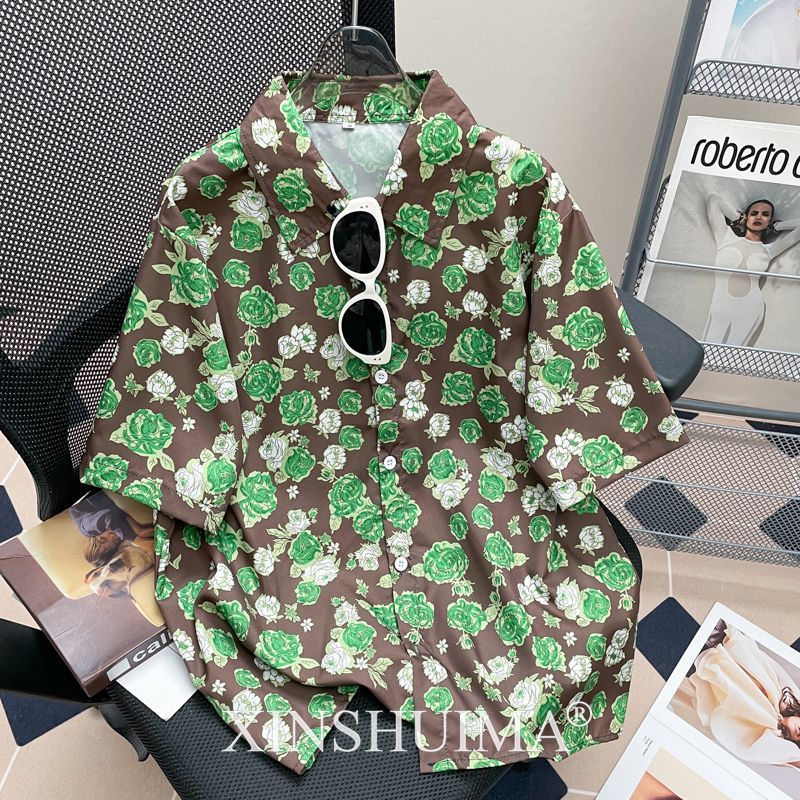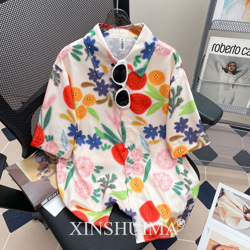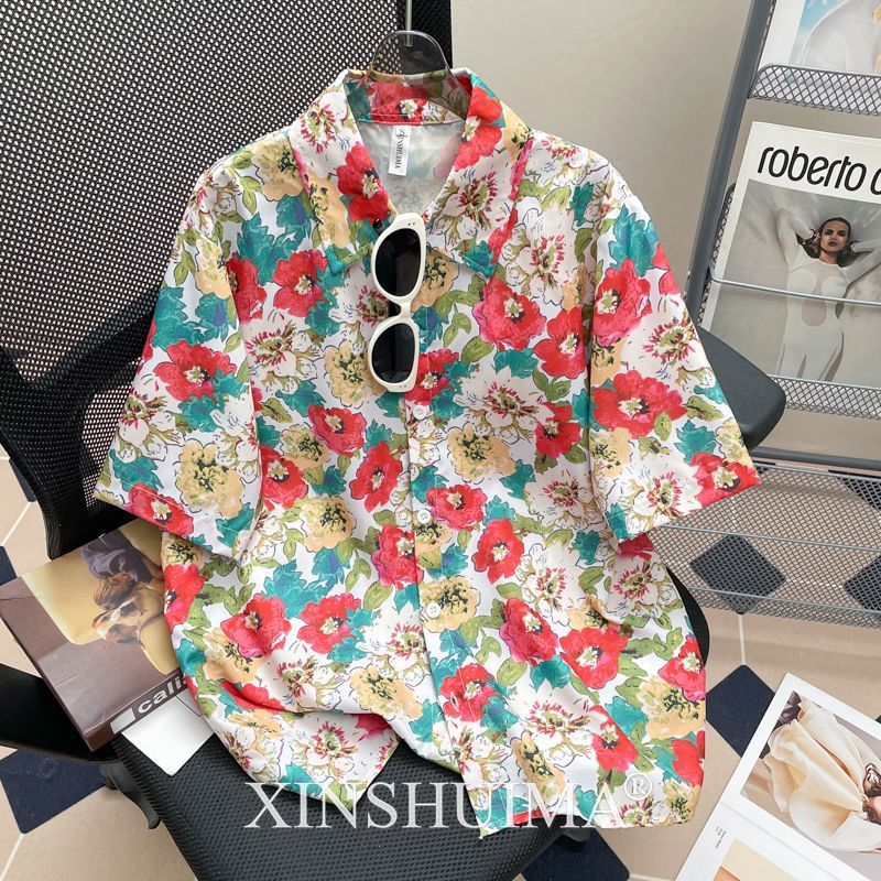 여성을위한 복고풍 홍콩 스타일 꽃 프린트 반팔 셔츠 여름 틈새 디자인 세련된 개성 느슨한 슬림 셔츠