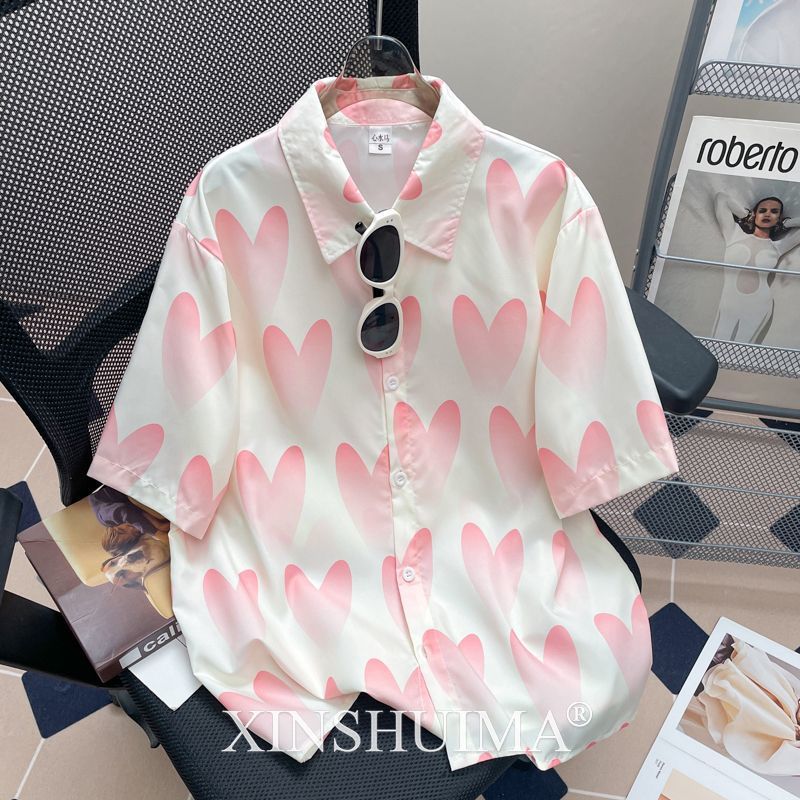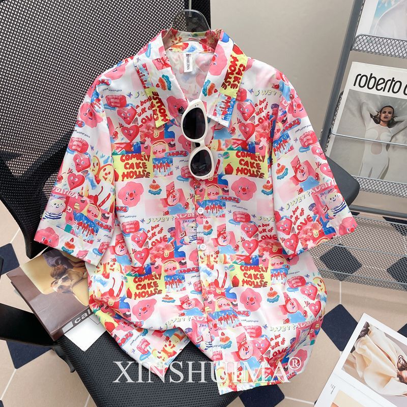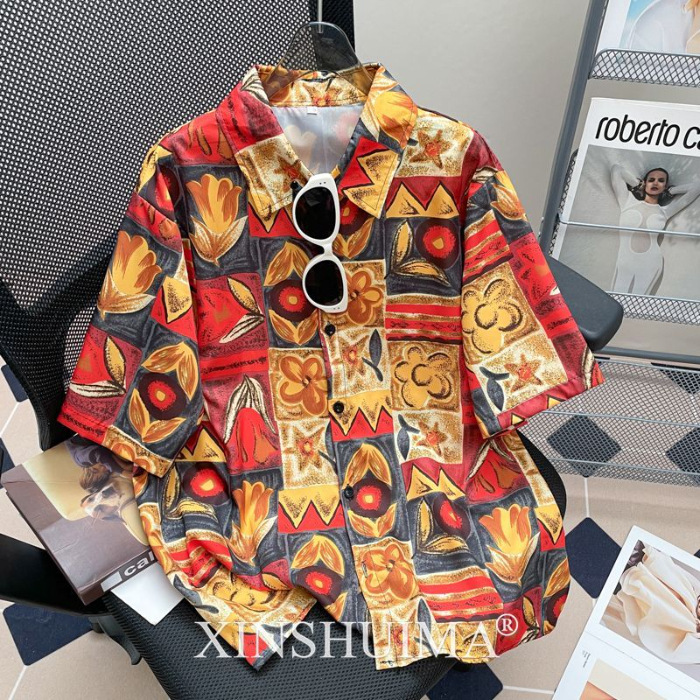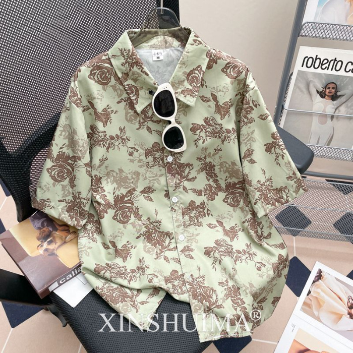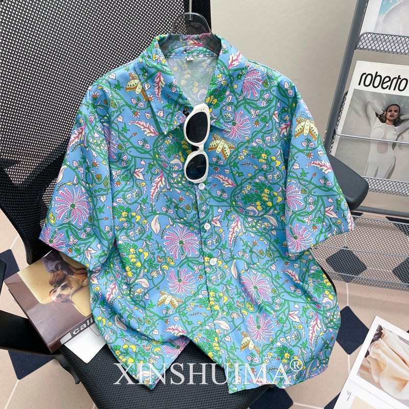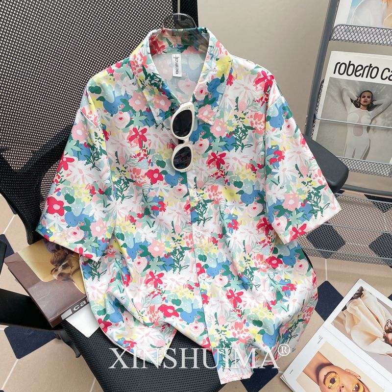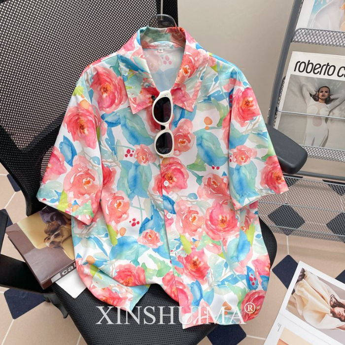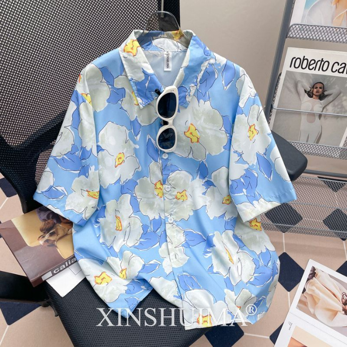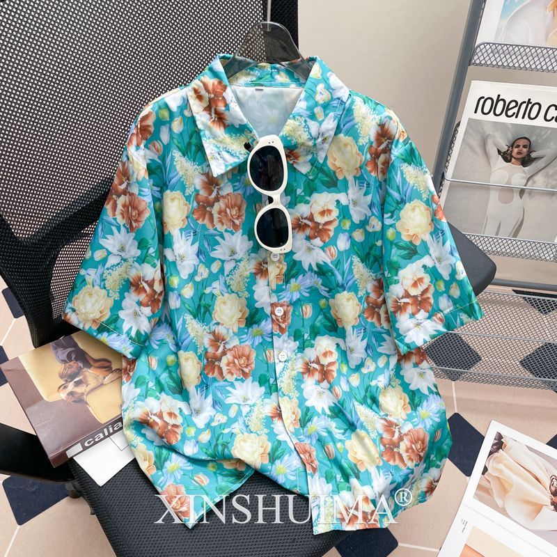 여성을위한 복고풍 홍콩 스타일 꽃 프린트 반팔 셔츠 여름 틈새 디자인 세련된 개성 느슨한 슬림 셔츠