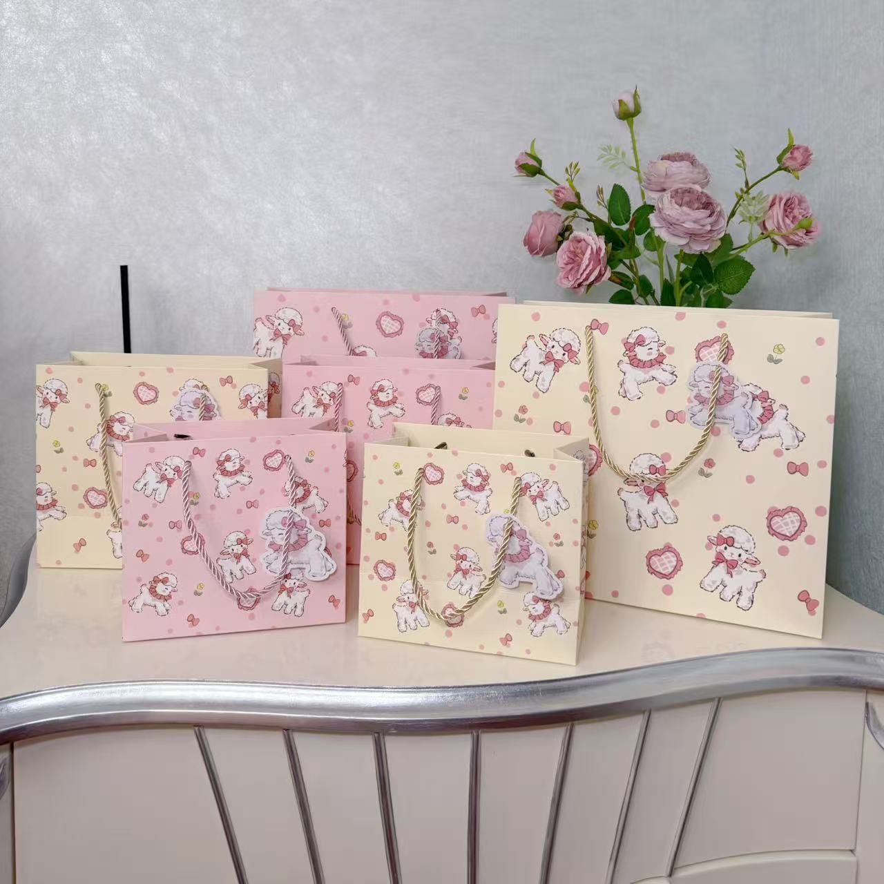 • 핑크 양고기 선물 가방(엘리베이터 카드 포함, 흰색 판지, 중간 크기 22*10*20cm)