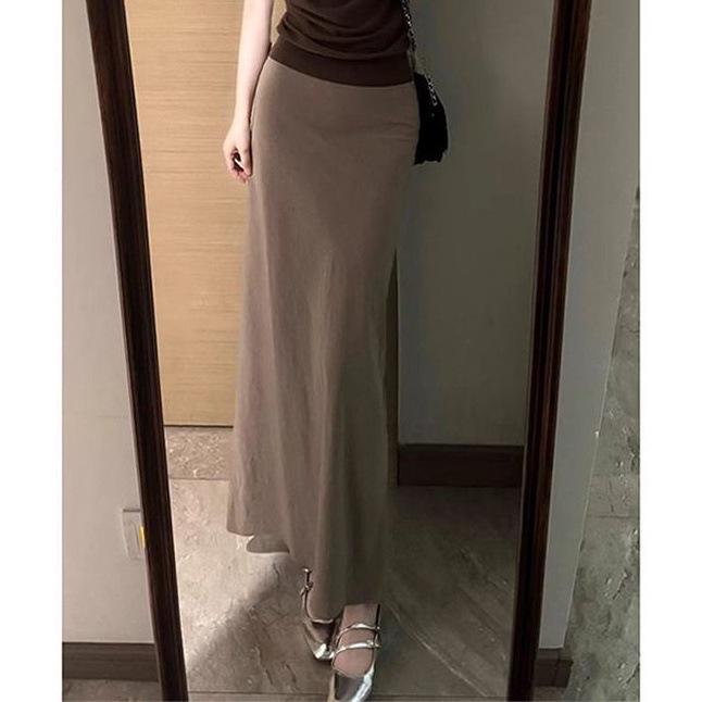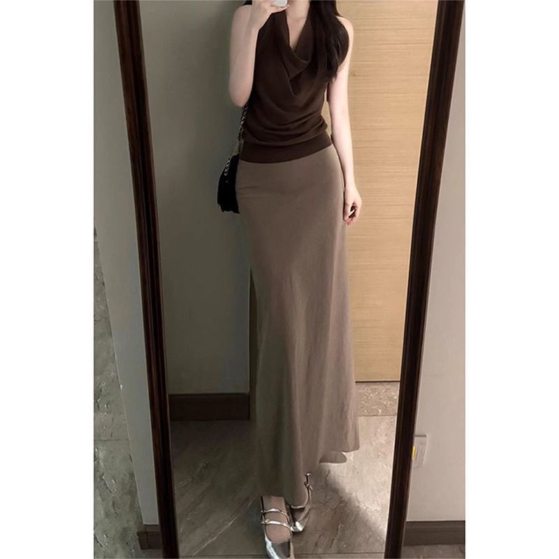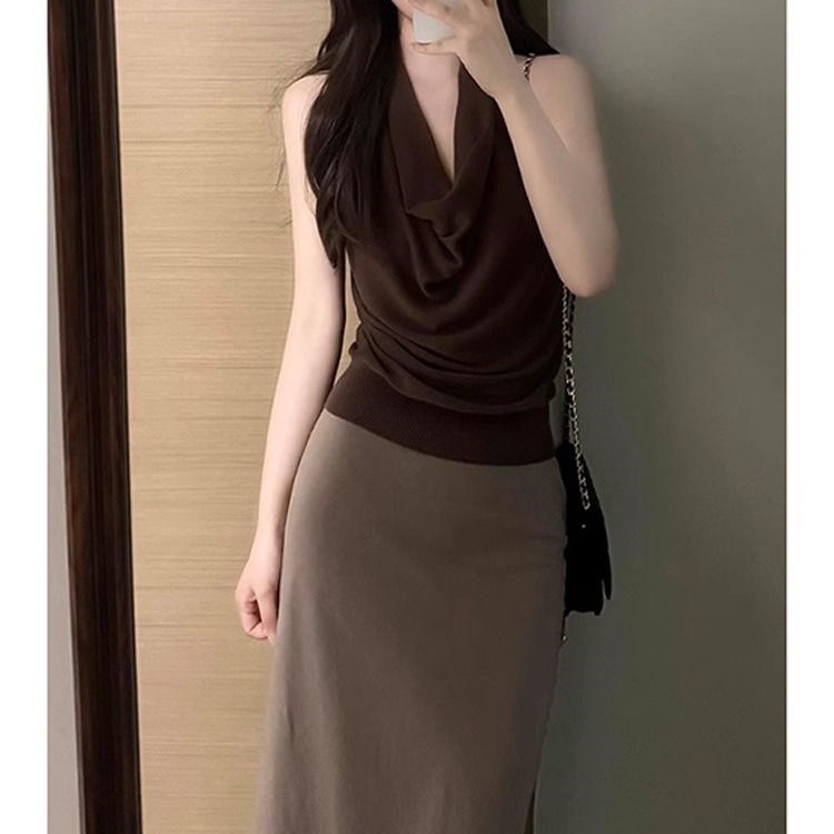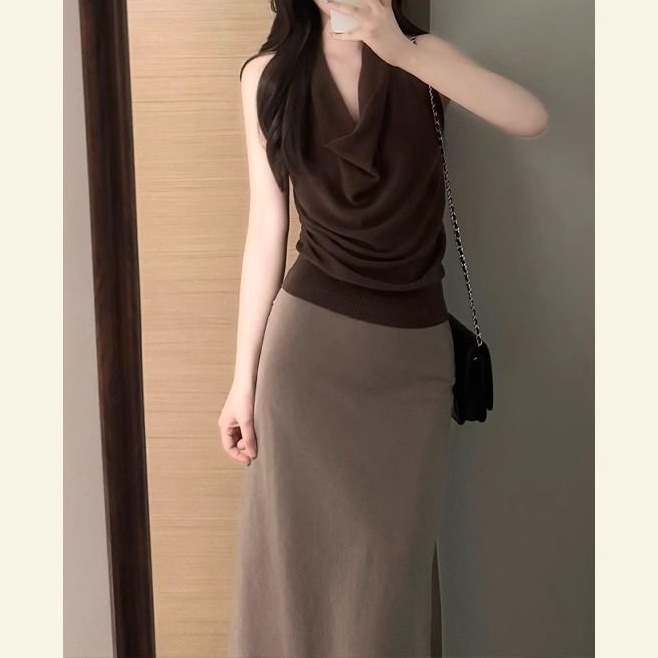 여름 신작 커피 컬러 슬림핏 민소매 탑 여성용 한국 시크 하이엔드 스윙 칼라 니트 조끼 티셔츠