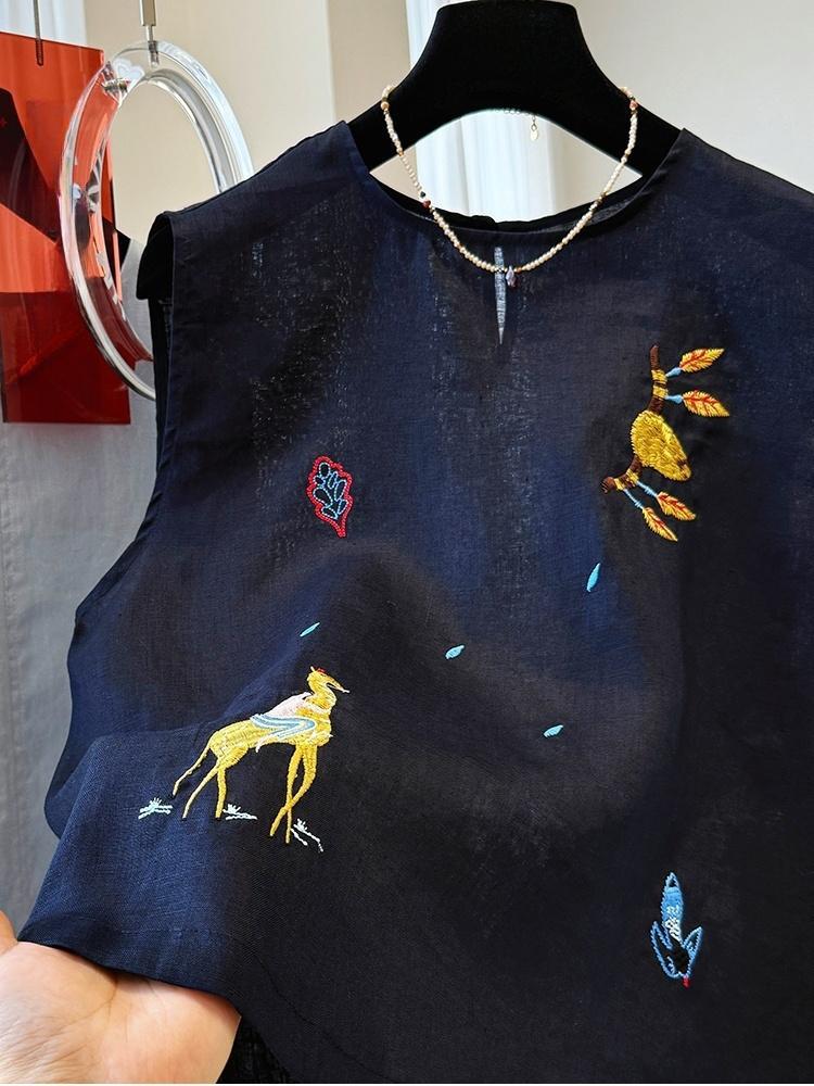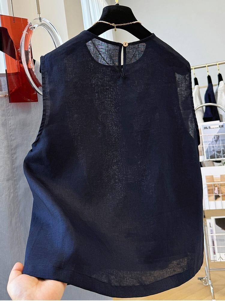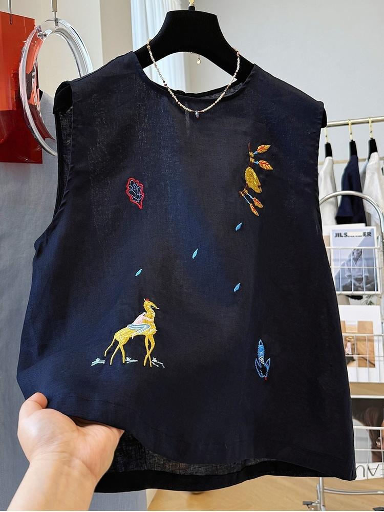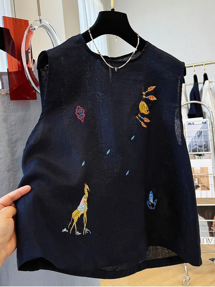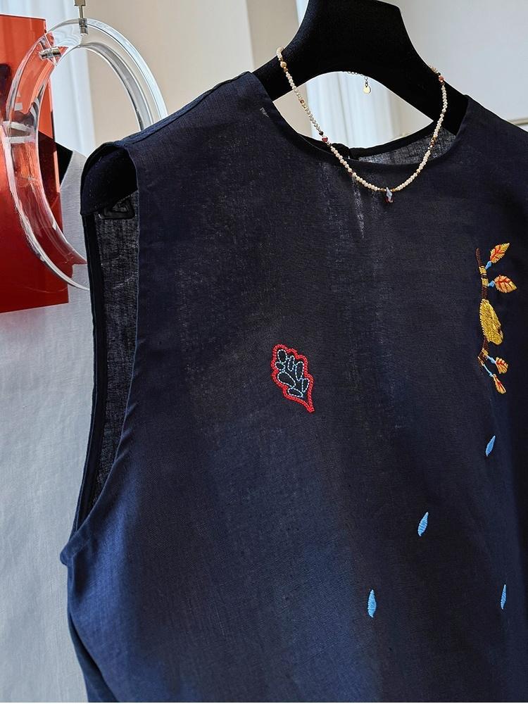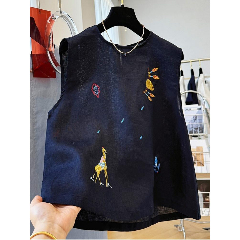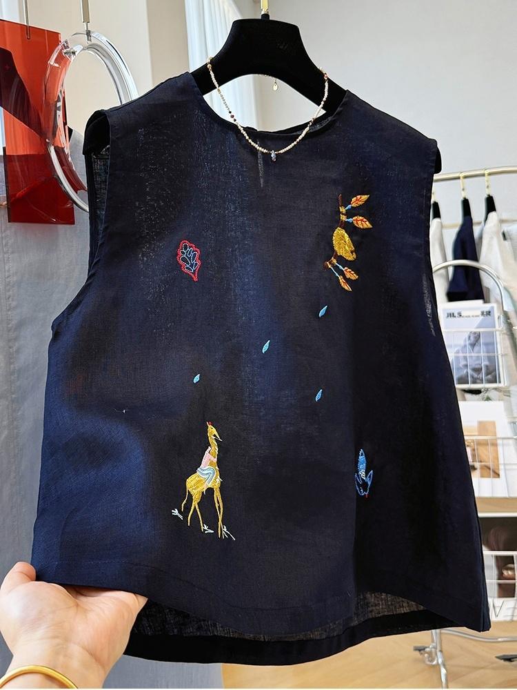 여름에 입기 좋은 여성용 중공업 자수 한국식 독특하고 아름다운 민소매 린넨 탑, 외투 조끼