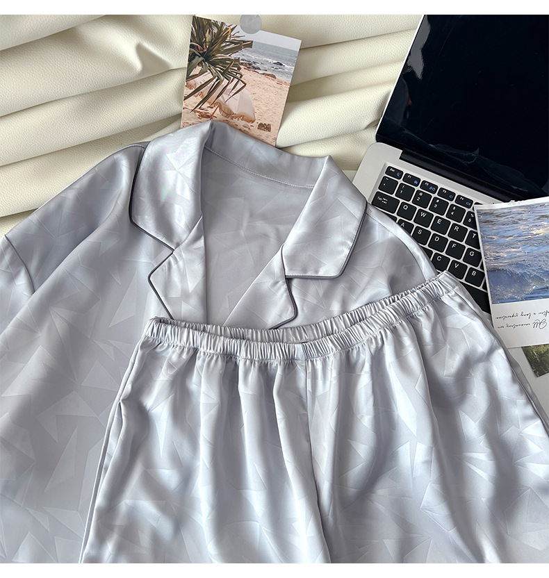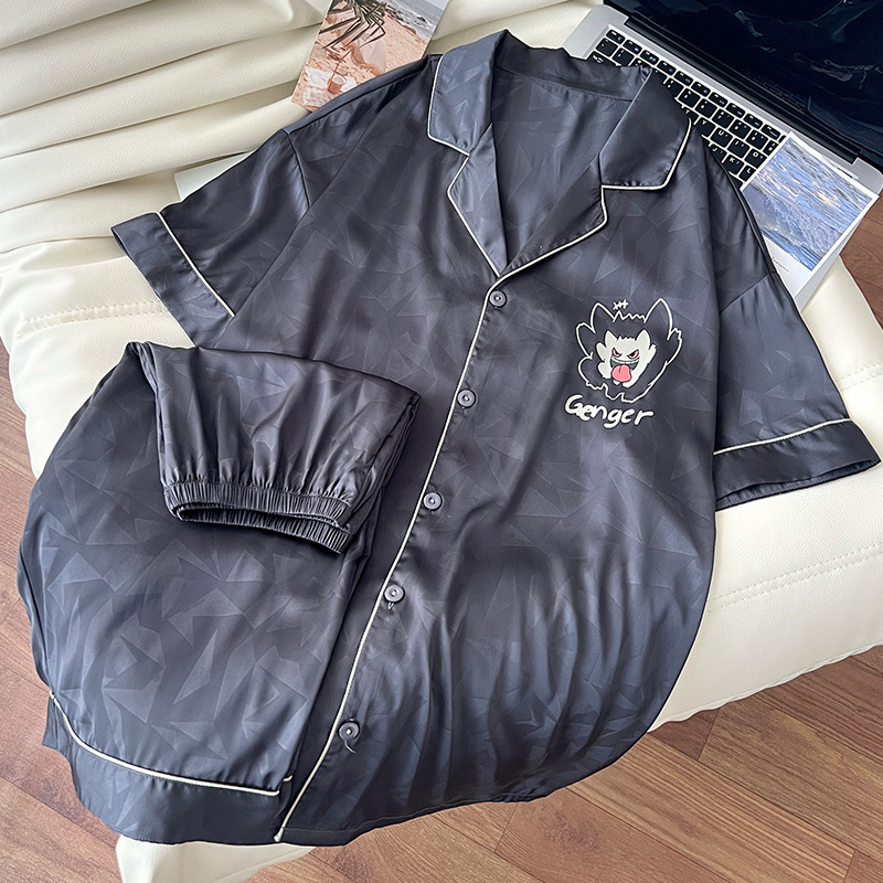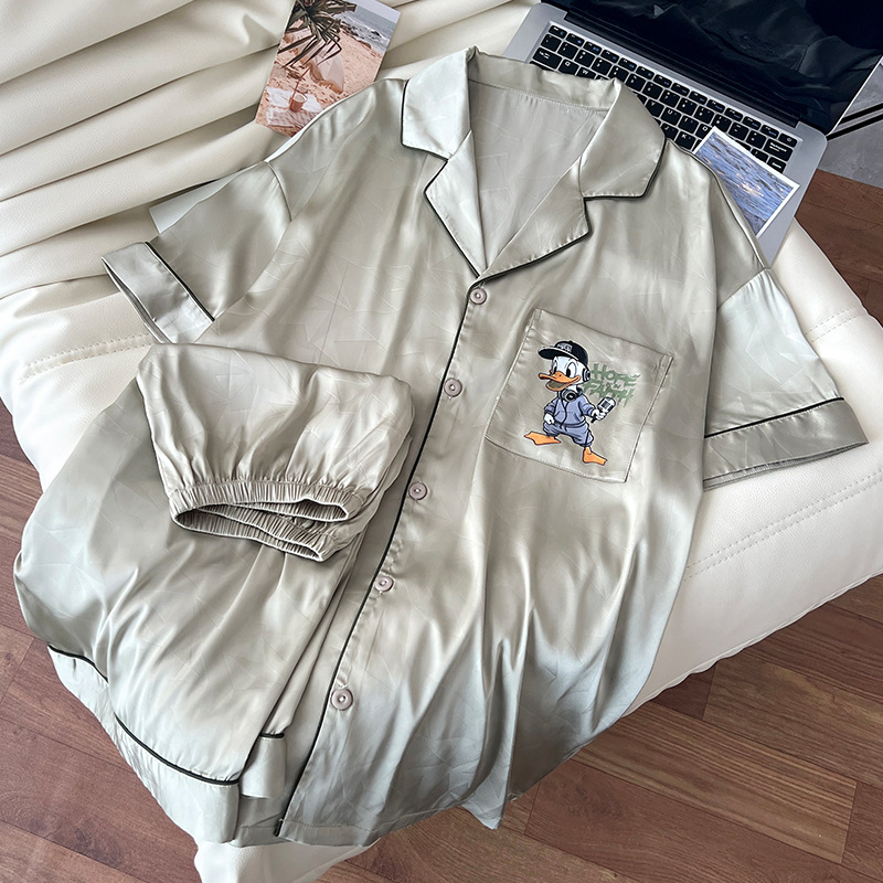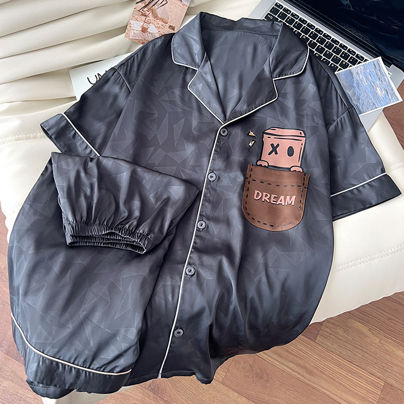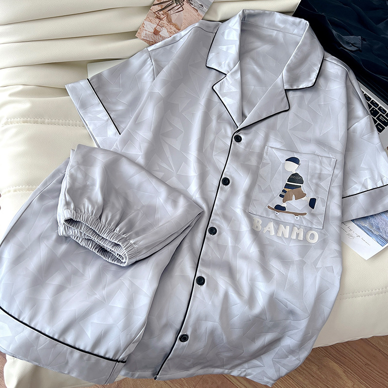 아이스 실크 잠옷 남성 여름 새로운 반팔 얇은 옷깃 만화 청소년 남성 캐주얼 홈웨어 세트는 밖에서 착용 가능