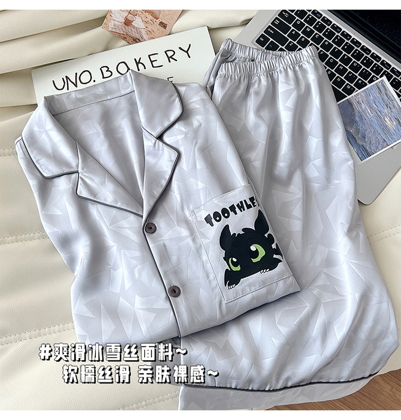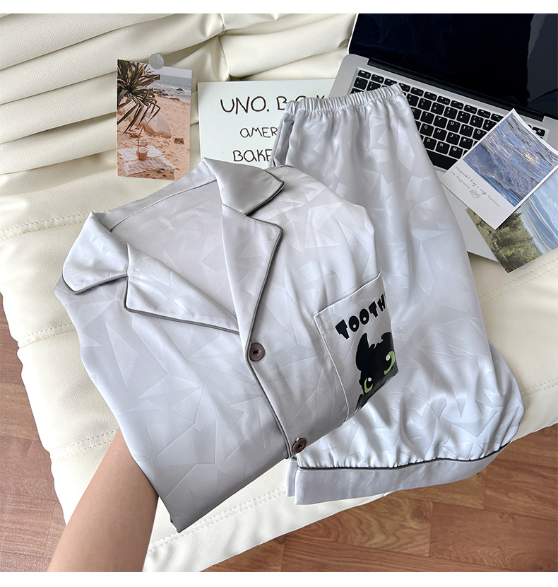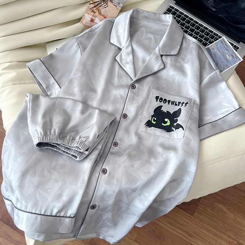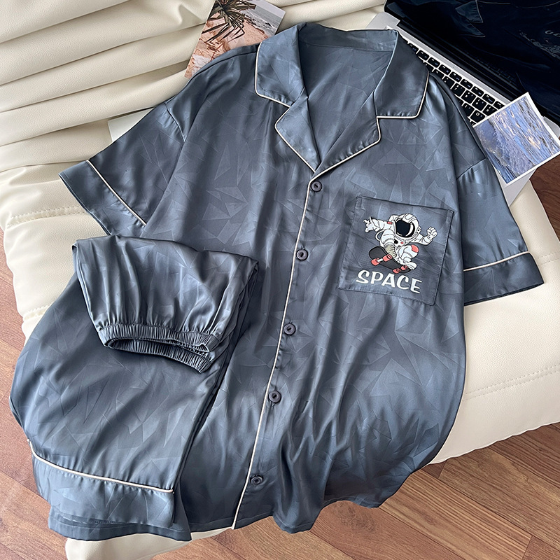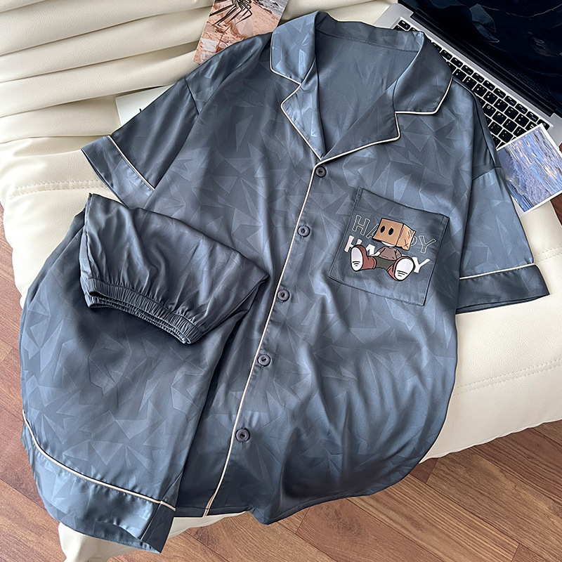 아이스 실크 잠옷 남성 여름 새로운 반팔 얇은 옷깃 만화 청소년 남성 캐주얼 홈웨어 세트는 밖에서 착용 가능스토어 가기
