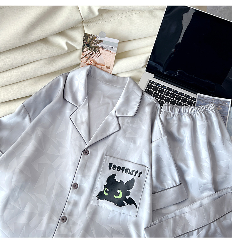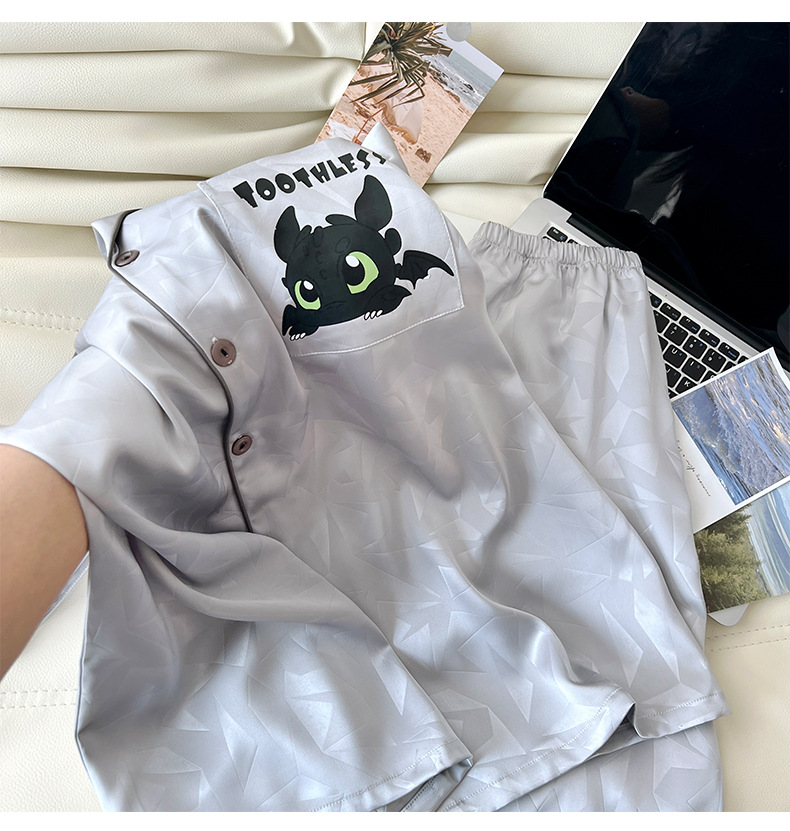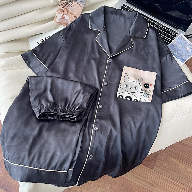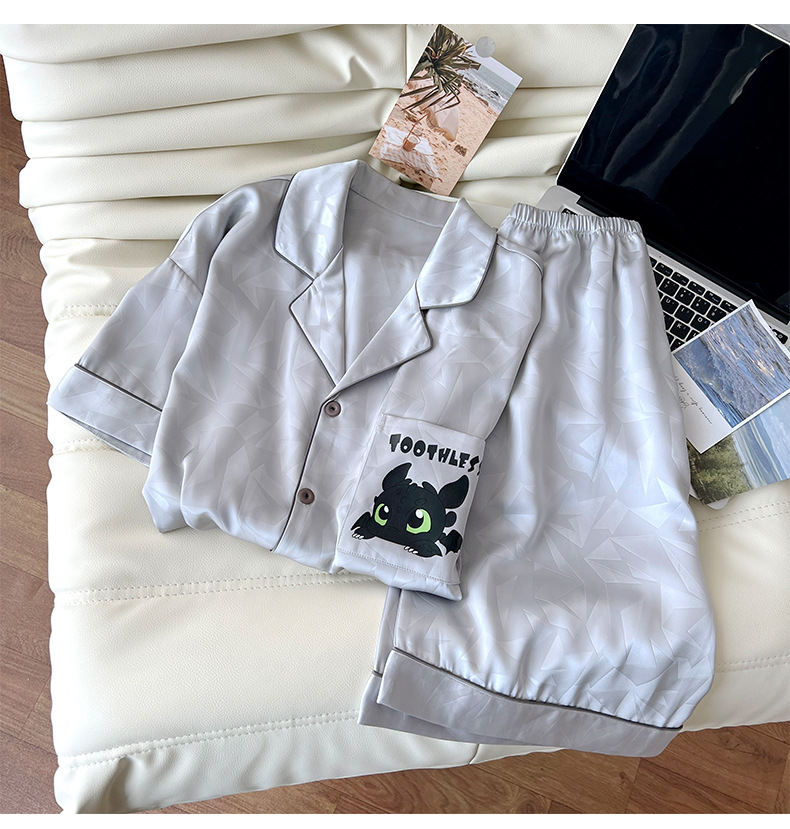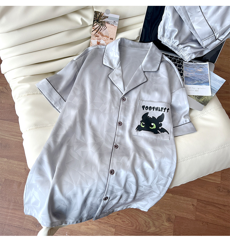 아이스 실크 잠옷 남성 여름 새로운 반팔 얇은 옷깃 만화 청소년 남성 캐주얼 홈웨어 세트는 밖에서 착용 가능스토어 가기
