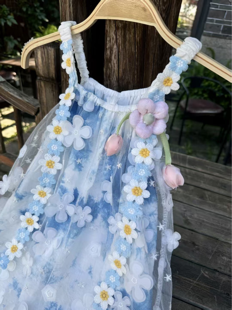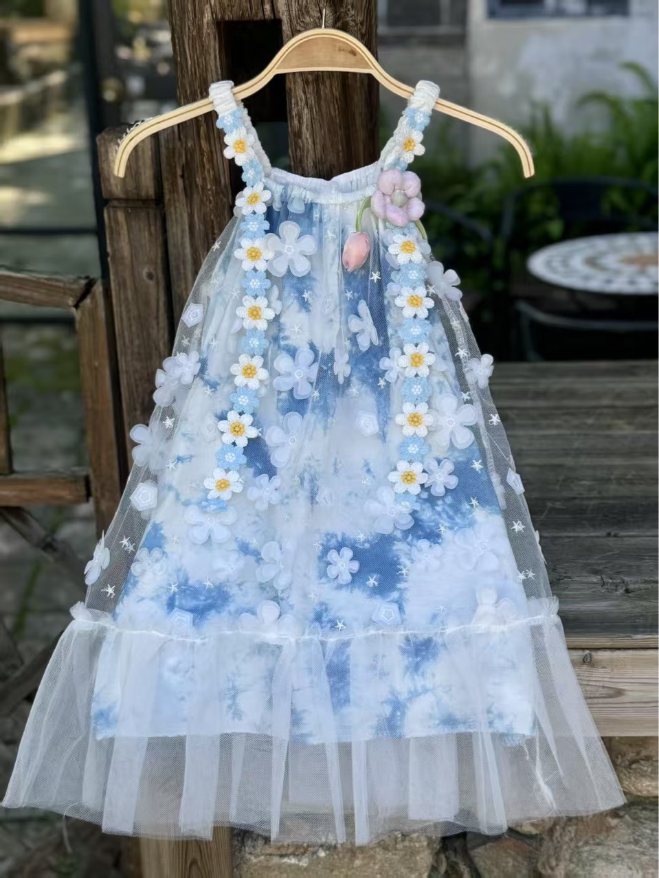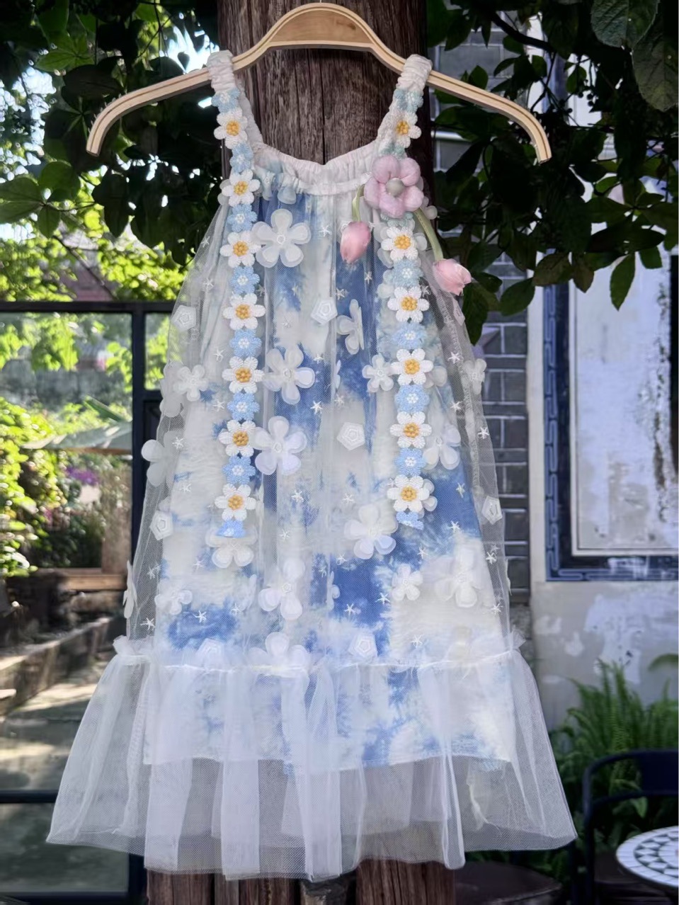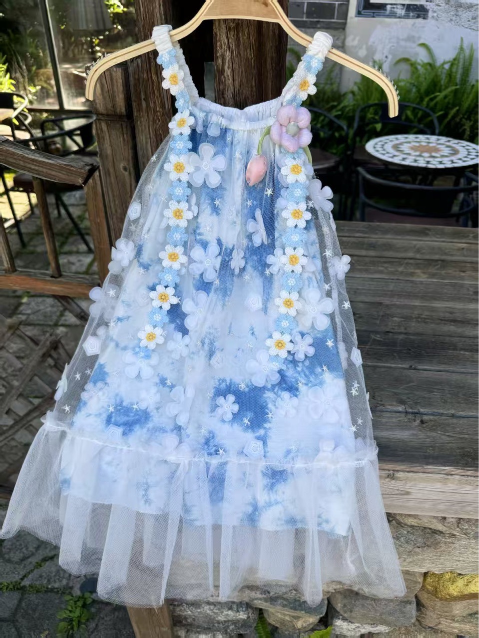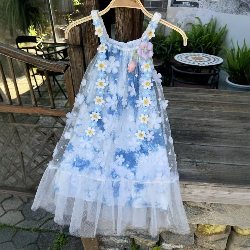 아동복 신제품 여아 여름 입체 꽃 메쉬 드레스 2025 새로운 스타일