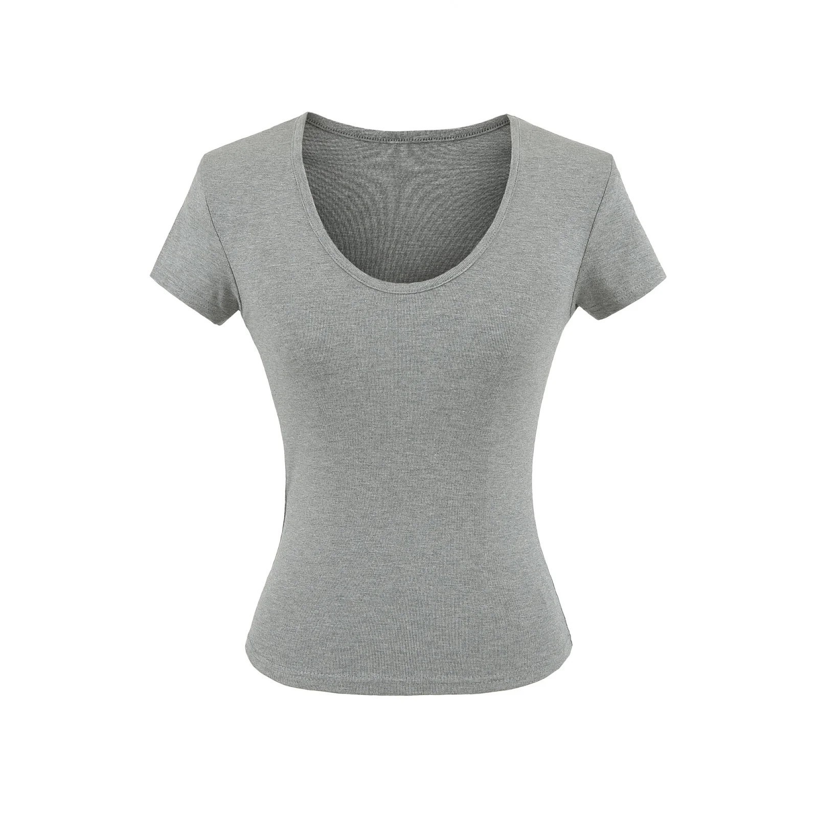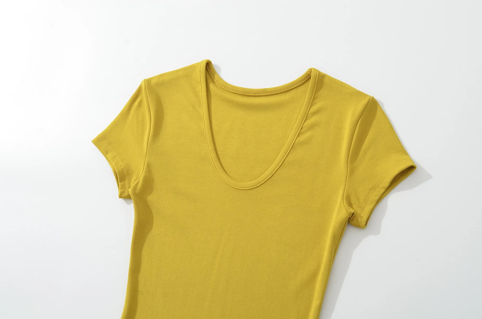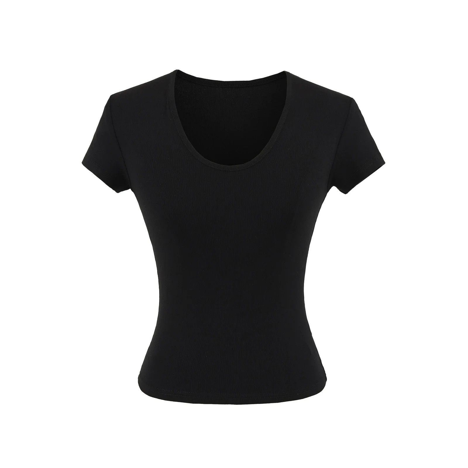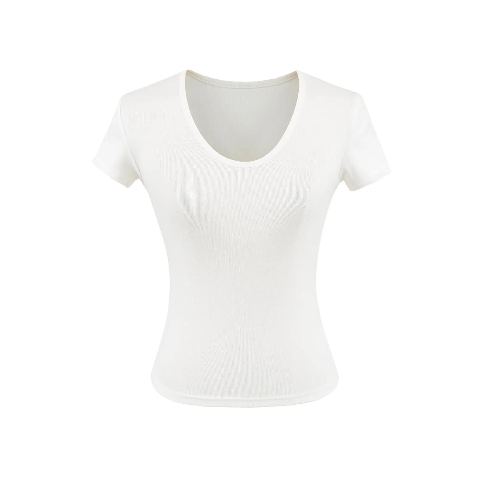 솔리드 컬러 기본 대형 U 넥 모래시계 허리 티셔츠 도매 카다시안 슬림핏 스트레치 오른쪽 어깨 여성용 반팔 탑스토어 가기