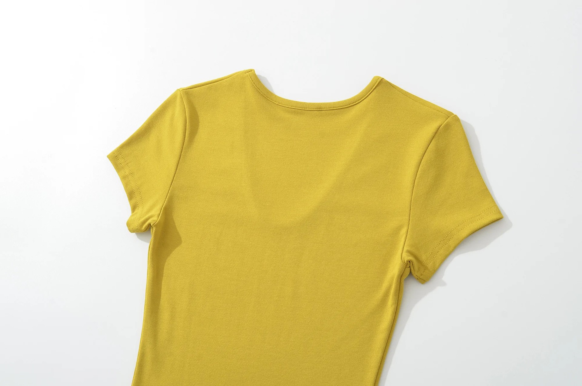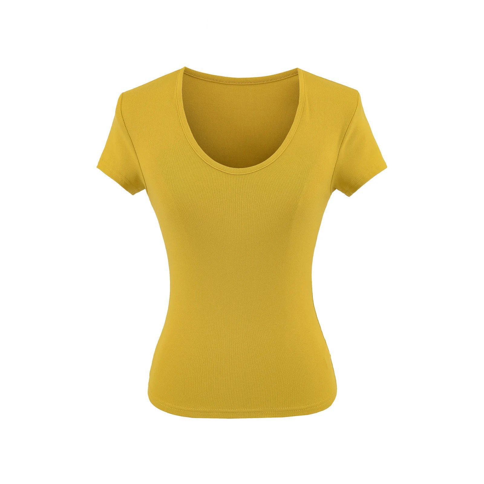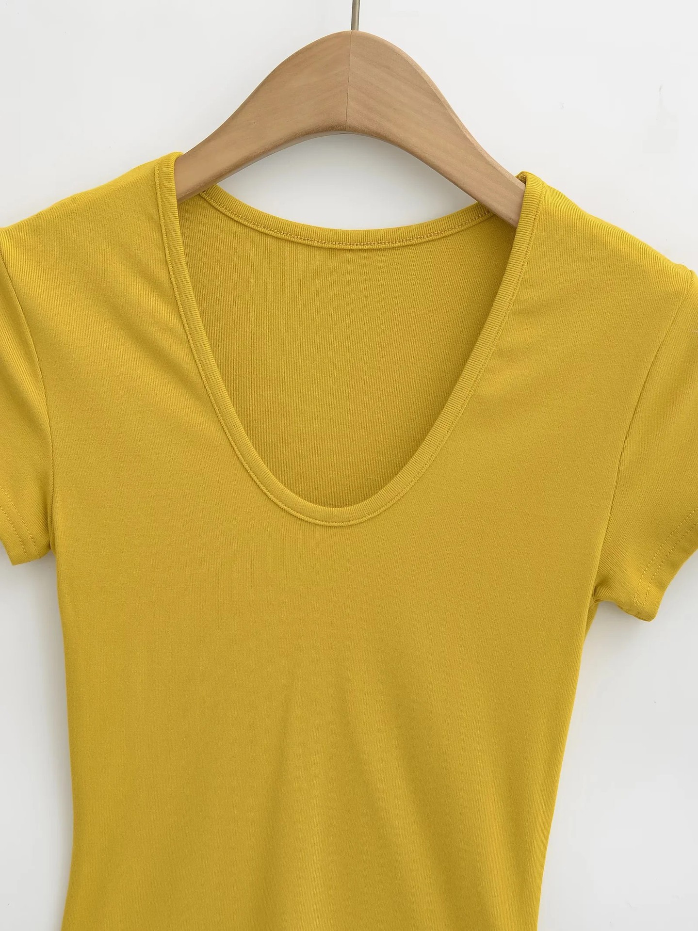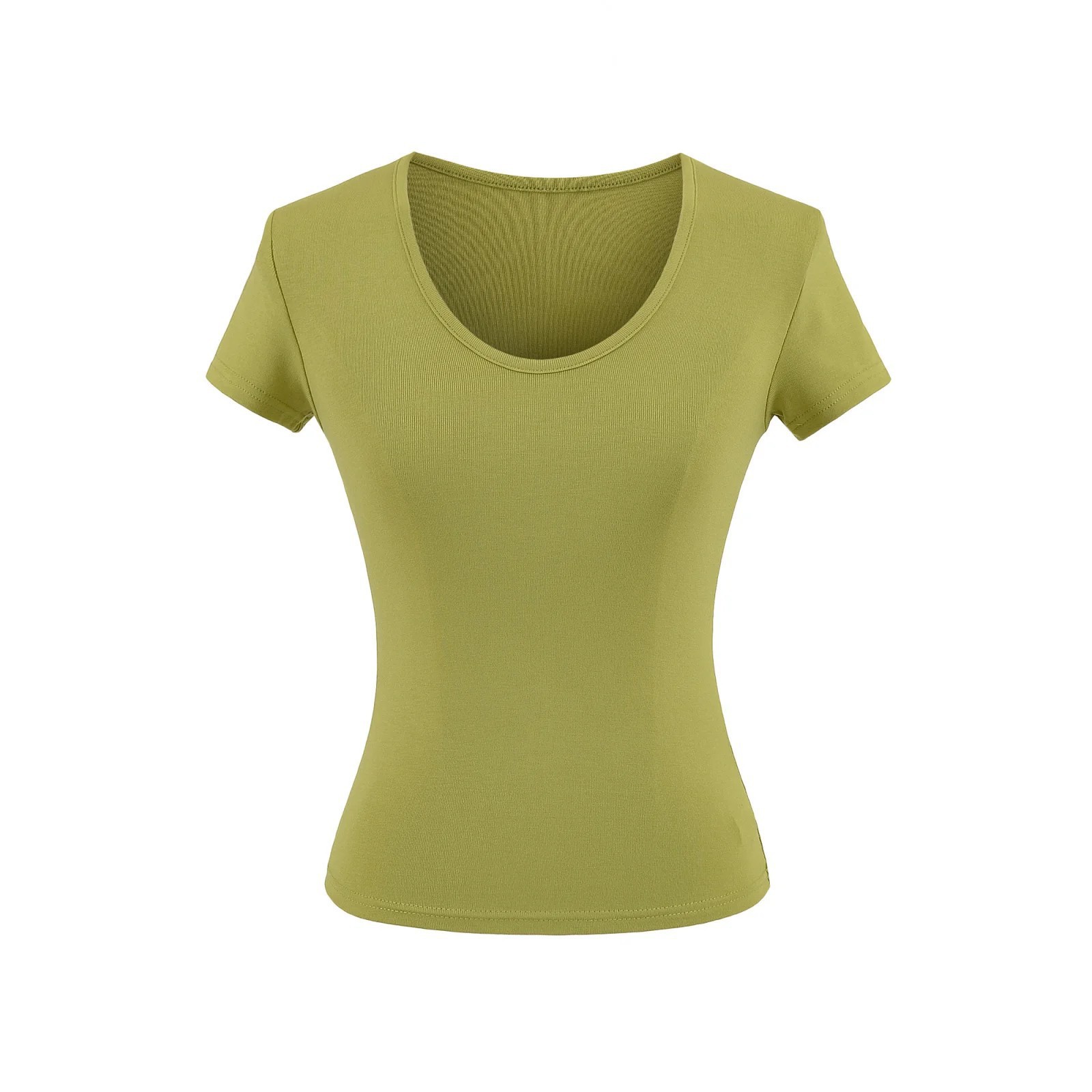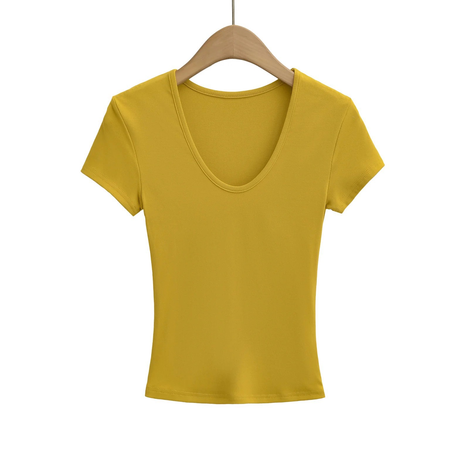솔리드 컬러 기본 대형 U 넥 모래시계 허리 티셔츠 도매 카다시안 슬림핏 스트레치 오른쪽 어깨 여성용 반팔 탑스토어 가기