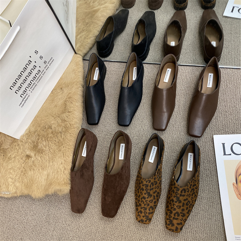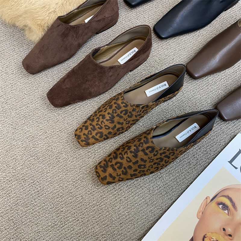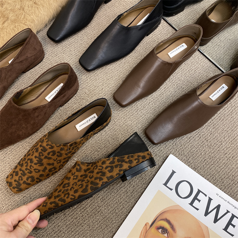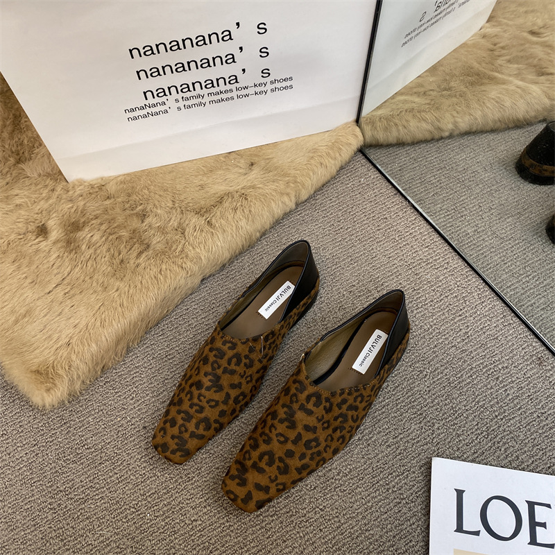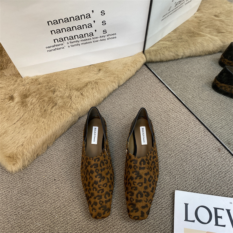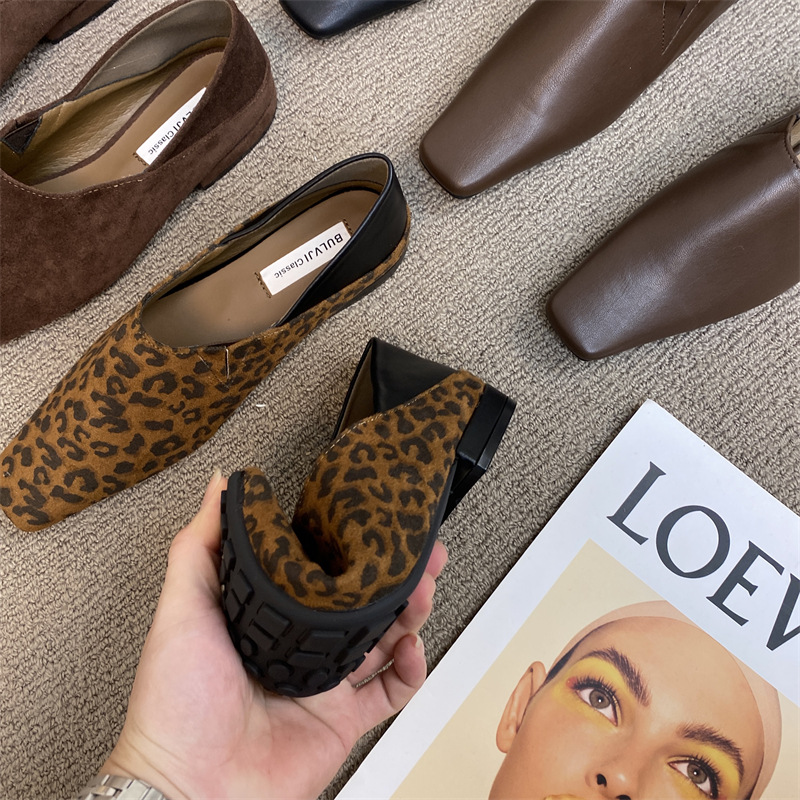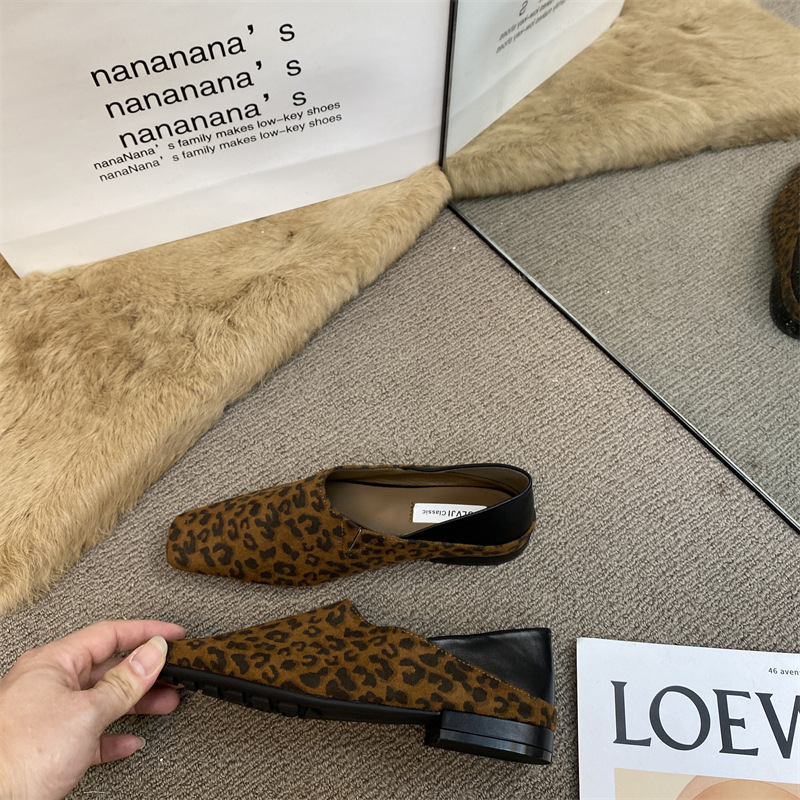 2024 봄과 가을 새로운 스타일 스퀘어 토 레오파드 프린트 로우 힐 슬립 온 신발 여성 한국어 버전 두꺼운 힐 작은 가죽 신발스토어 가기