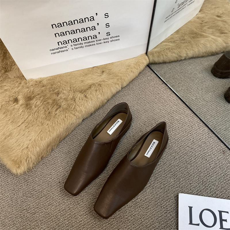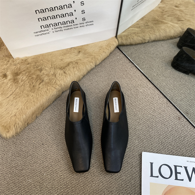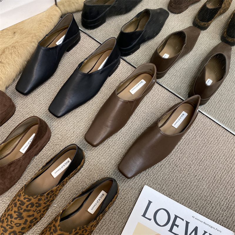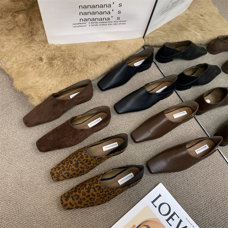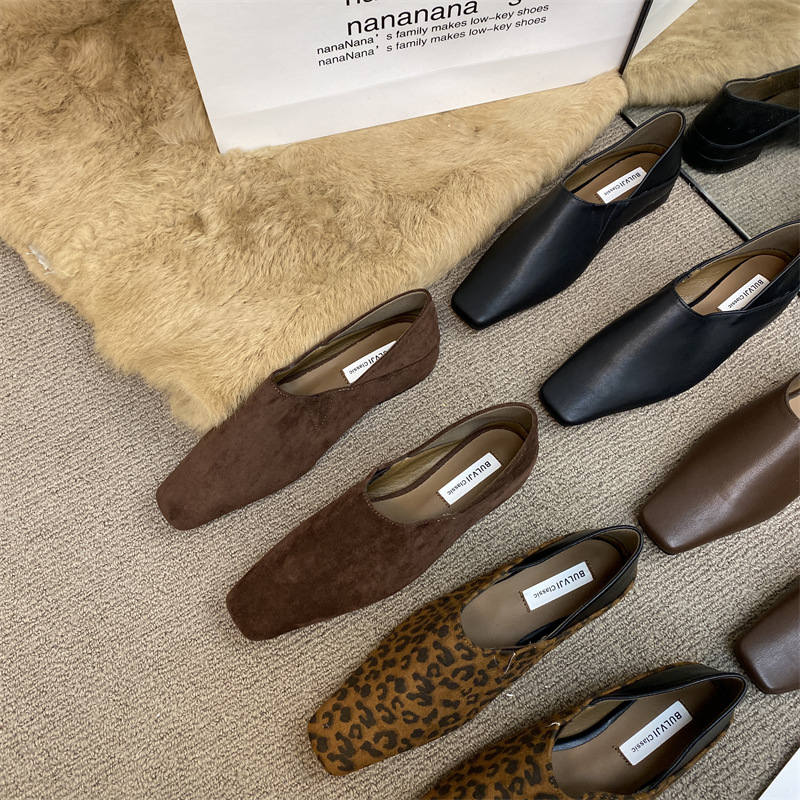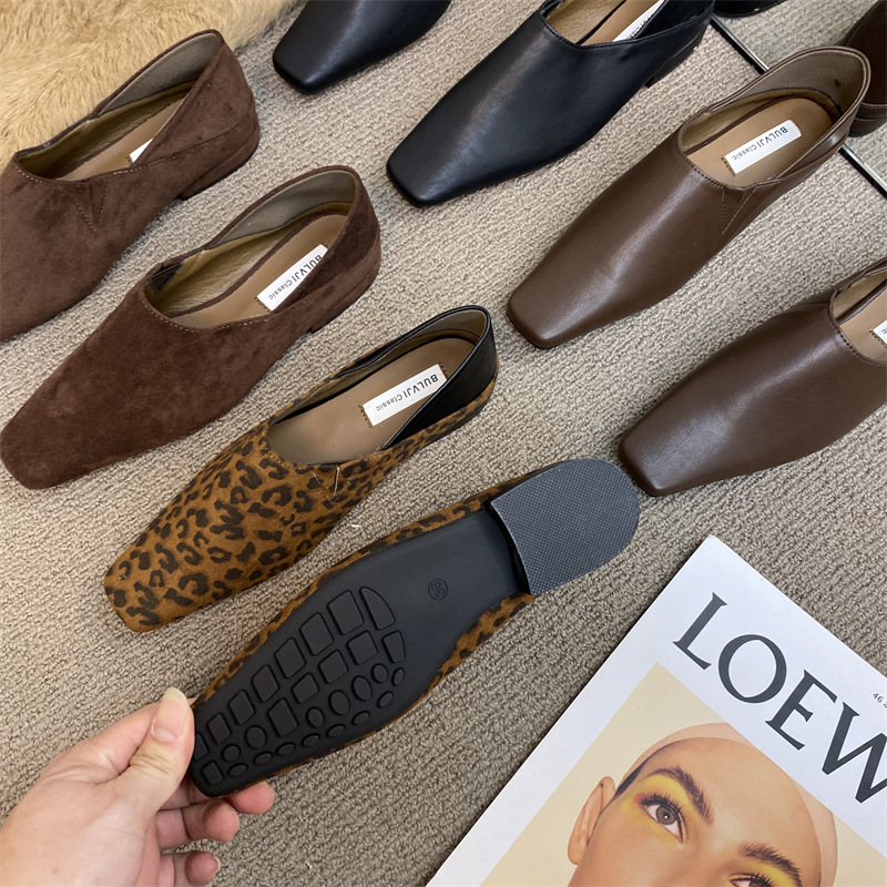 2024 봄과 가을 새로운 스타일 스퀘어 토 레오파드 프린트 로우 힐 슬립 온 신발 여성 한국어 버전 두꺼운 힐 작은 가죽 신발스토어 가기