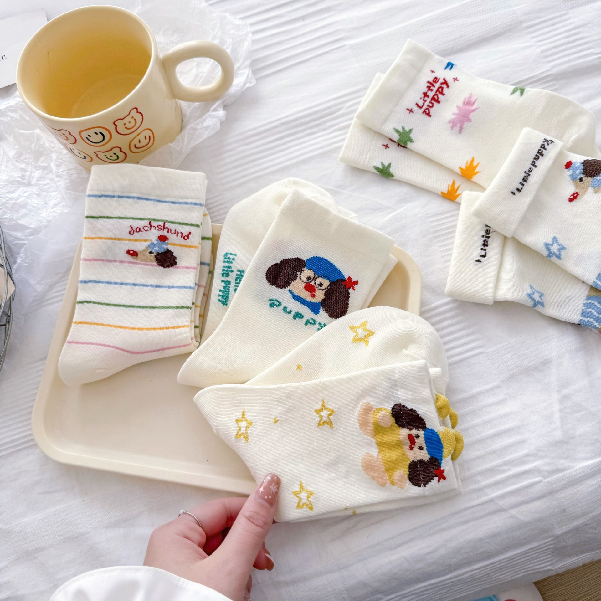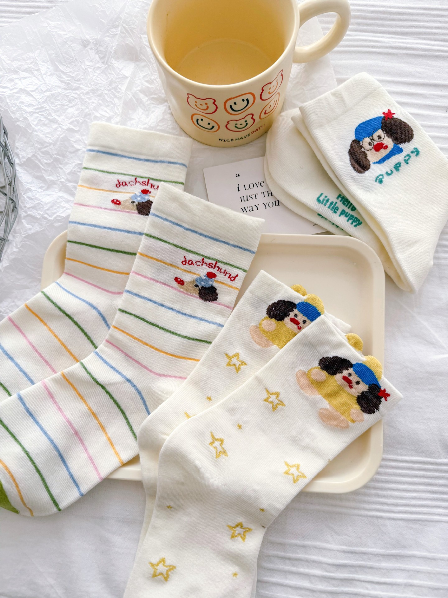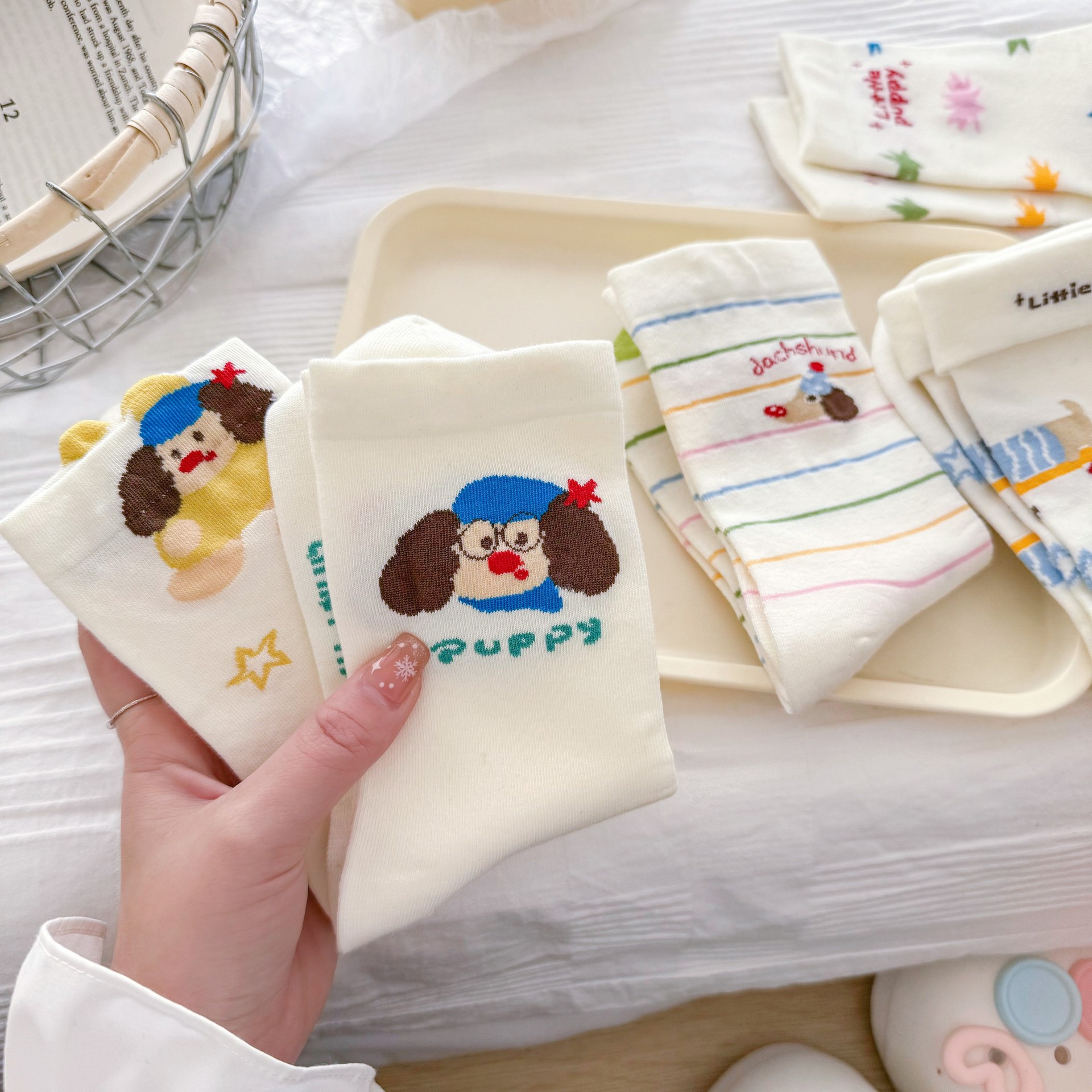 여성을위한 귀여운 닥스훈트 강아지 양말 봄과 여름 대학 스타일 일본 일러스트 만화 줄무늬 대학 스타일 여름 스타킹스토어 가기