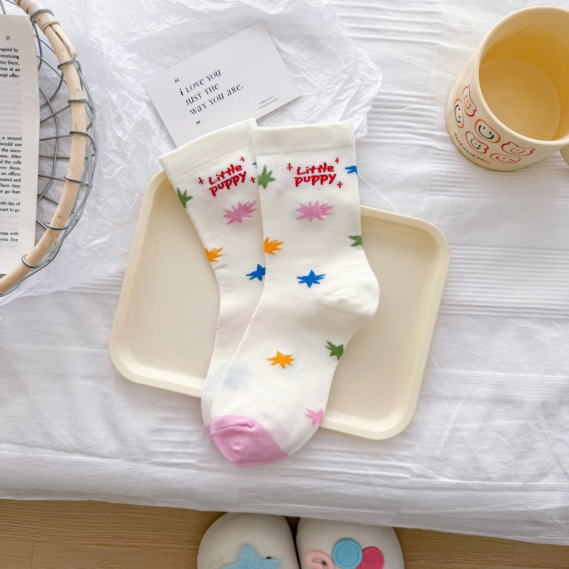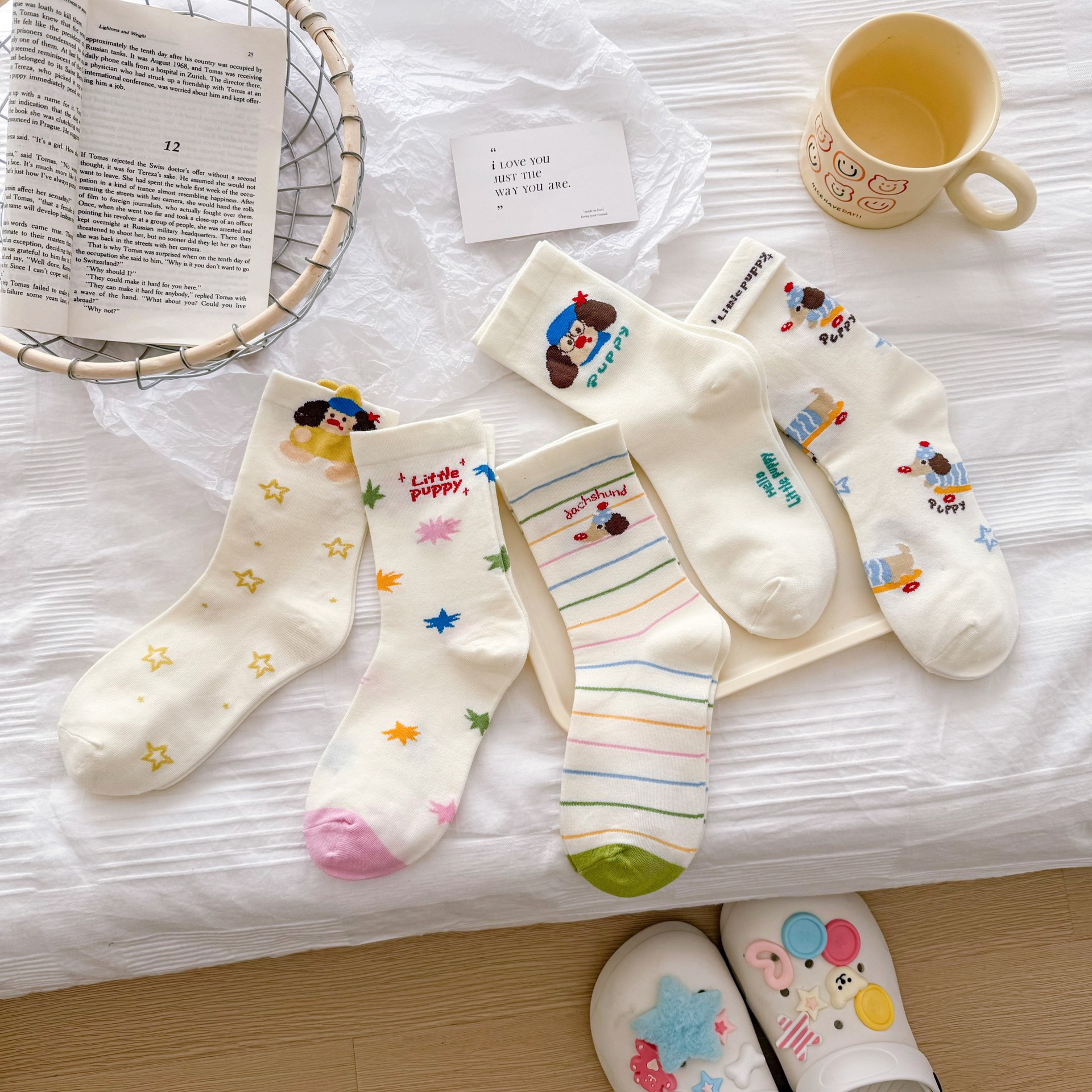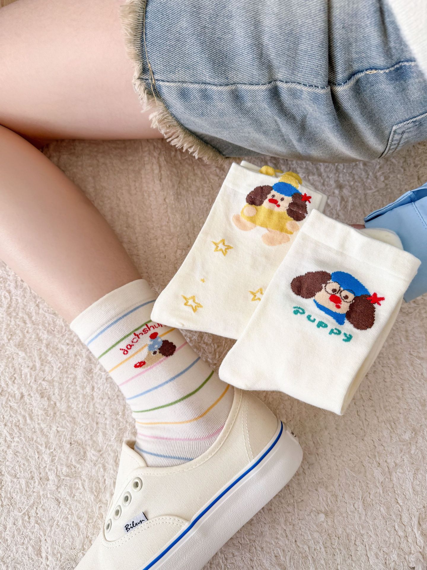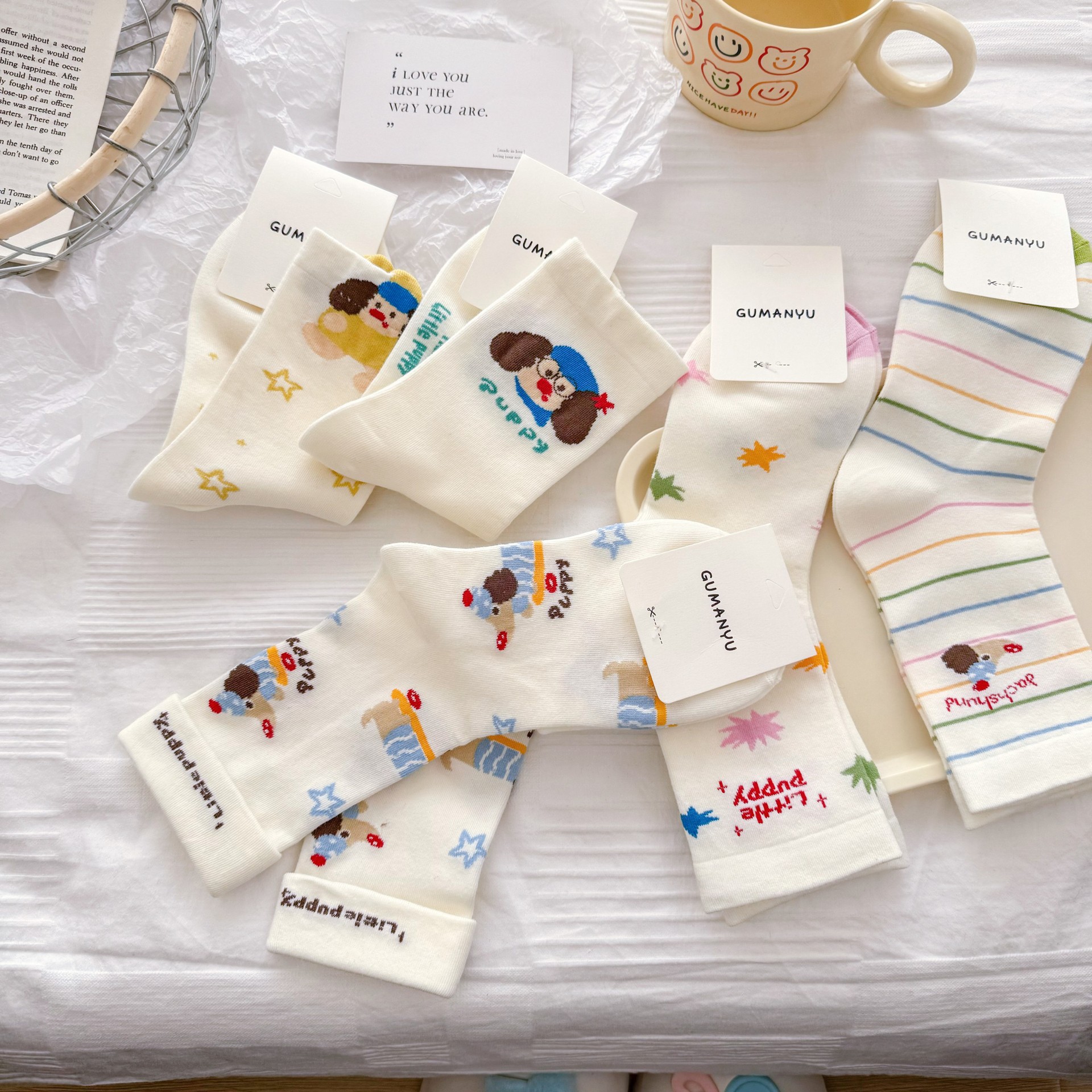 여성을위한 귀여운 닥스훈트 강아지 양말 봄과 여름 대학 스타일 일본 일러스트 만화 줄무늬 대학 스타일 여름 스타킹스토어 가기
