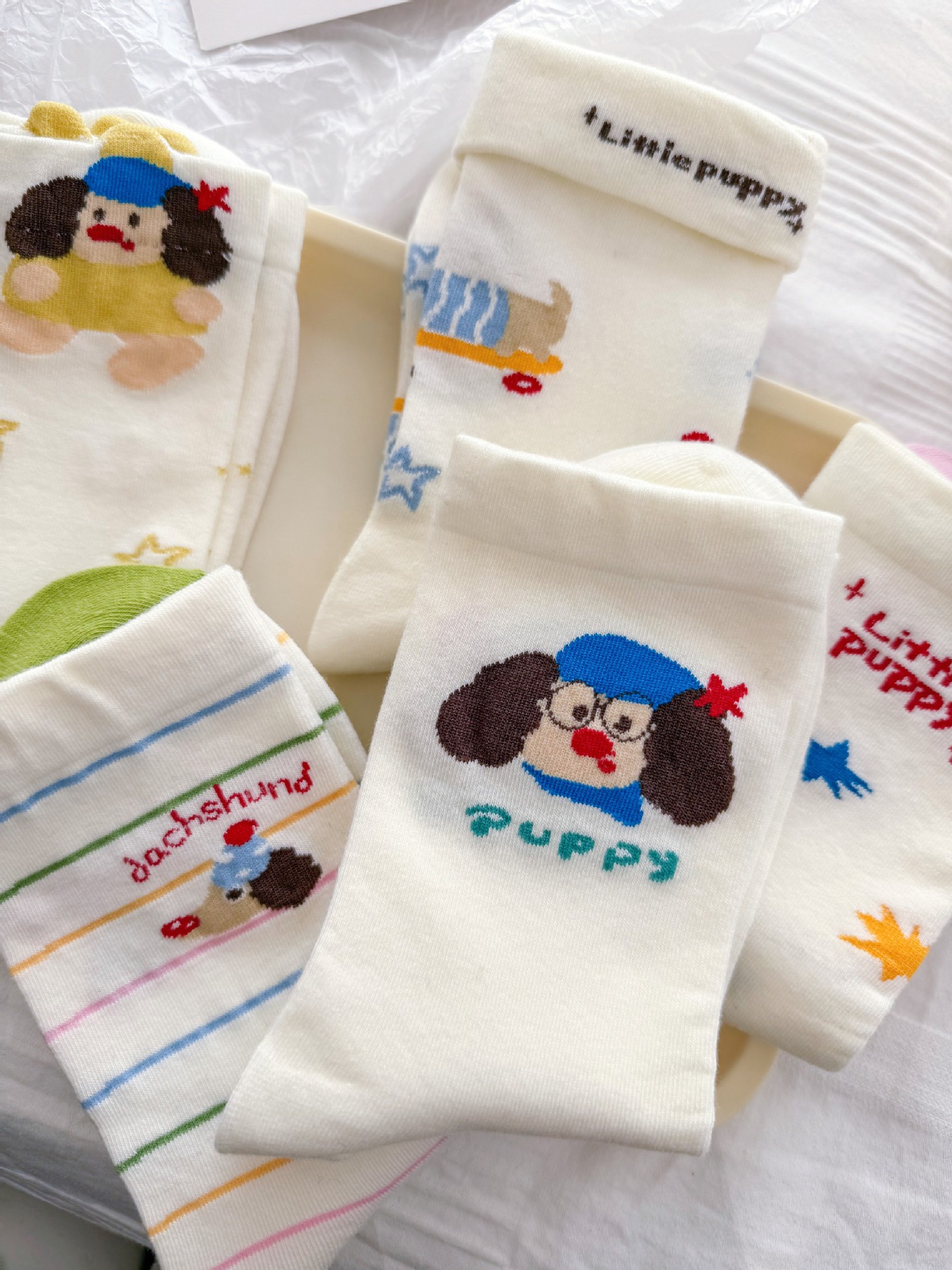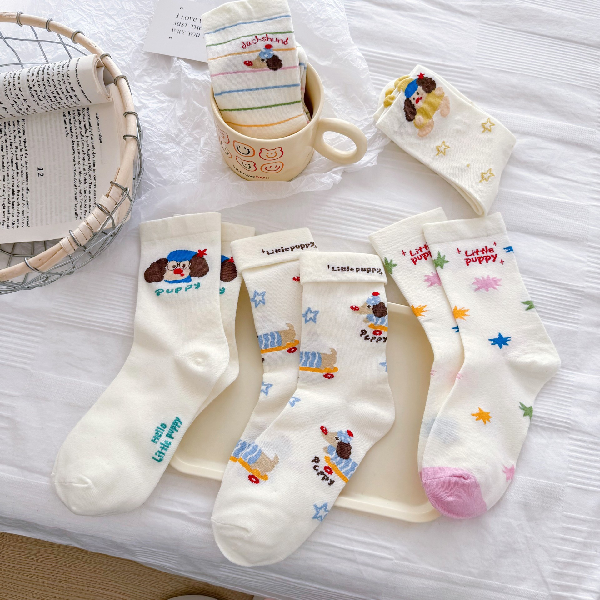 여성을위한 귀여운 닥스훈트 강아지 양말 봄과 여름 대학 스타일 일본 일러스트 만화 줄무늬 대학 스타일 여름 스타킹