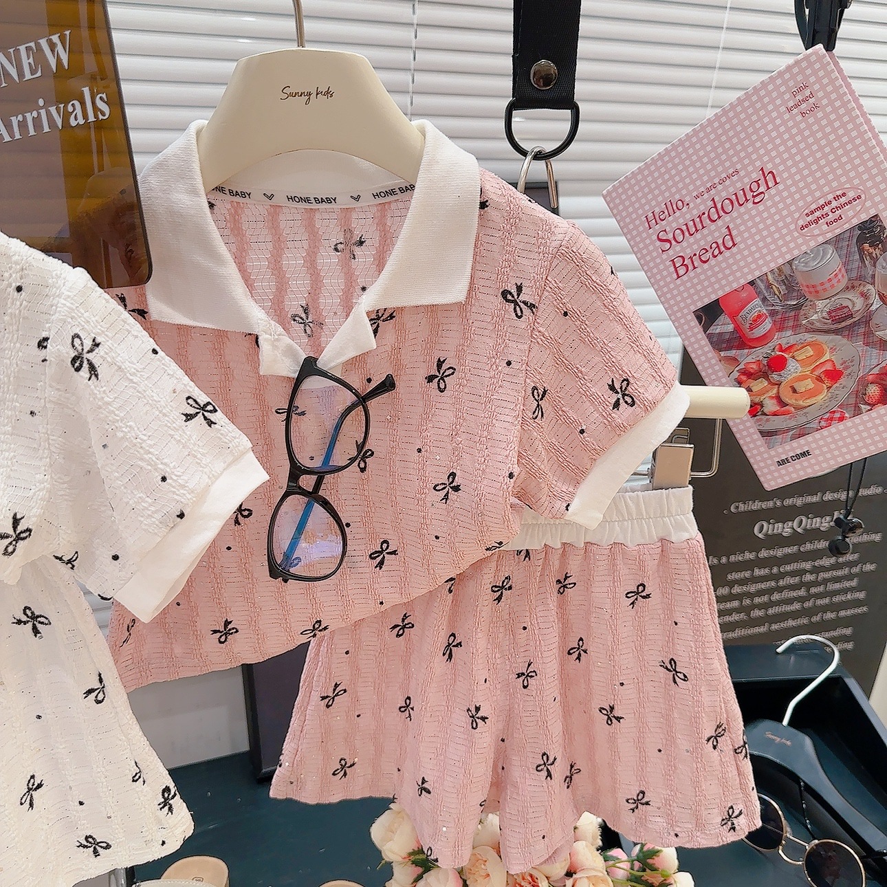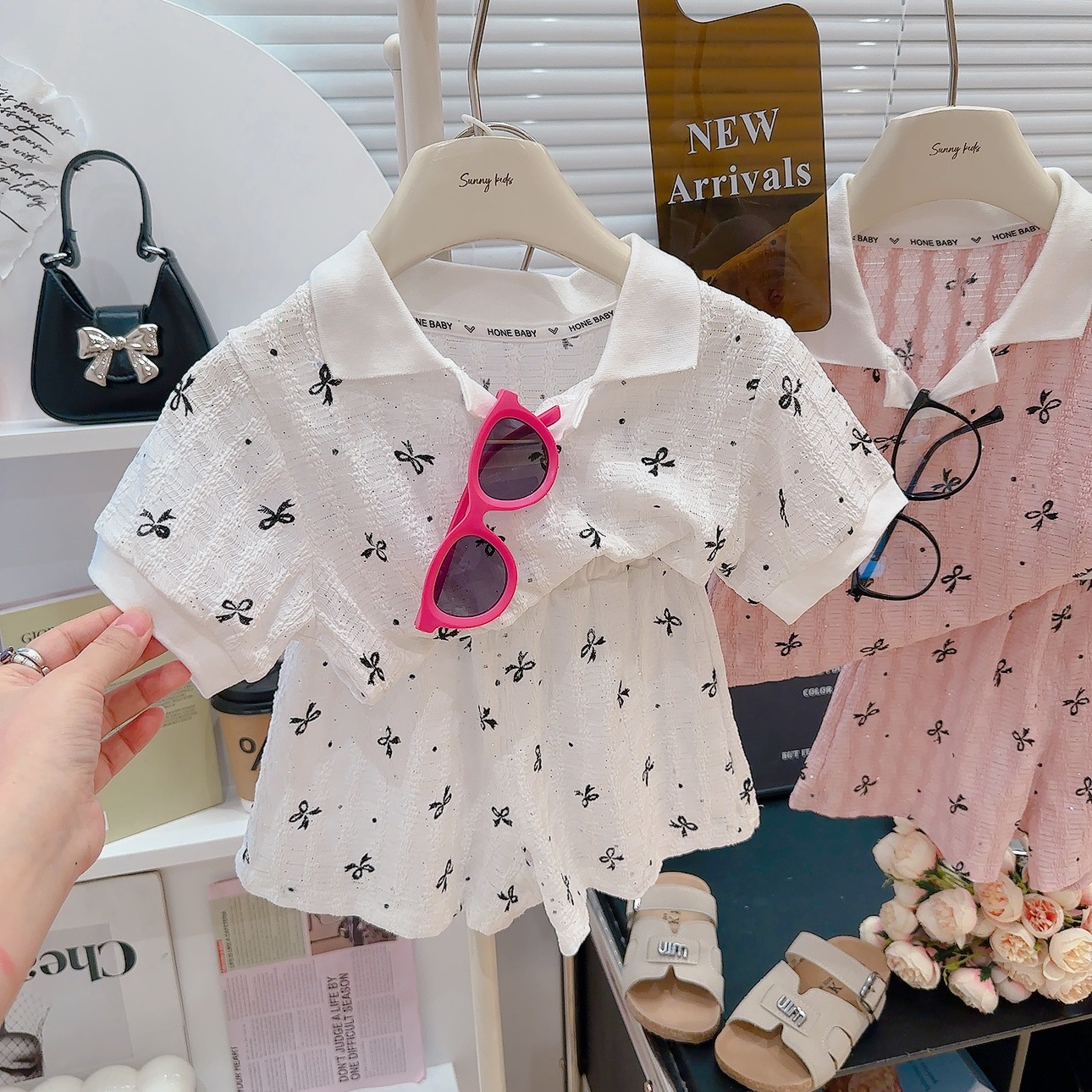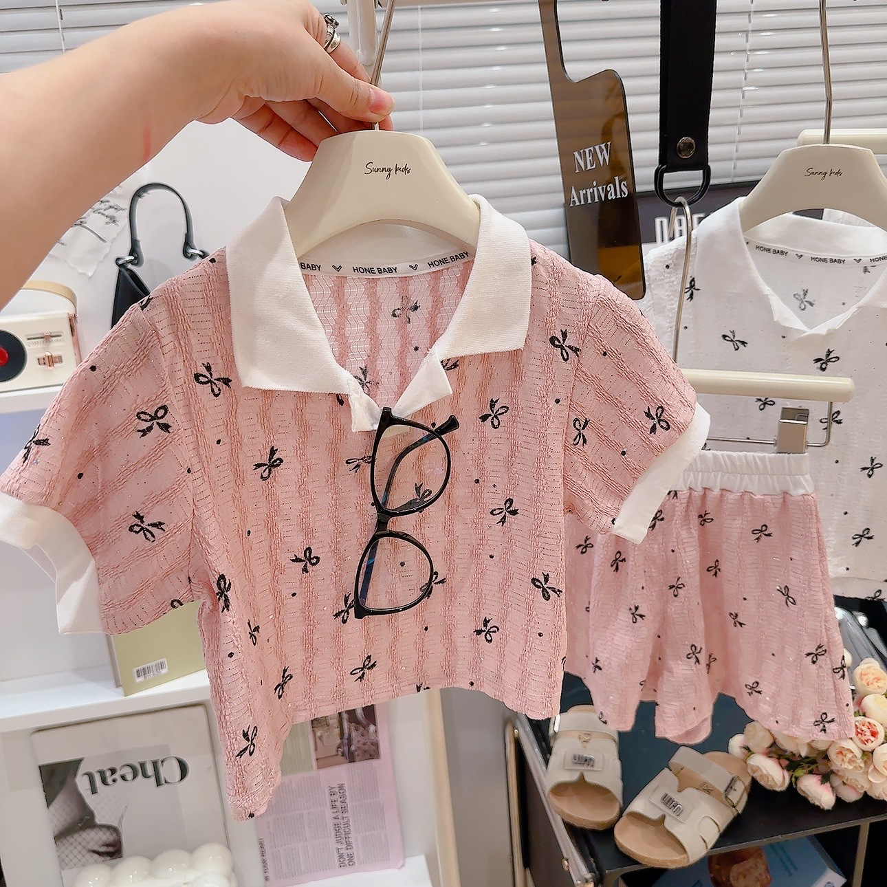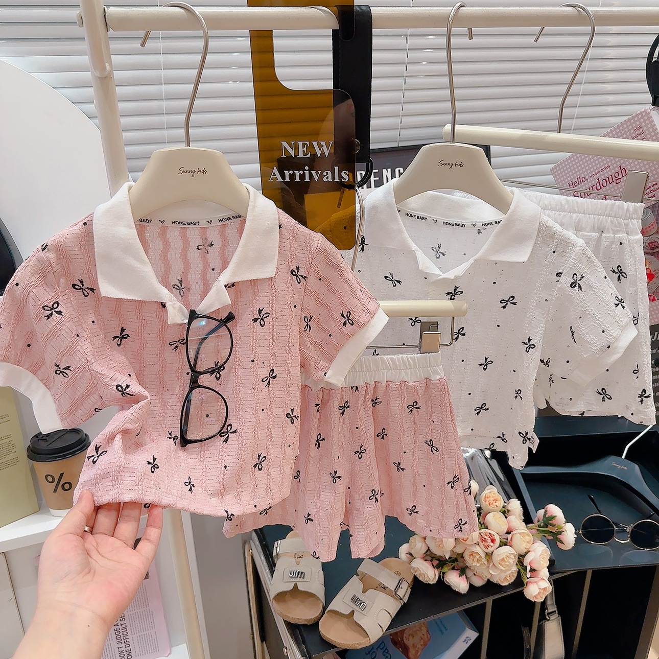 폴로 칼라 밑단 반팔 셔츠 반바지 여름 새 스타일 달콤한 아기 소녀 투피스 세트 패션 옷깃스토어 가기