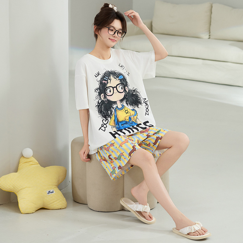 클래스 A 100% 면 여름 잠옷 여성 반팔 반바지 만화 정장 대형 캐주얼 여름 여성 홈웨어