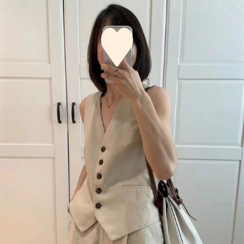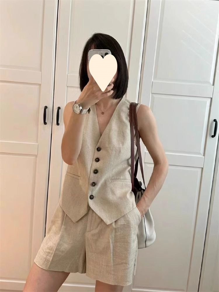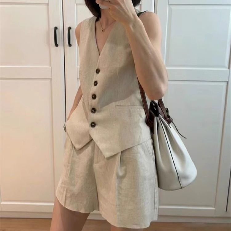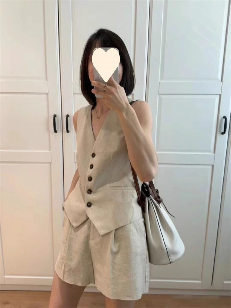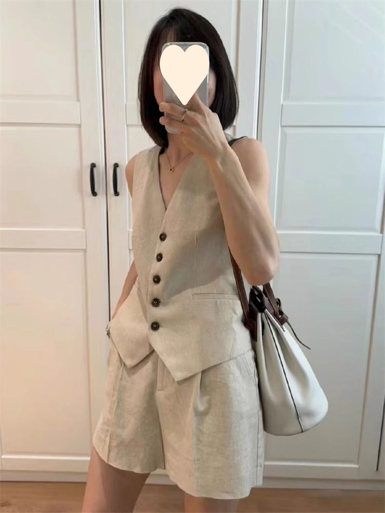 린넨 조끼 반바지 정장 여성 투피스 세트 2025 여름 새로운 기질 민소매 코튼 린넨 정장 조끼 재킷스토어 가기