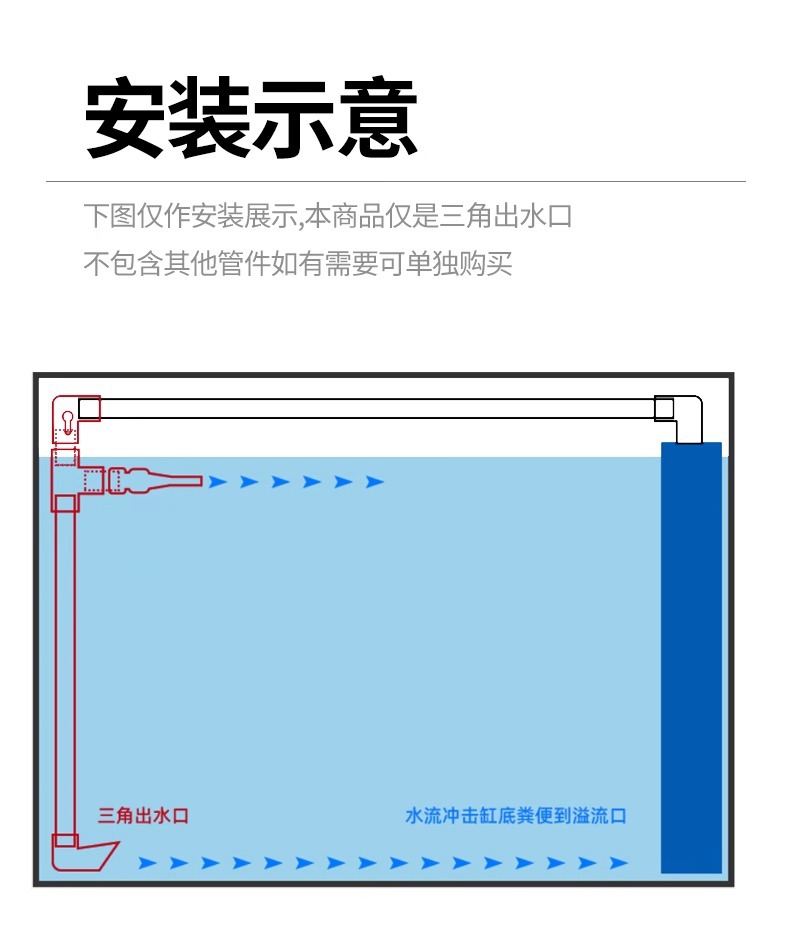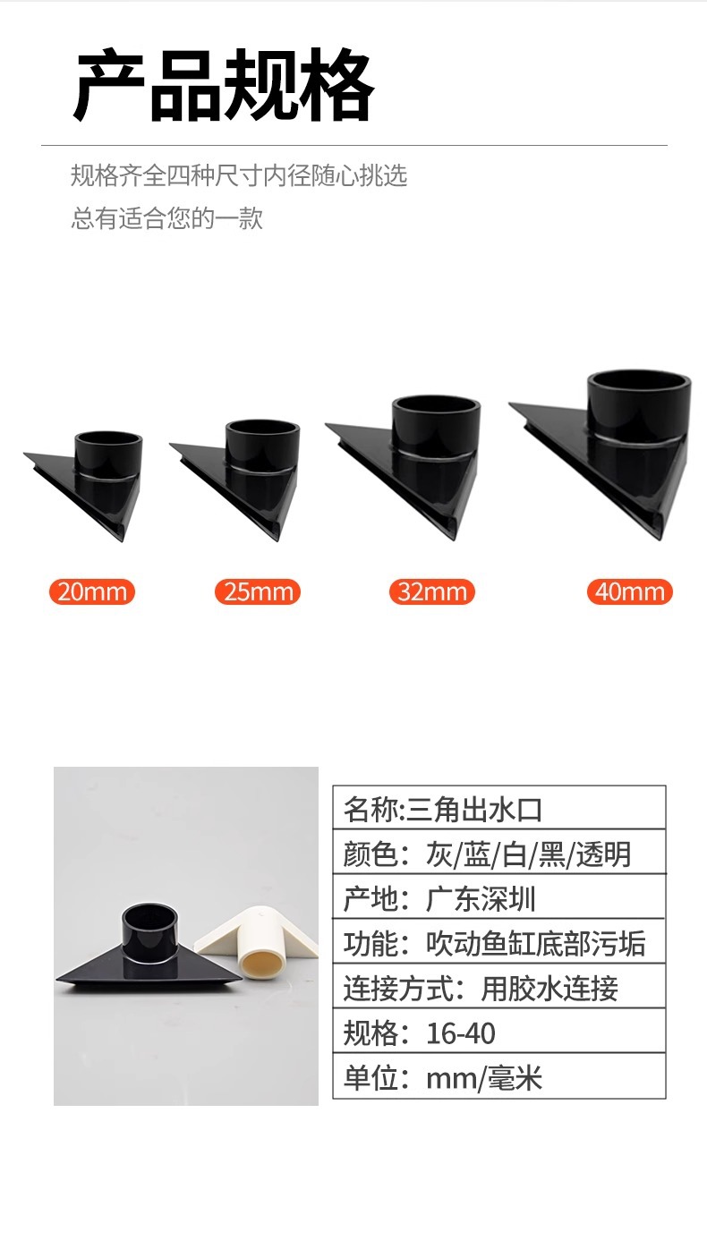물고기 탱크 투명한 물구 흡입구, 하단 삼각형 물구, 검정색 회색 PVC 물구, 수정된 하단 배설물 파이프 피팅스토어 가기