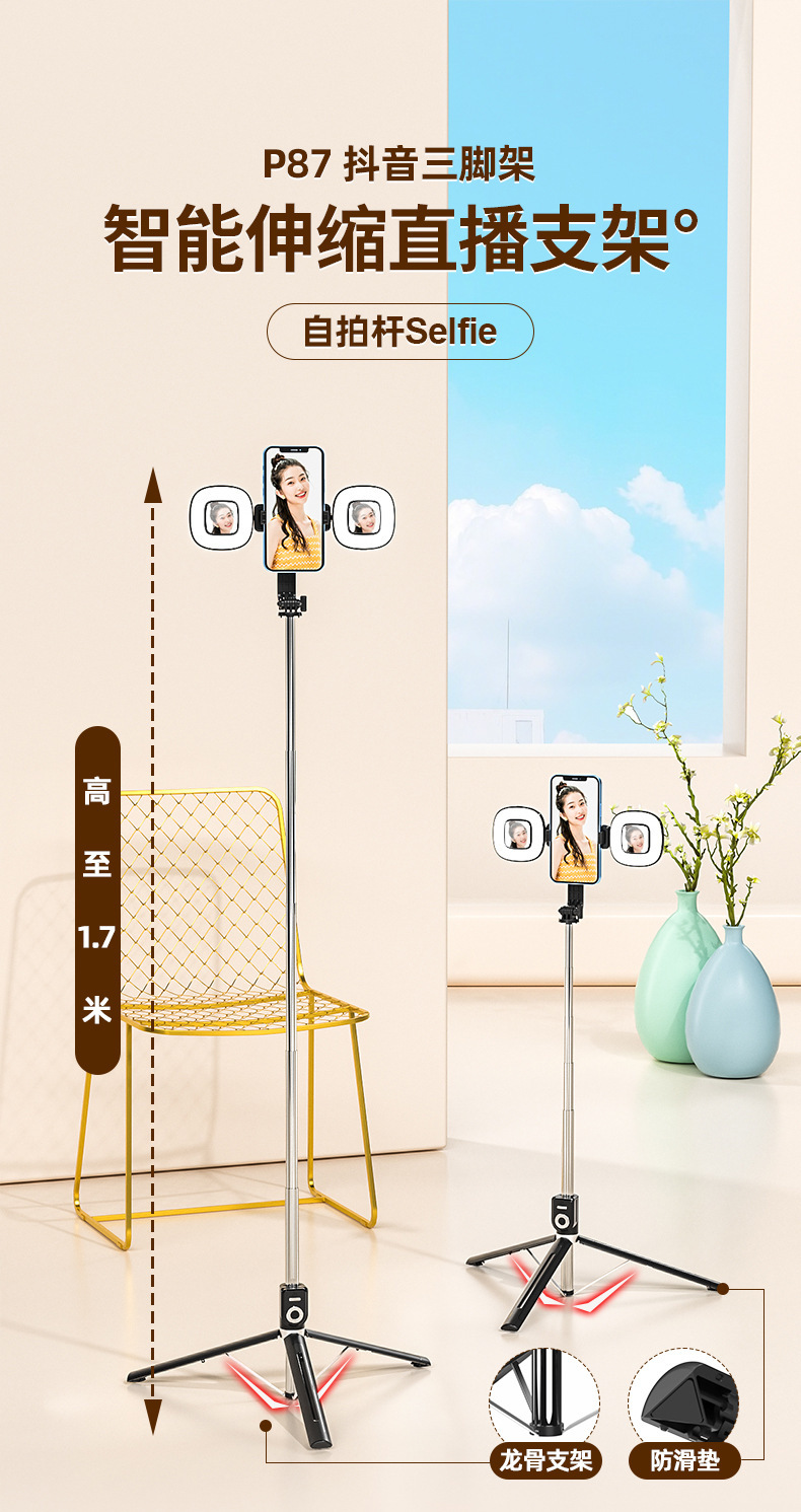 신제품 P87 셀카봉 블루투스 Douyin 원격 제어 휴대폰 라이브 삼각대 1.7m 스테인레스 스틸 셀카봉