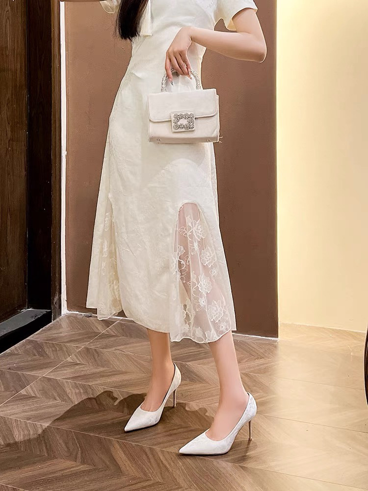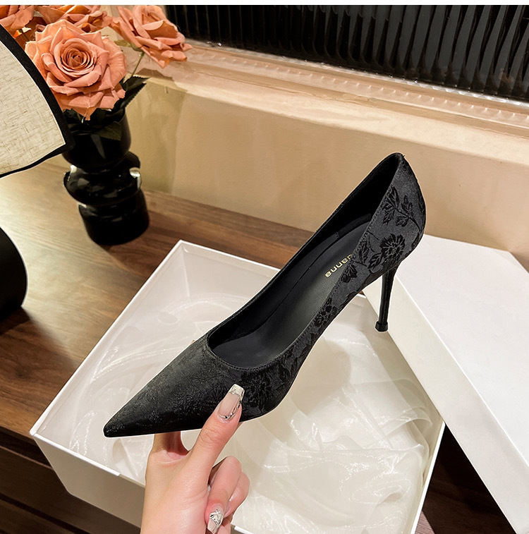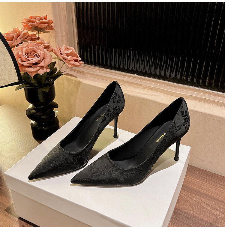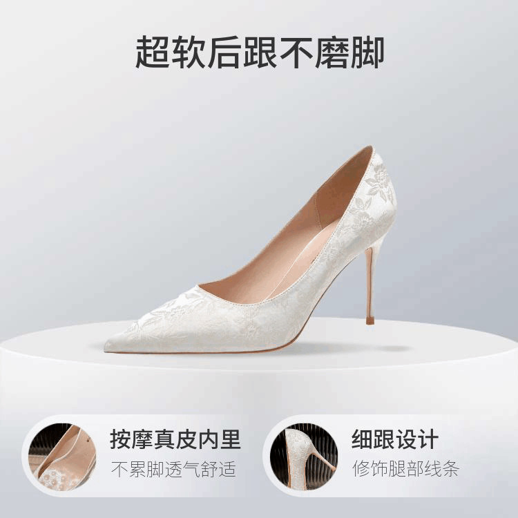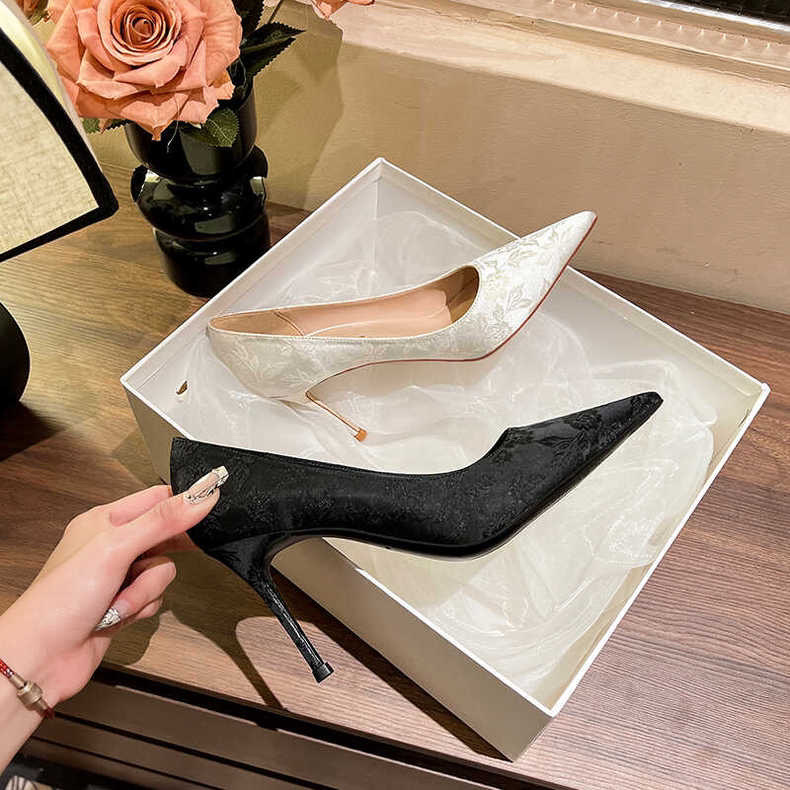 2024 새로운 중국 스타일의 자카드 새틴 아름다운 하이힐 여성용 스틸레토 힐 피곤하지 않은 흰색 뾰족한 신발스토어 가기