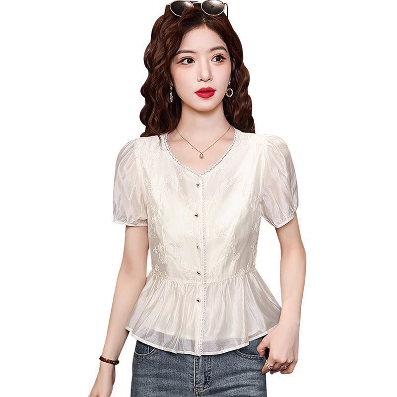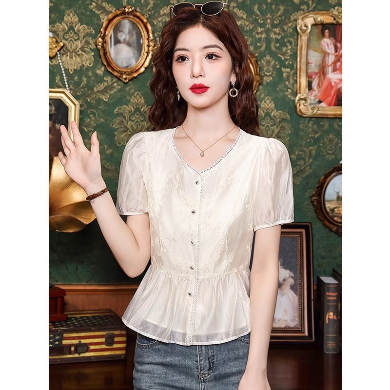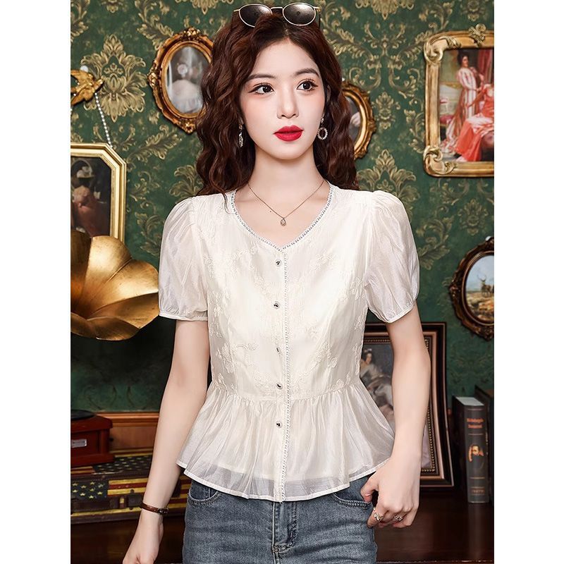 여름 여성을 위한 하이엔드 텐셀 자수 반팔 셔츠, 허리를 조이고 배를 커버하는 쉬폰 셔츠, 시크한 프렌치 스커트 탑스토어 가기