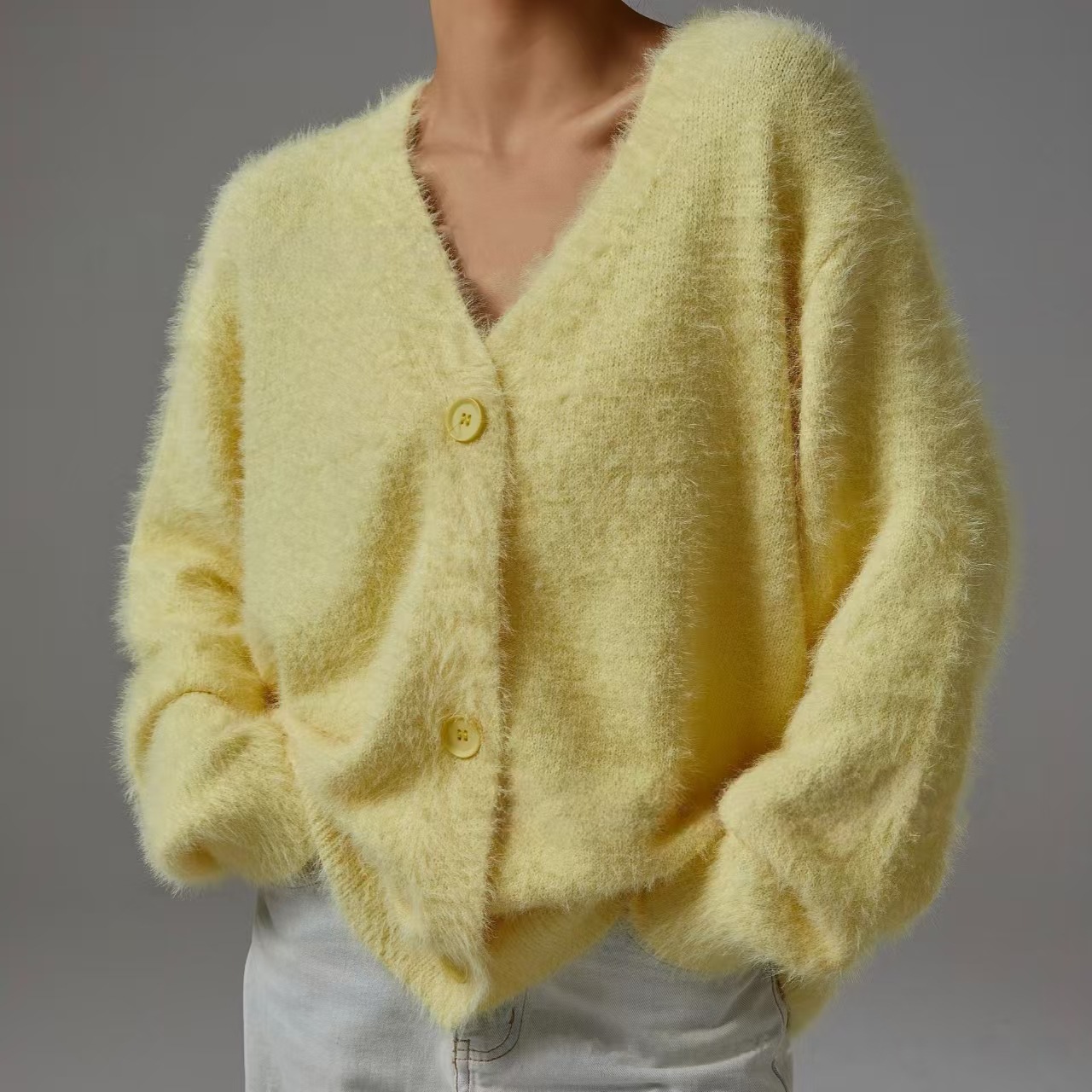 유럽 및 미국 스타일 크로스보더 니트 스웨터 긴팔 2025 가을 겨울 신상 루즈핏 캐주얼 솔리드 컬러 브이넥 가디건 상의스토어 가기