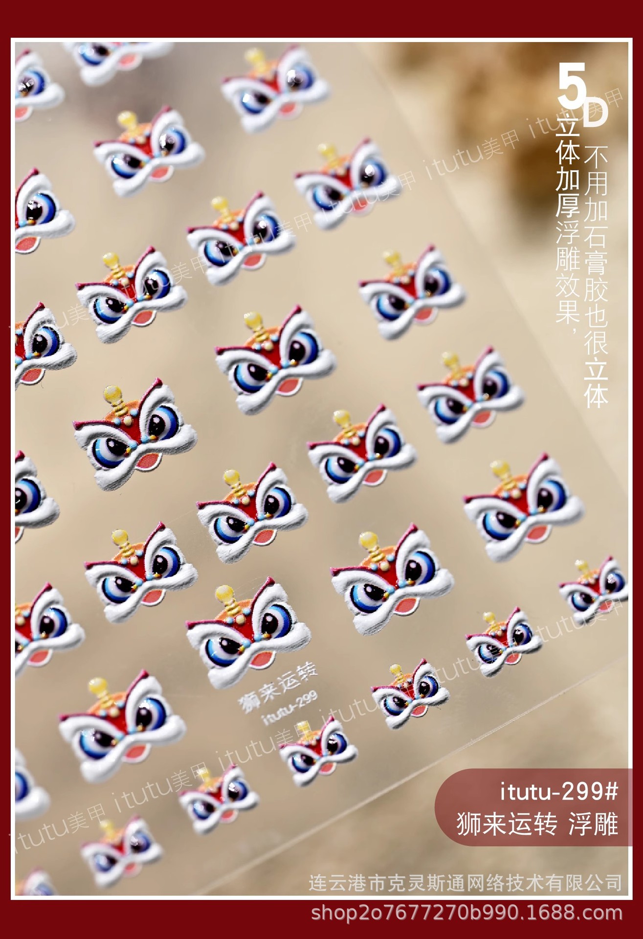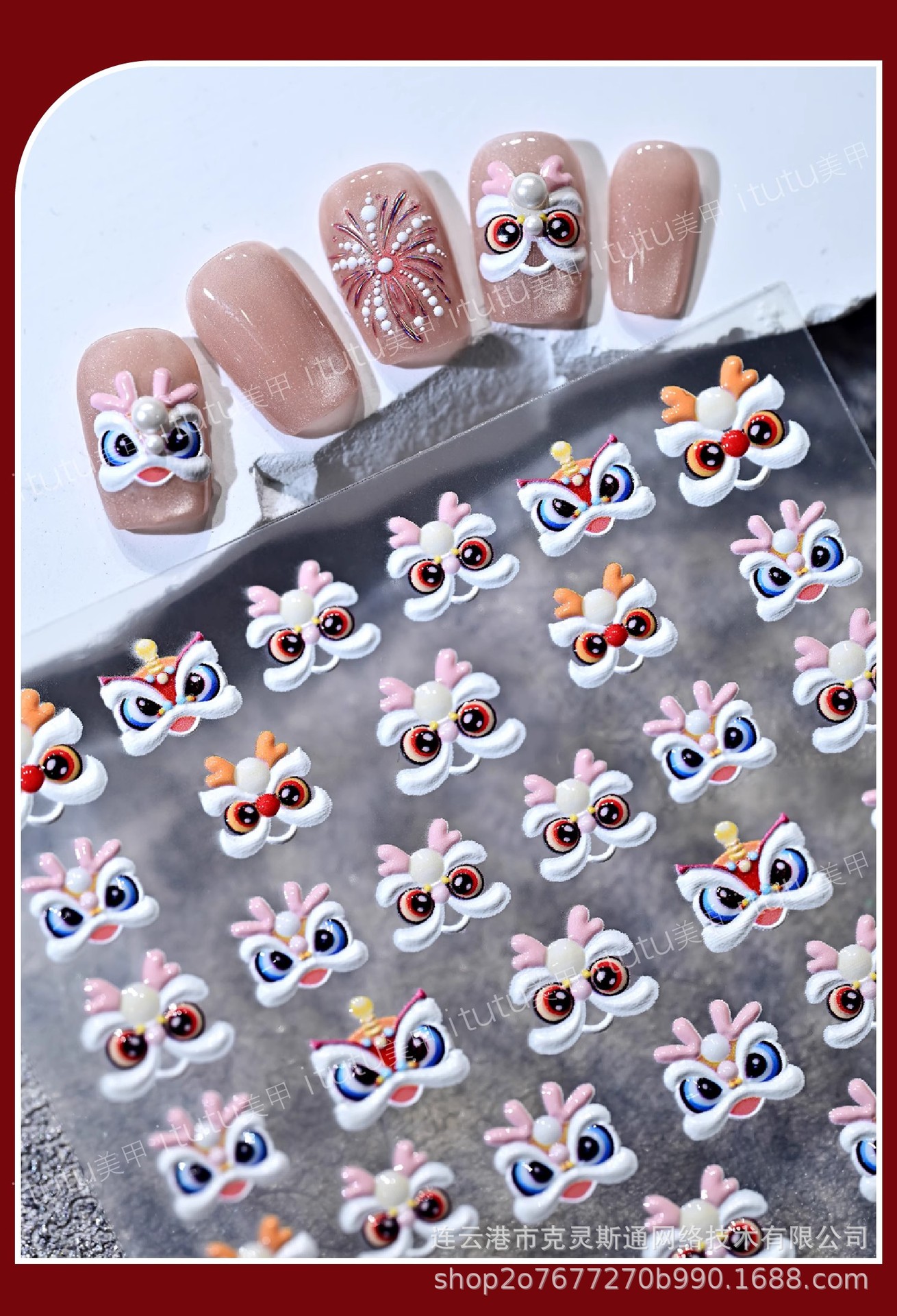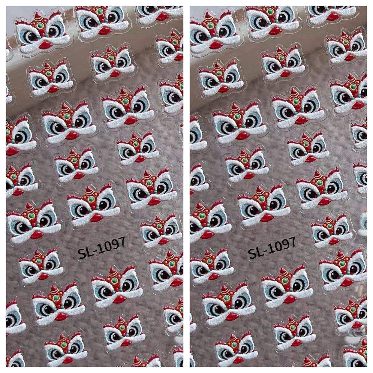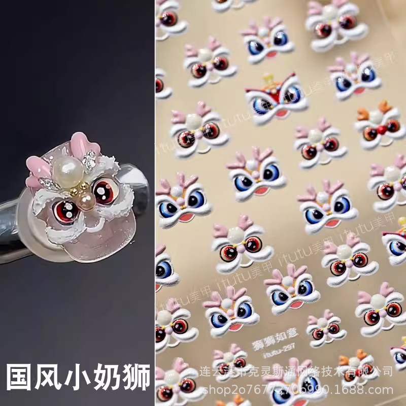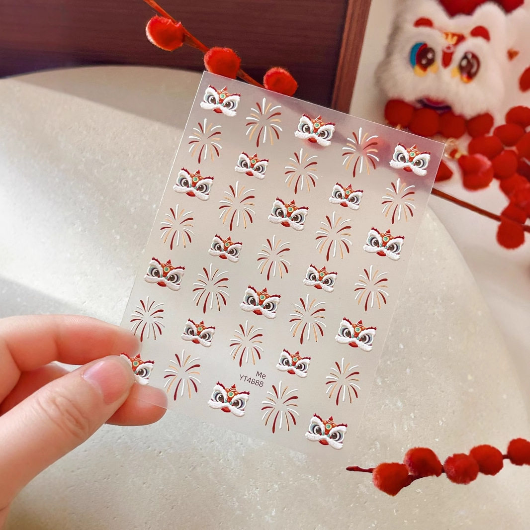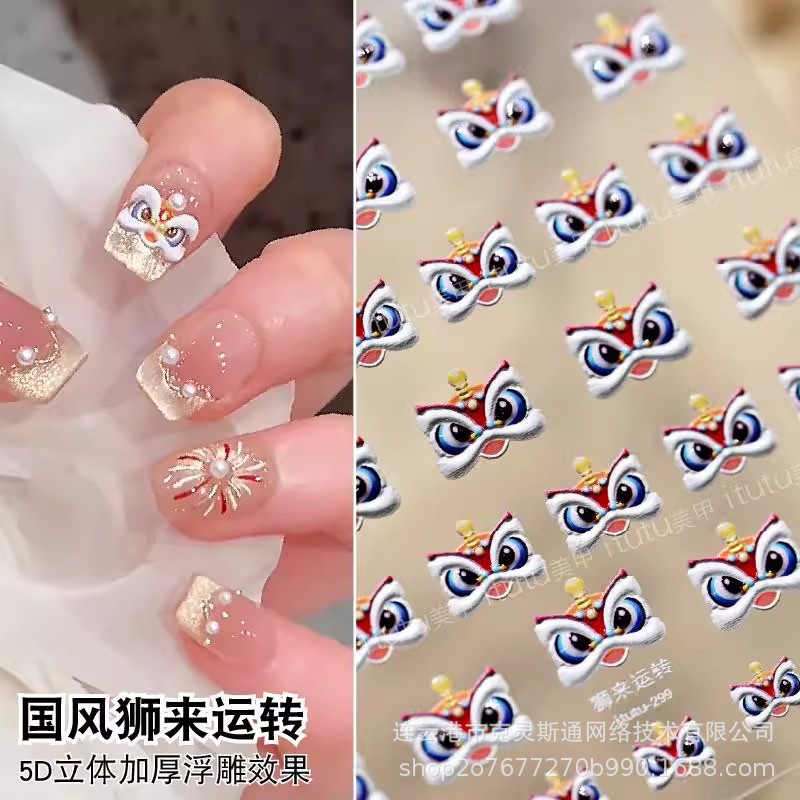2025 신년 중국 스타일 작은 깨어난 사자 귀여운 네일 아트 스티커 행운의 사자 춤 양각 네일 장식스토어 가기