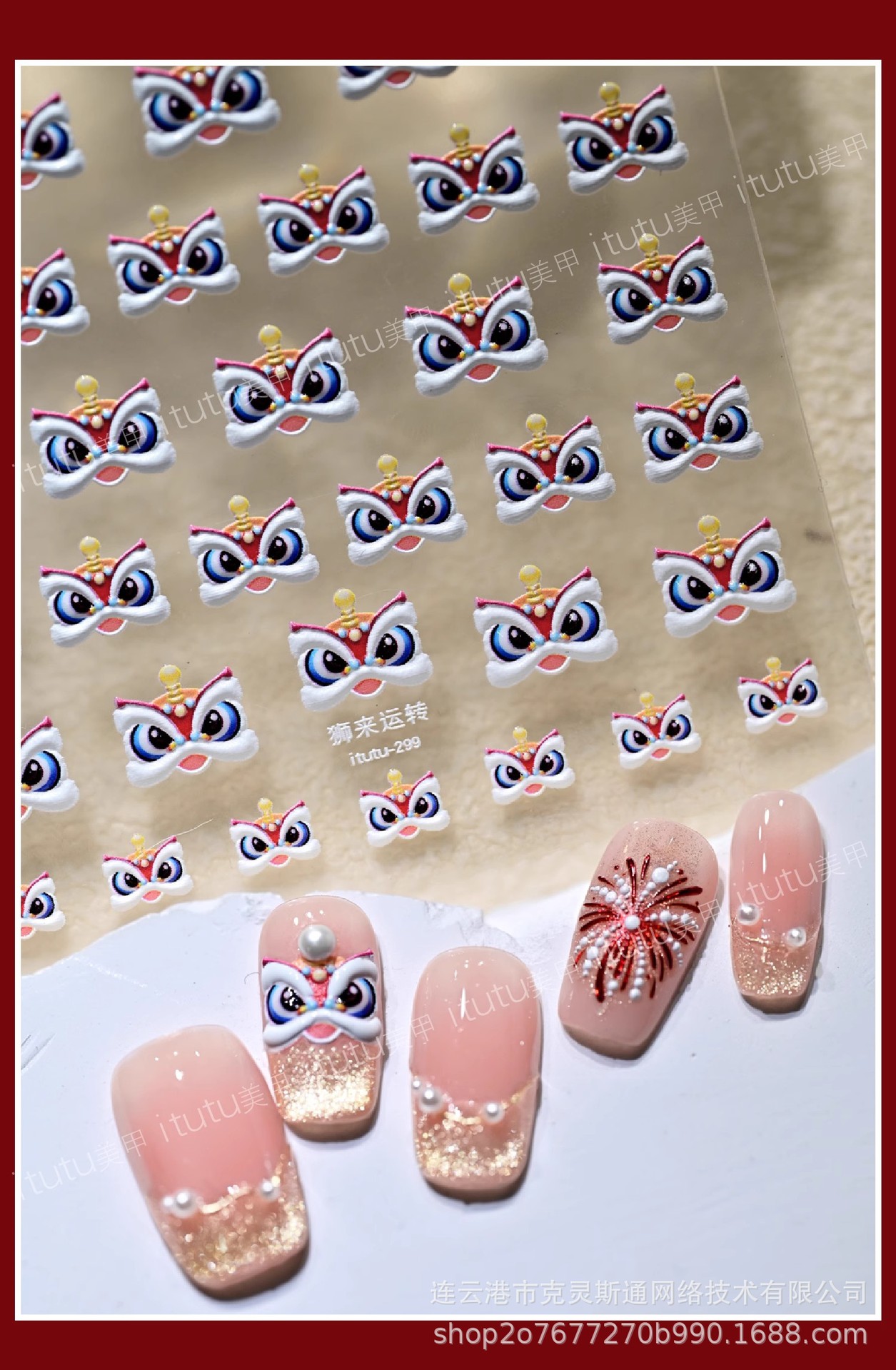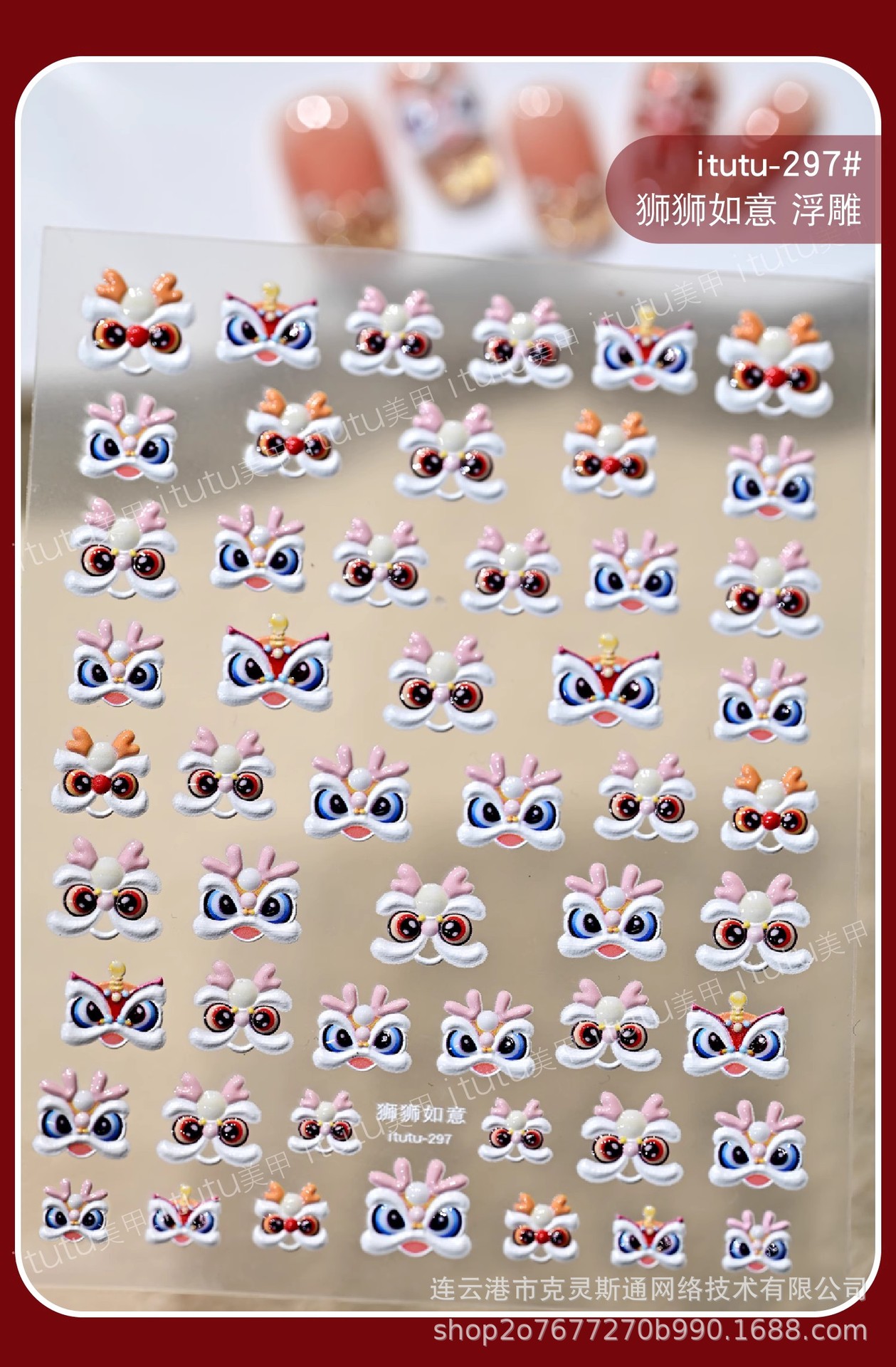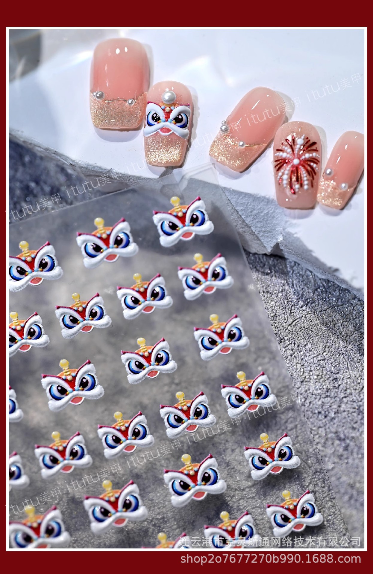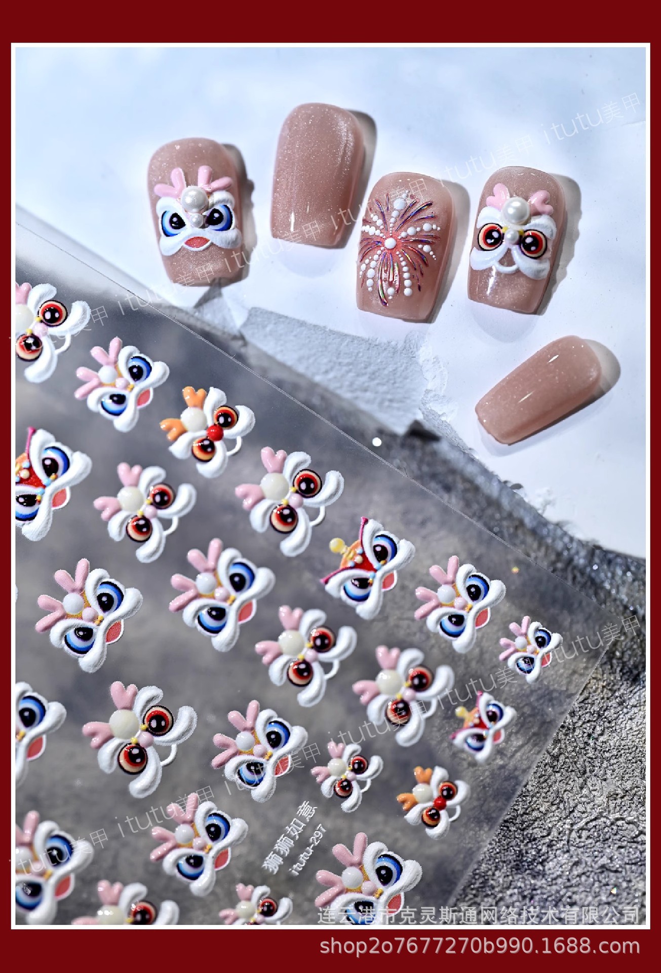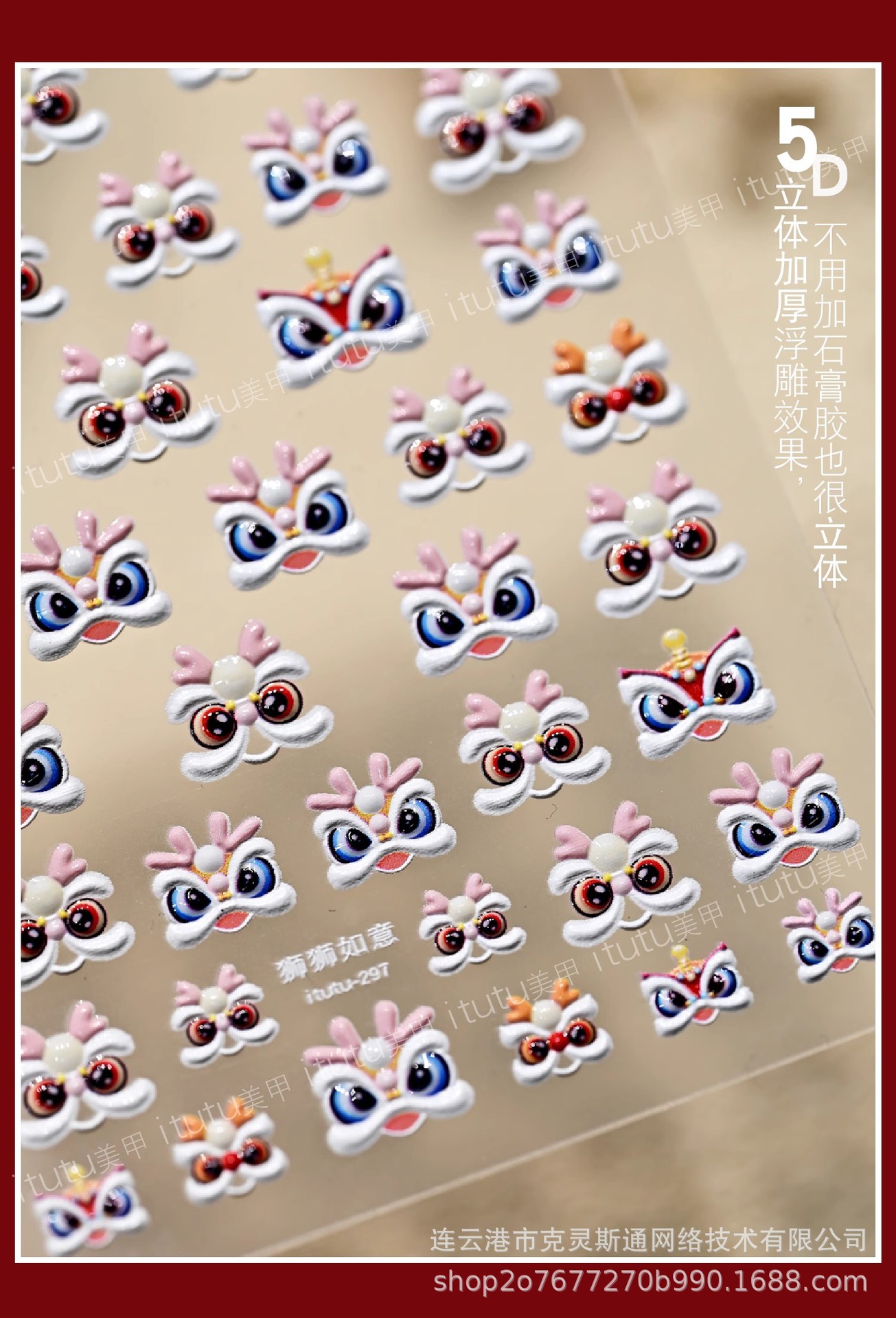2025 신년 중국 스타일 작은 깨어난 사자 귀여운 네일 아트 스티커 행운의 사자 춤 양각 네일 장식스토어 가기