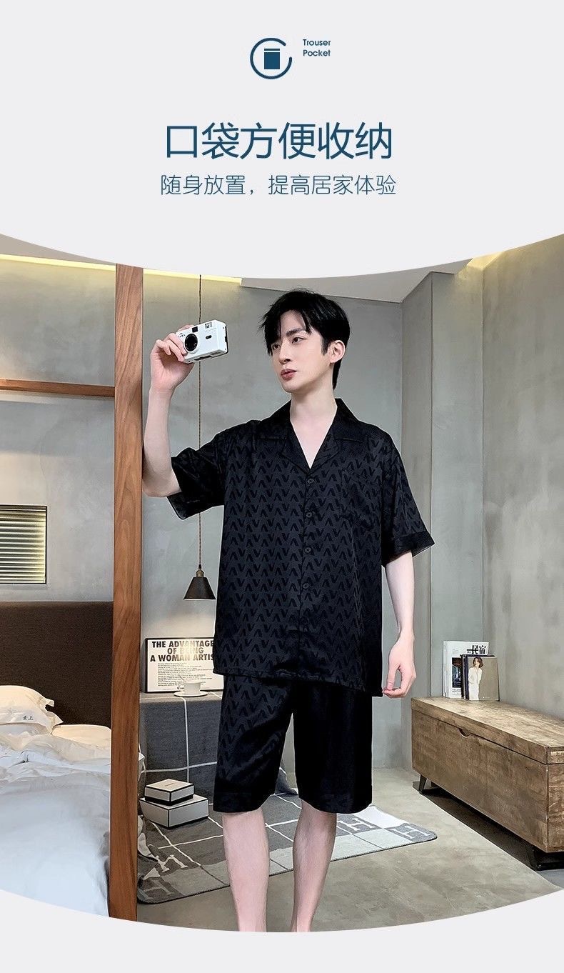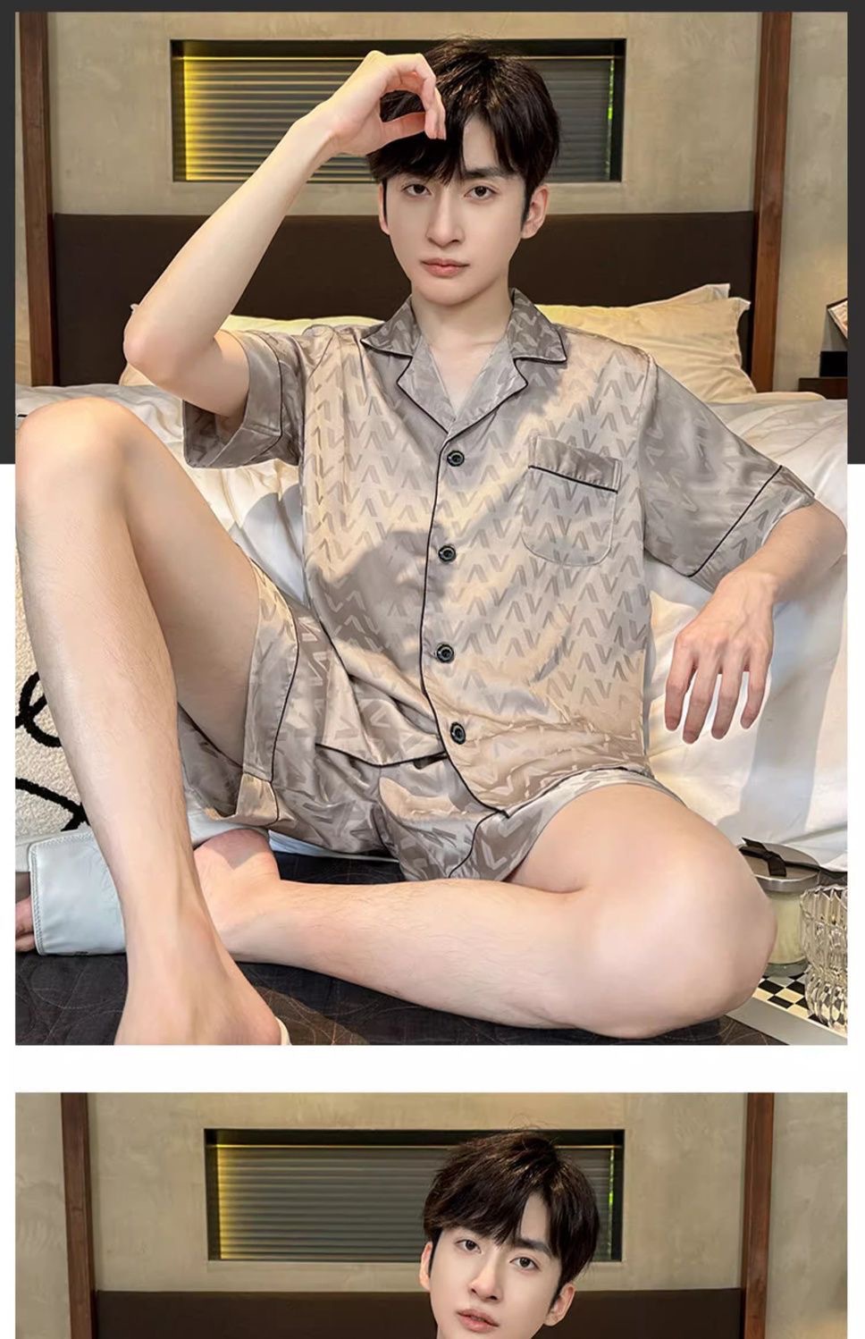새로운 잠옷 남자 여름 얼음 실크 반팔 얇은 느슨한 청소년 잘 생긴 새로운 남자 잠옷 여름 홈 세트