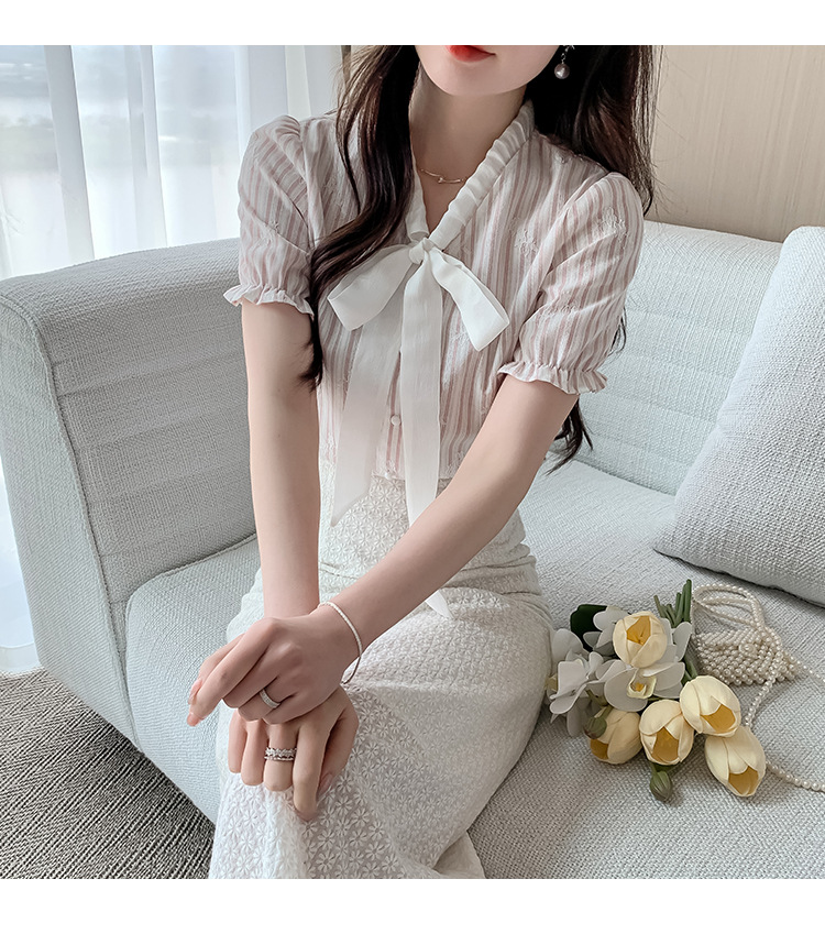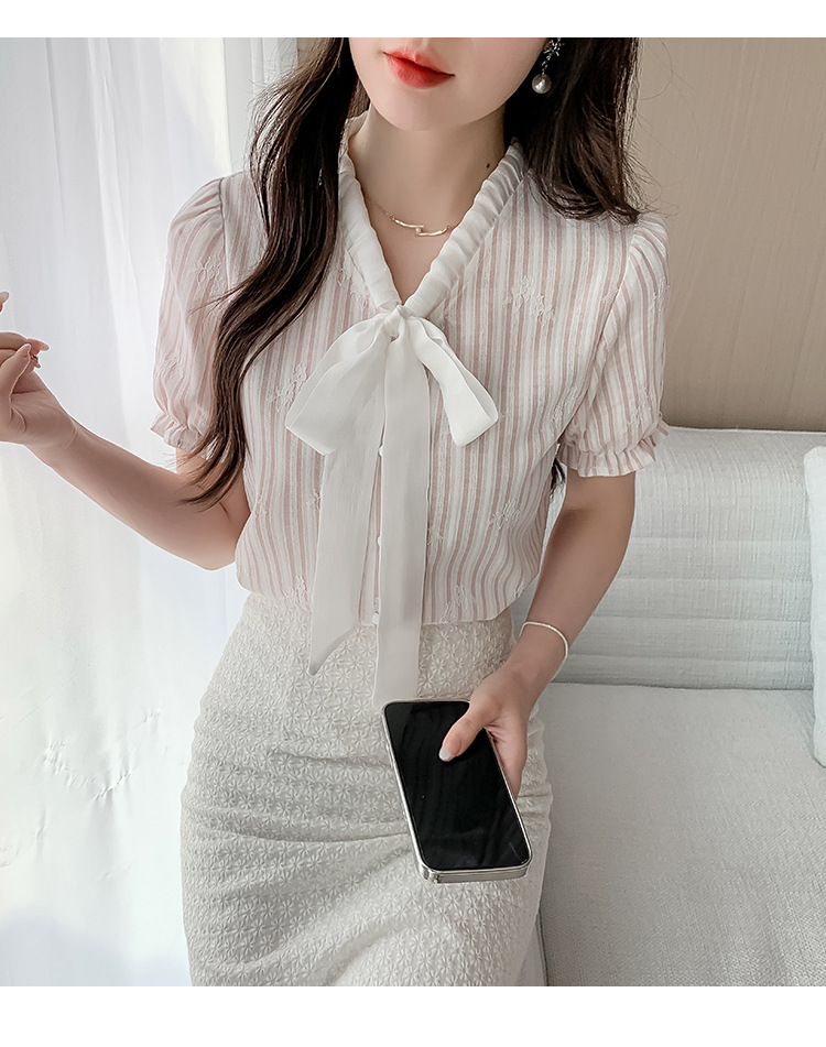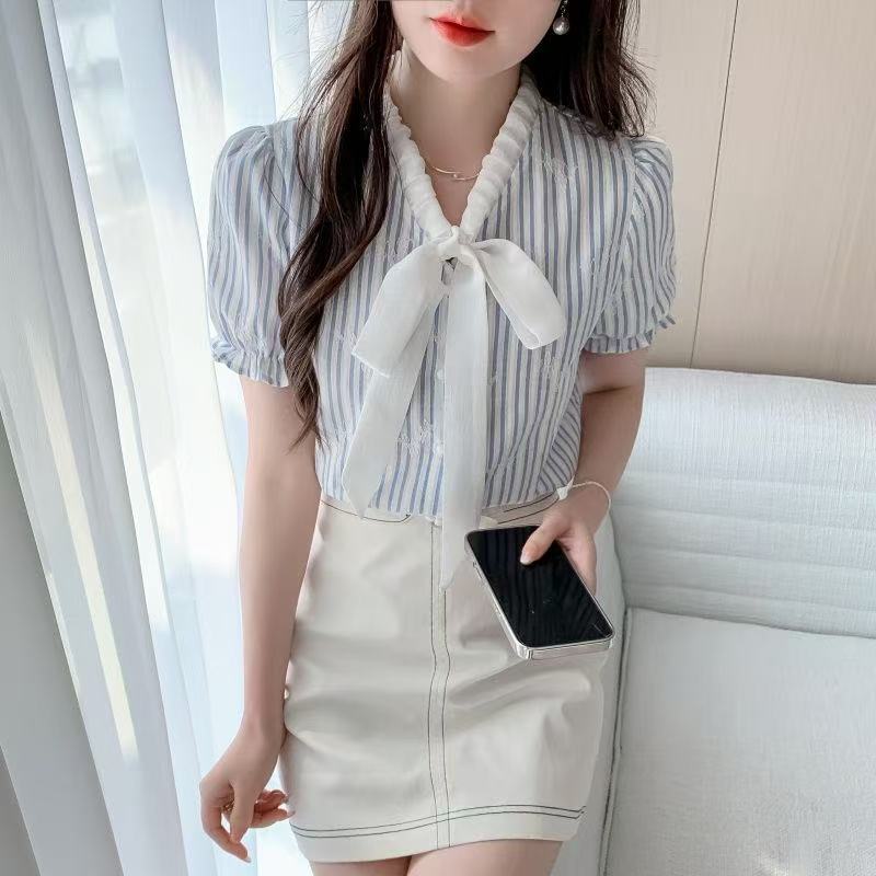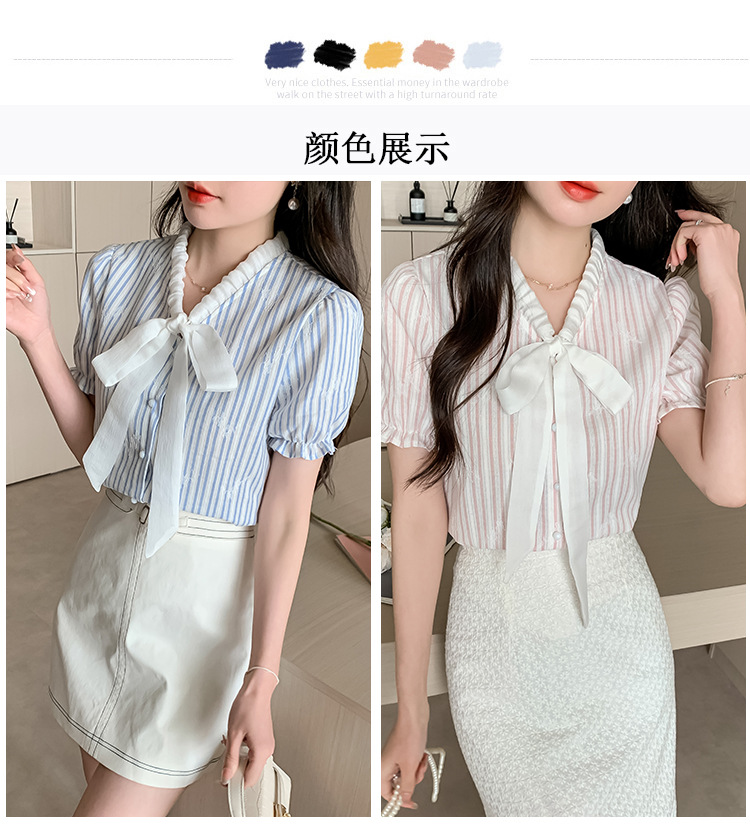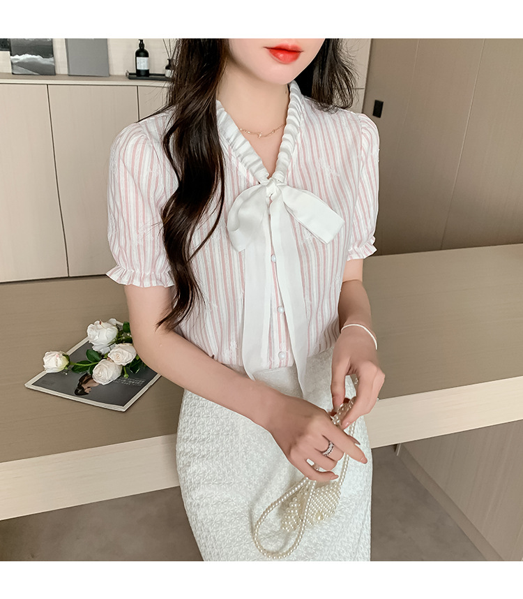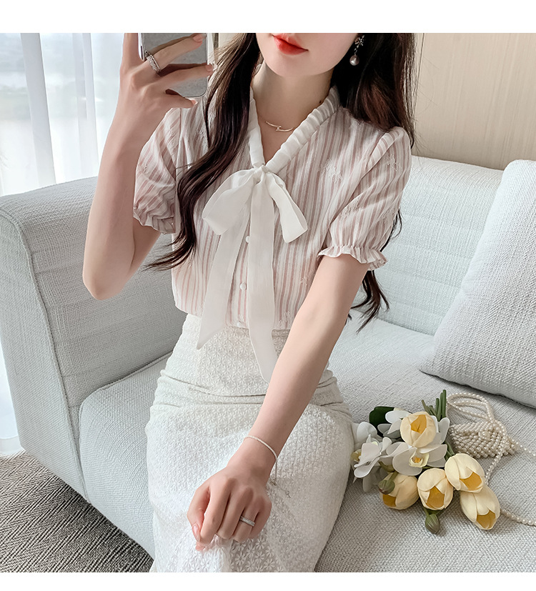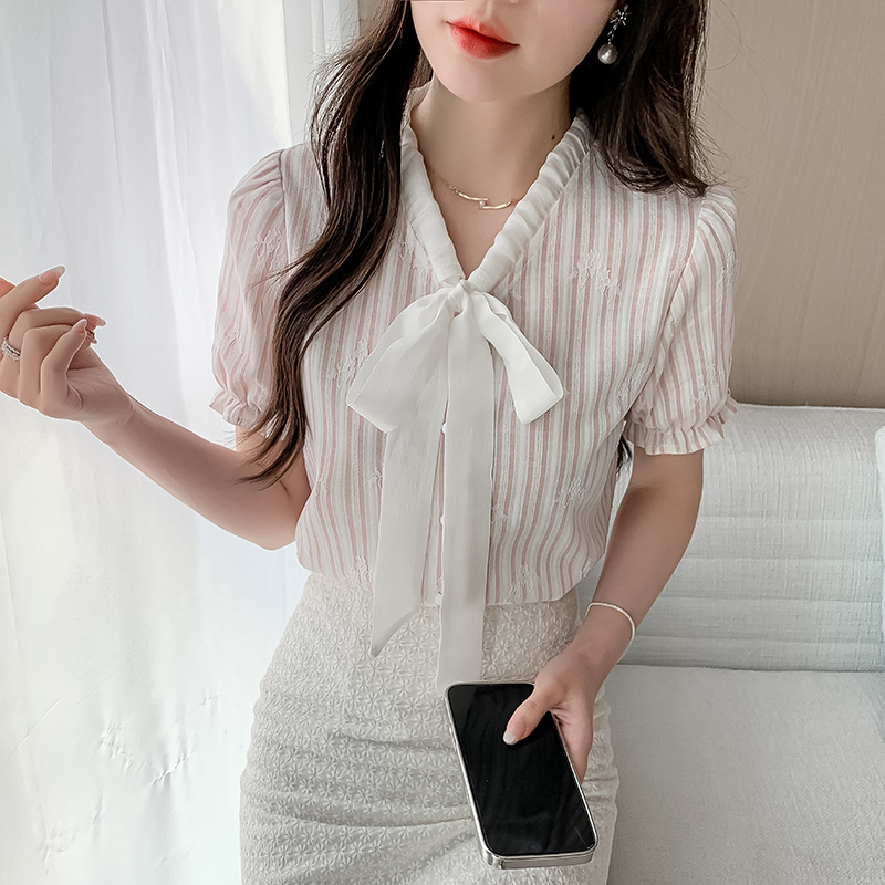 여성 여름 고급 감성 연령 감소 패션 새로운 쉬폰 전문 리본 셔츠 기질 탑 셔츠 여성 여름 트렌드스토어 가기