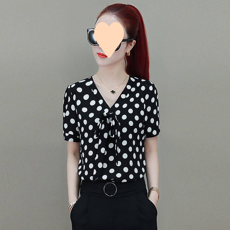 • 2053 폴카 도트 쉬폰 블랙 반소매